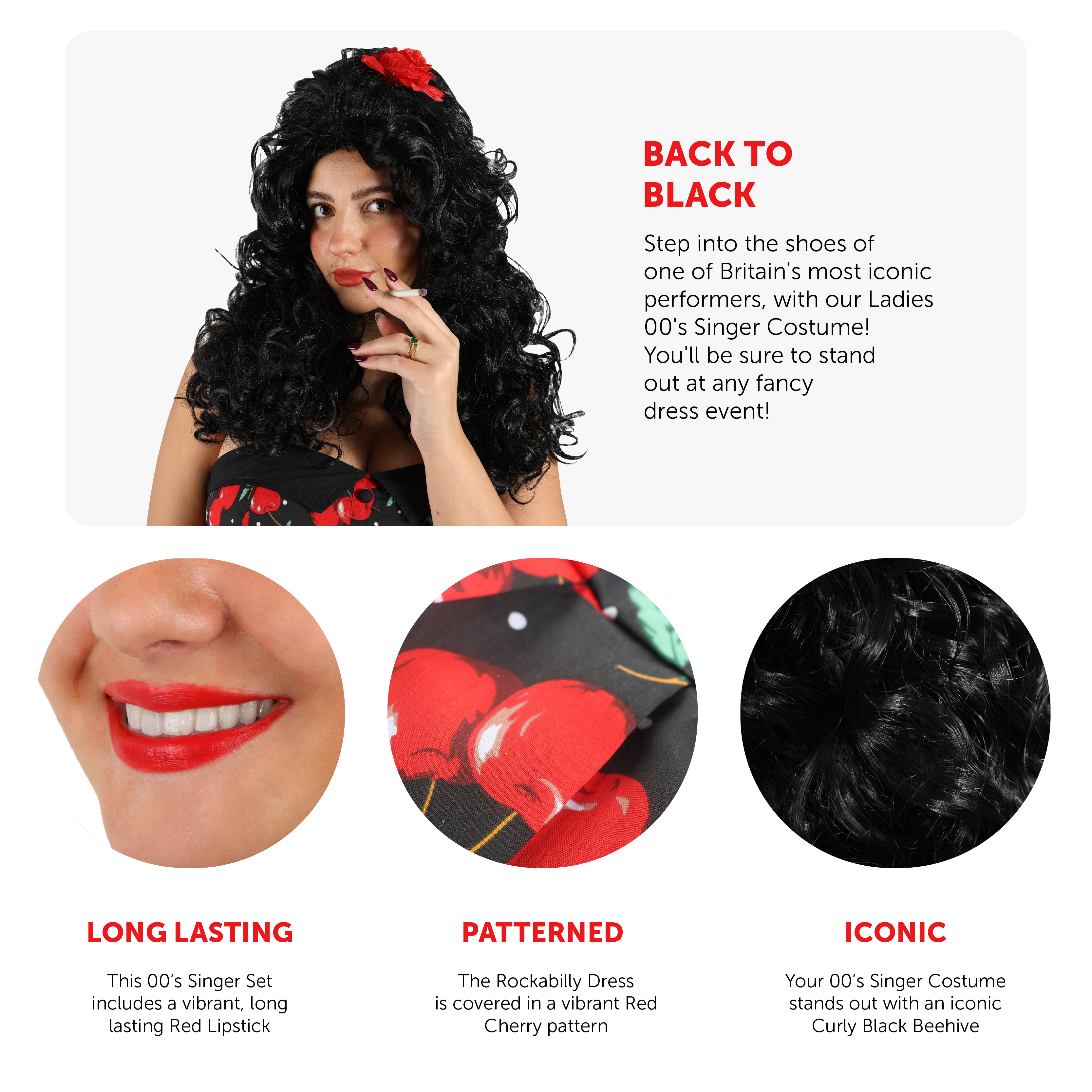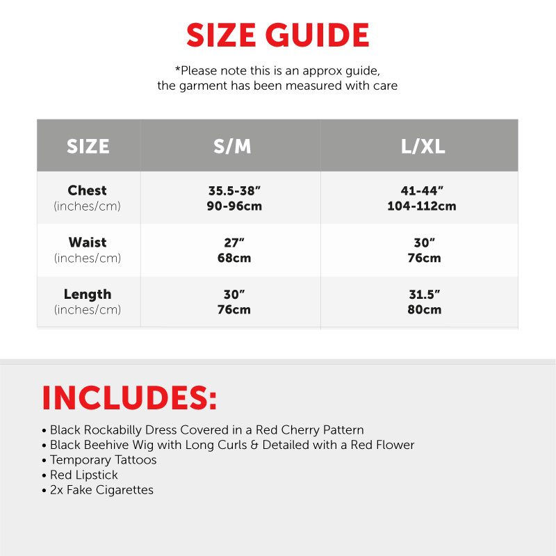 COSTUME INCLUDES: This Ladies 00's Singer Costume includes a glamorous looking Long Curly Black Wig, styled into a stand out Beehive and detailed with a Red Flower, a Black Rockabilly style Dress with Red Cherry pattern, easy to apply Temporary Tattoos, 2x Fake Cigarettes, and long lasting Red Lipstick, the perfect addition to your music themed fancy dress costume!