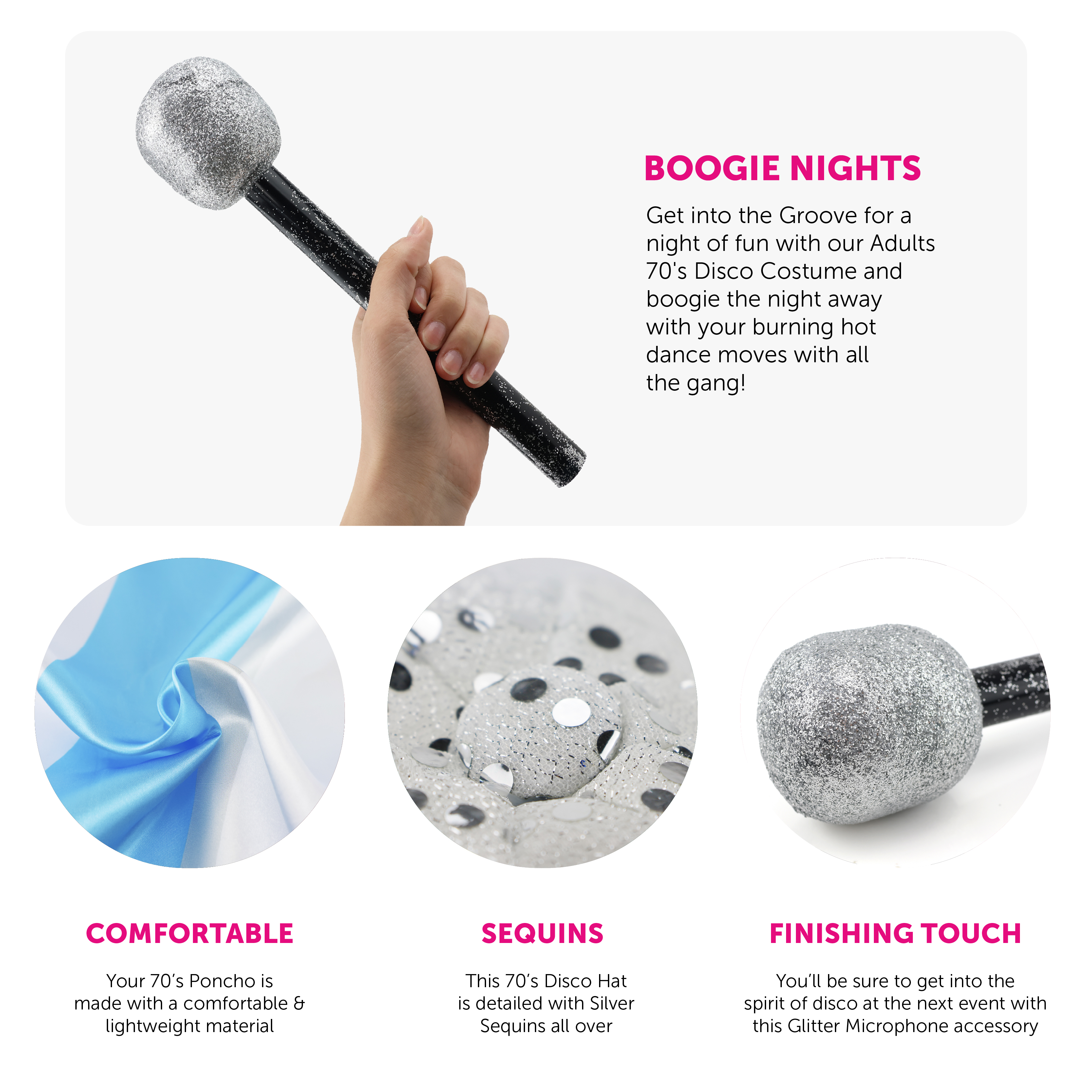 Adults 70's Pop Poncho with Silver Microphone & 70's Sequin Disco Hat – Eurovision Ready, Retro Satin Outfit   £15.99