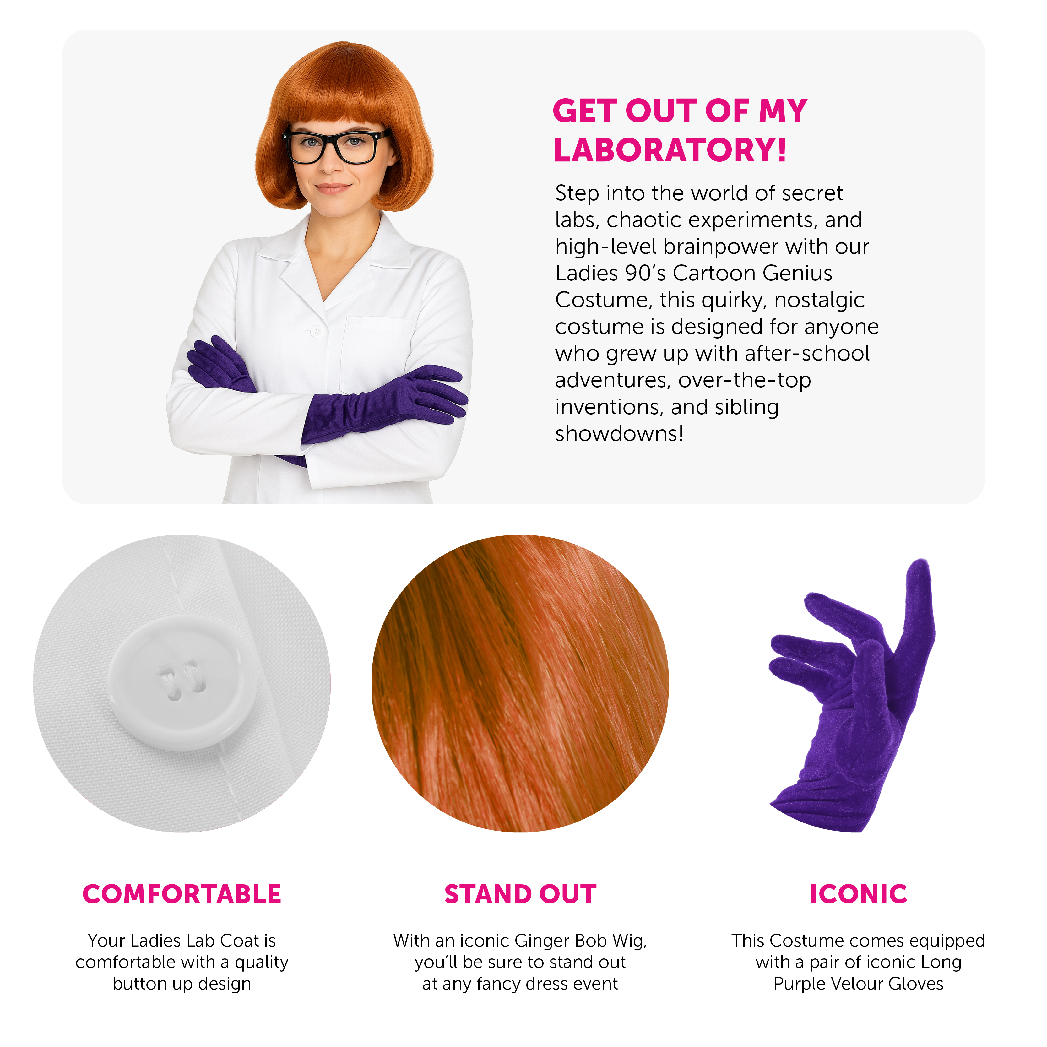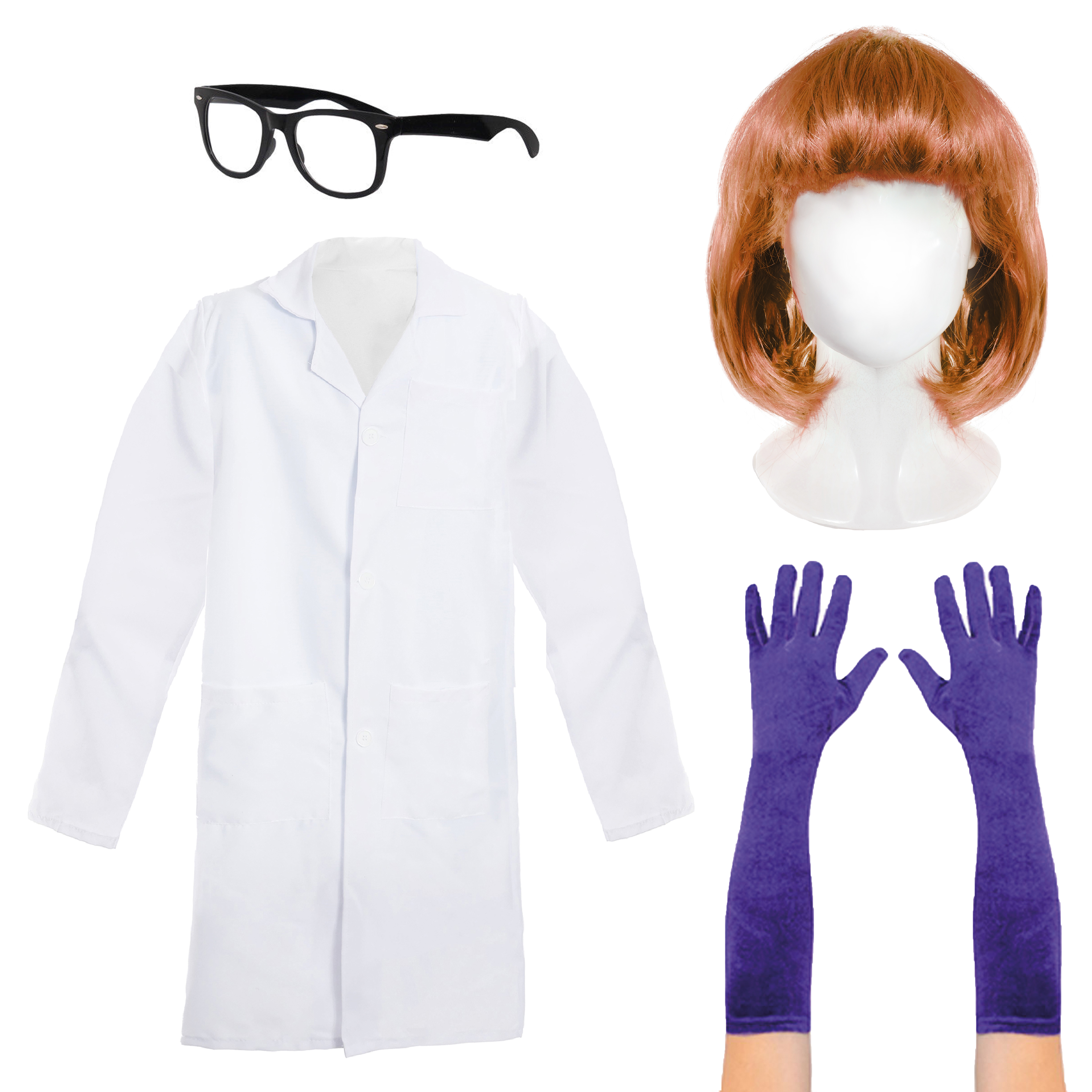 COSTUME DETAILS: The Ladies 90's Cartoon Genius Costume Set includes a Ginger Bob Wig, a Long White Lab Coat with Button fastening, Black Geek Glasses, and a pair of Long Purple Velour Gloves, the perfect look for any fancy dress event!