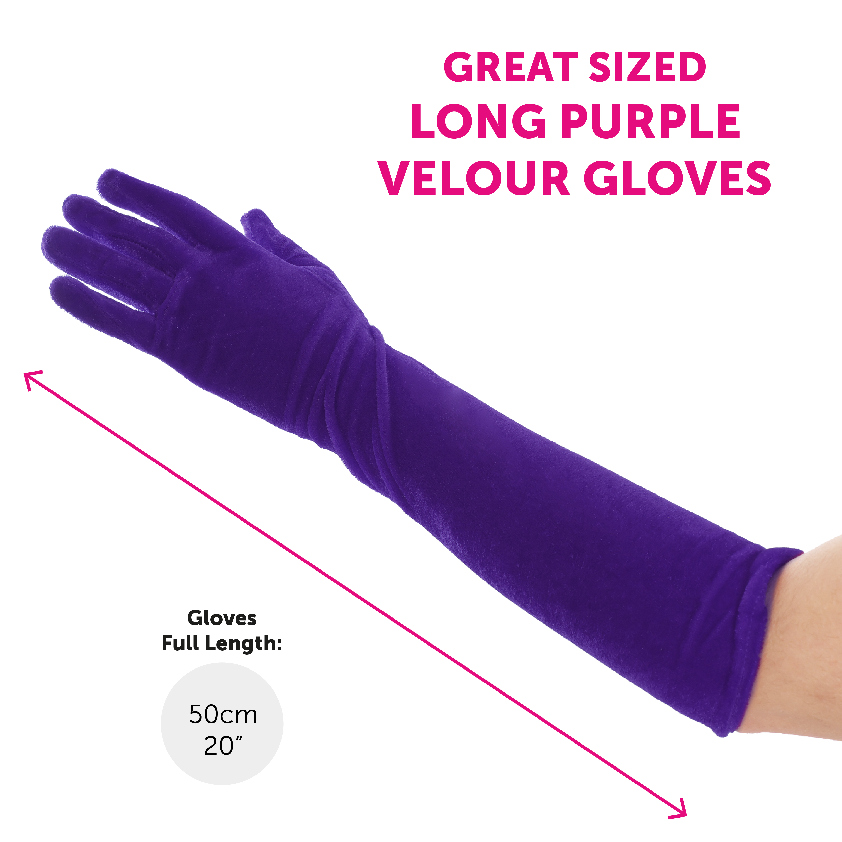 GREAT SIZED ACCESSORIES: The Purple Velour Gloves are one size, fitting most Adults comfortably! The Gloves measure a length of 50cm (20”), the perfect Costume accessory for any event!