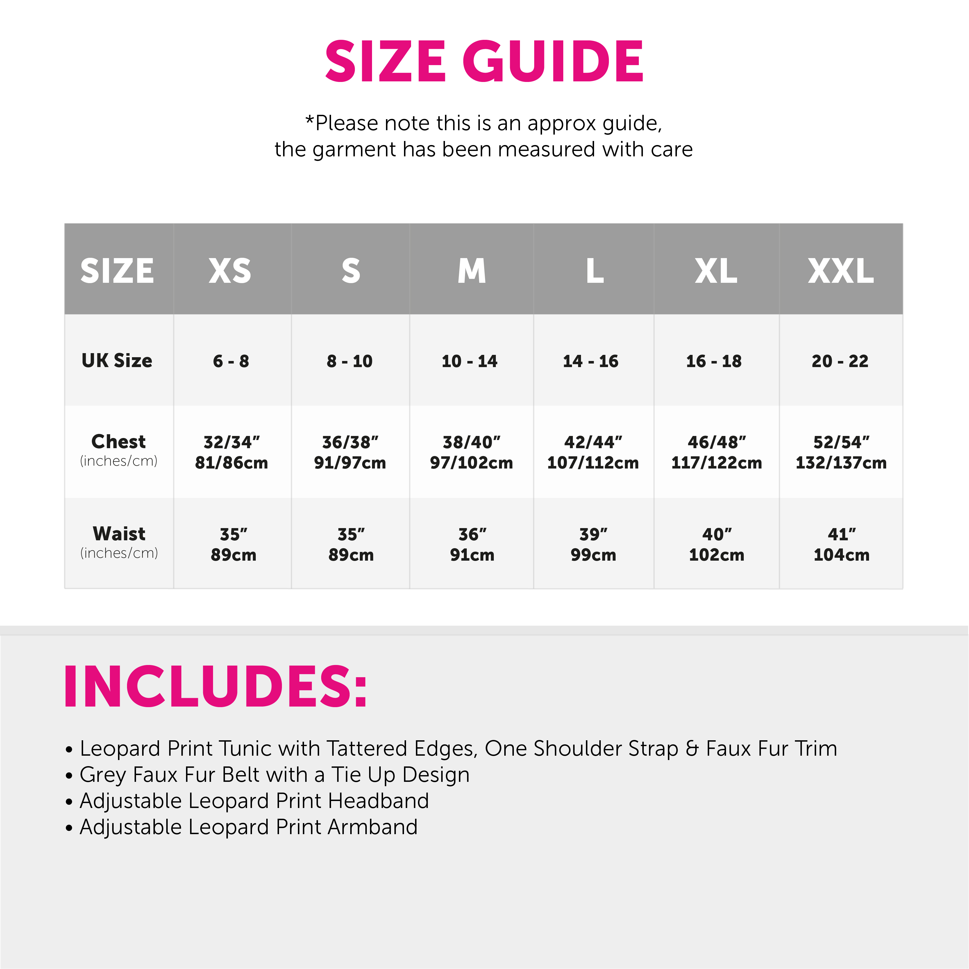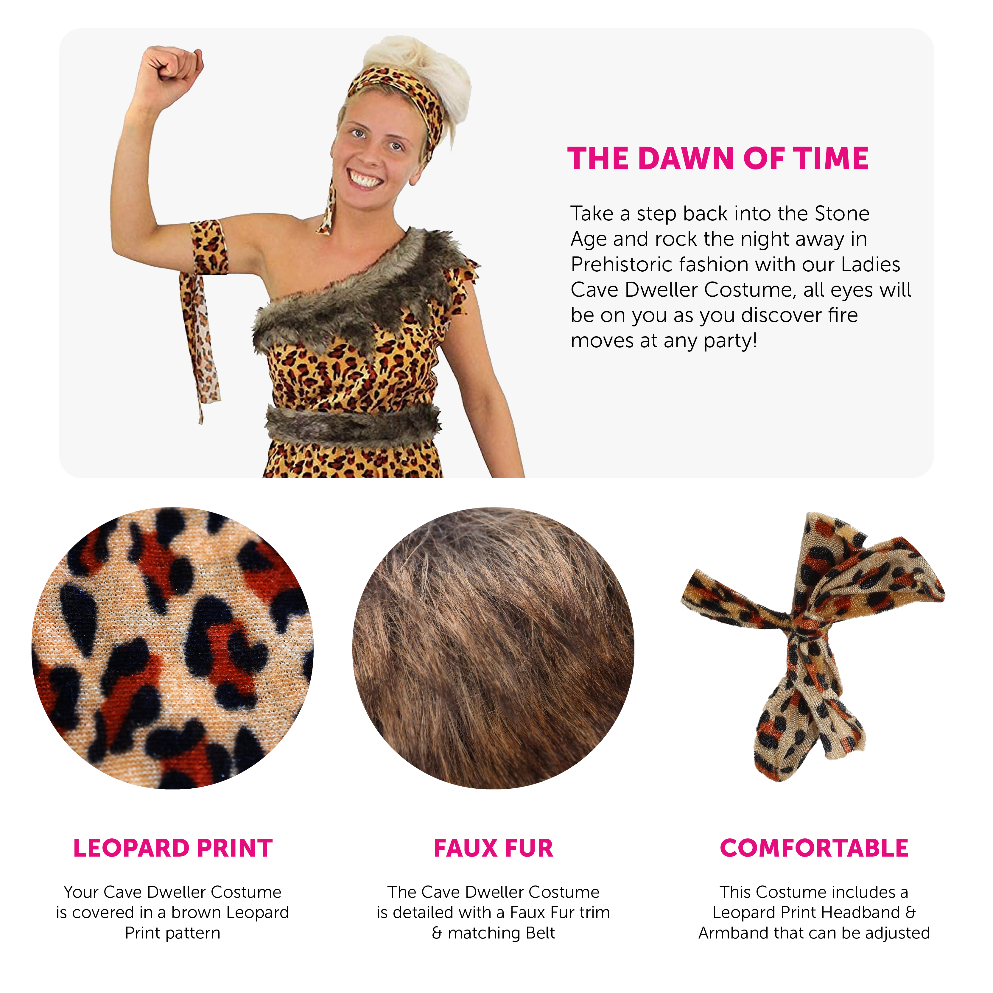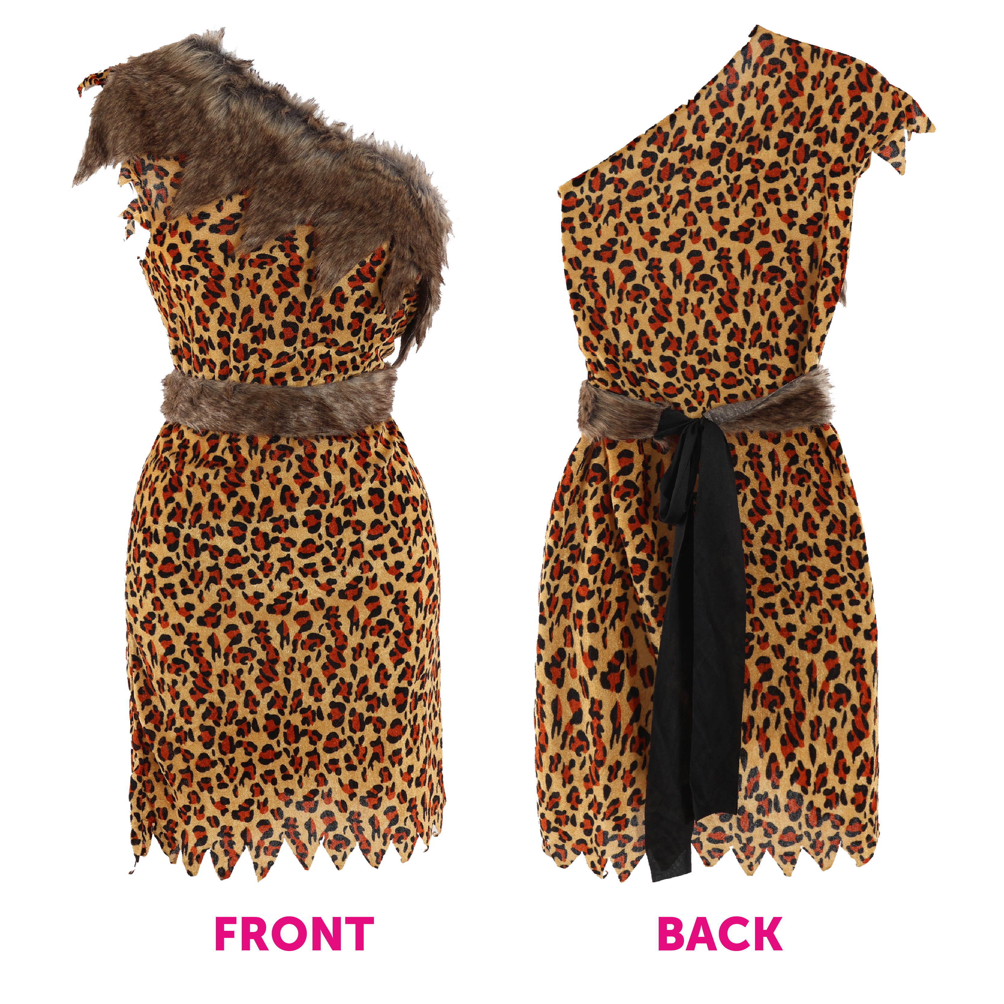 COSTUME DETAILS: This Adults Cave Dweller Costume is a tattered edge Leopard Print Tunic with one shoulder strap, Grey Faux Fur trim and a Belt, a matching Leopard Print Headband and matching Armband!