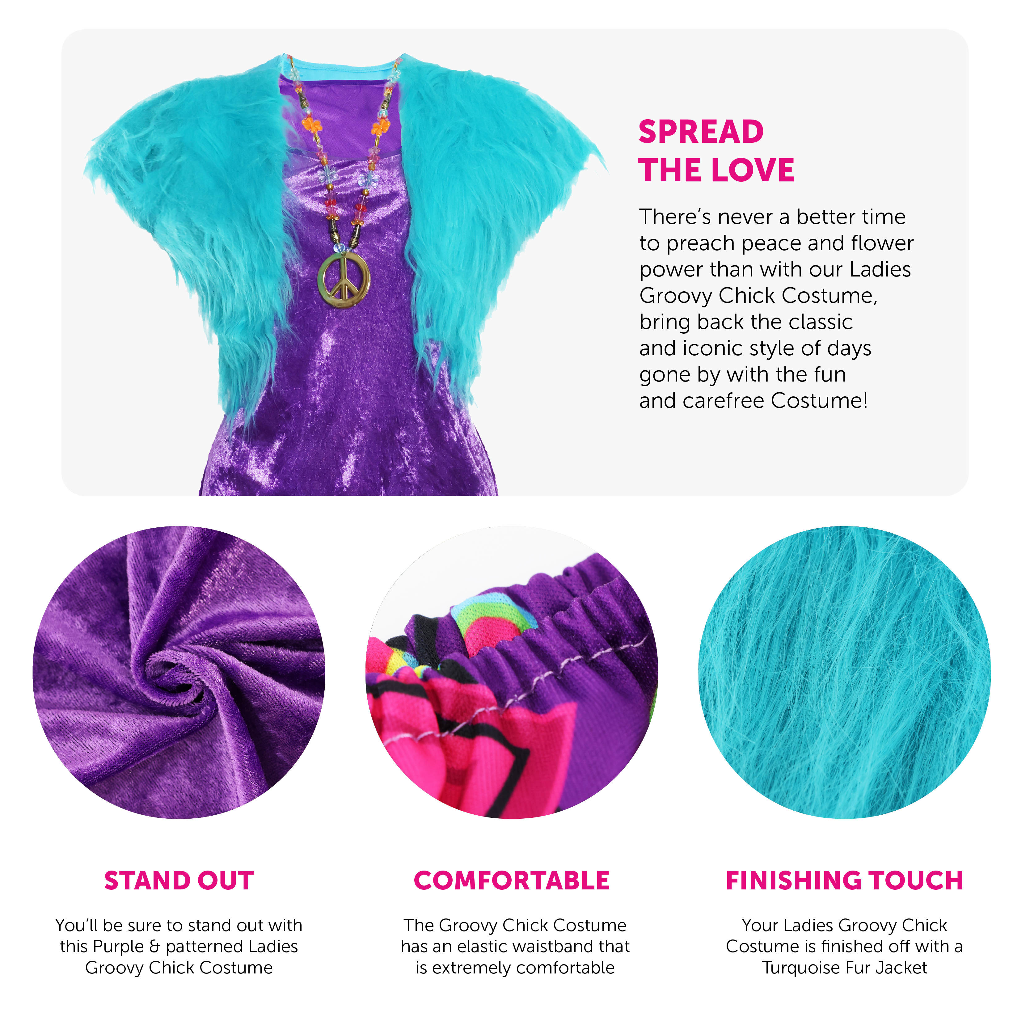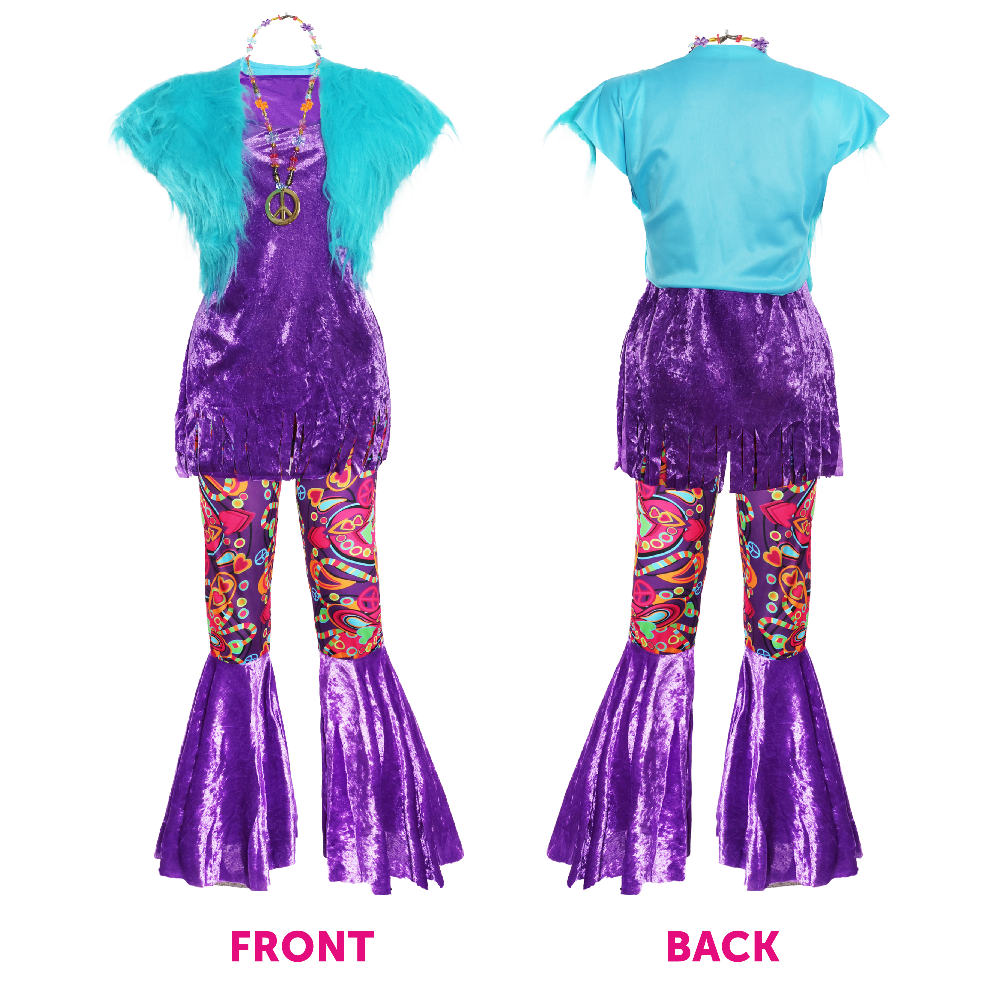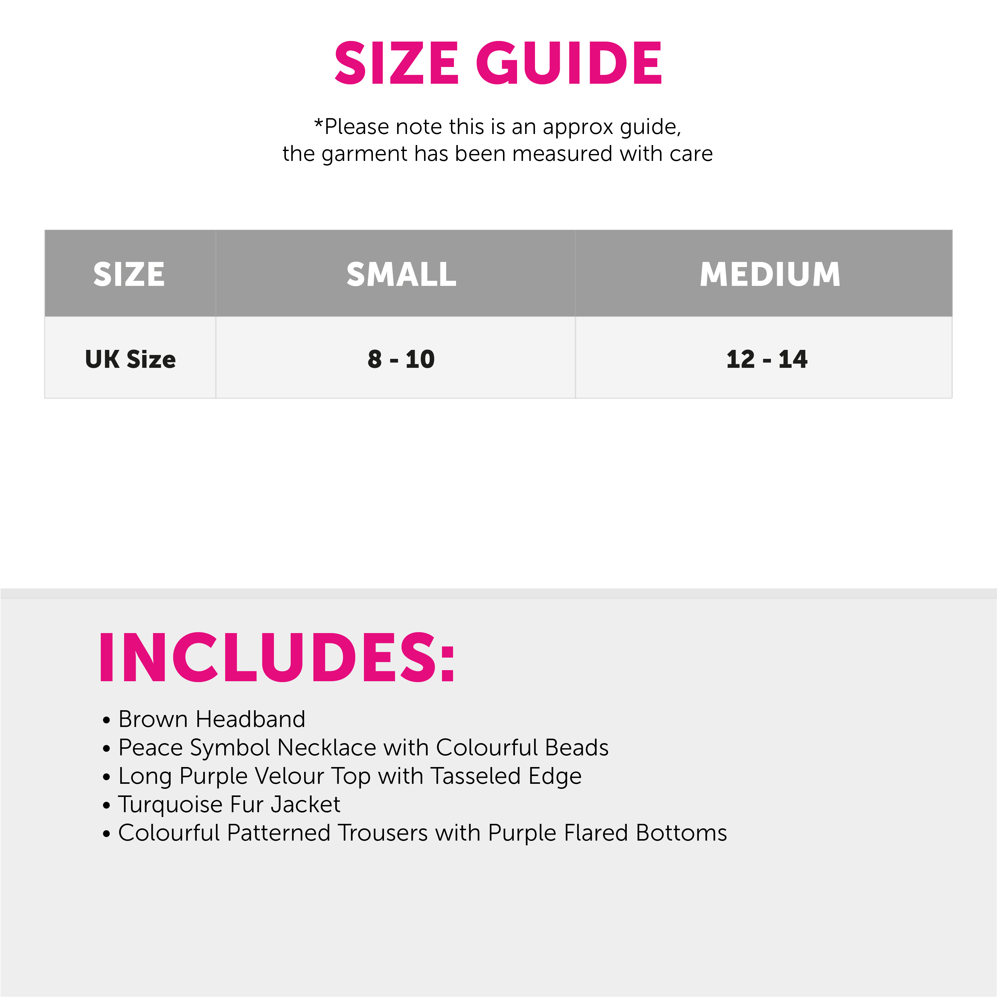 COSTUME DETAILS: Your Ladies Groovy Chick Costume is a Brown Headband, a Long Purple Velour Top, with a Furry Blue Jacket, vibrant patterned Trousers with Purple Flares at the bottom, and a Peace Symbol Necklace with colourful beads, a simplistic yet iconic look for any 60's/70's Fancy Dress Party!