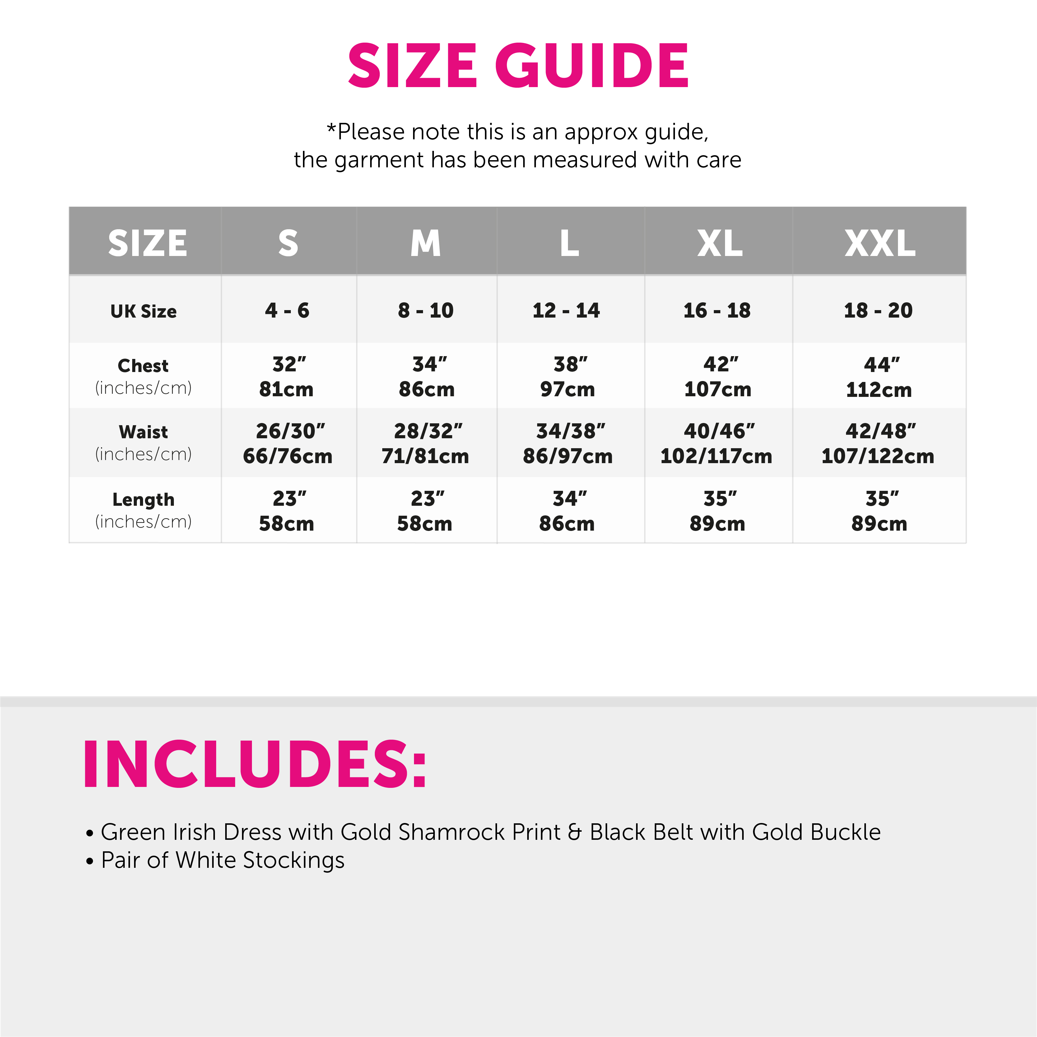 AVAILABLE IN MULTIPLE SIZES: Your Ladies St Patrick’s Day Dress is available in multiple sizes from Small to XX-Large: Small (UK 4 - 6) - Chest 32" (81cm), Waist 26/30" (66/76cm), Length 23" (58cm) | Medium (UK 8 - 10) - Chest 34" (86cm), Waist 28/32" (71/81cm), Length 23" (58cm) | Large (UK 12 - 14) - Chest 38" (97cm), Waist 34/38" (86/97cm), Length 34" (86cm) | X-Large (UK 16 - 18) - Chest 42” (107cm), Waist 40/46” (102/117cm), Length 35” (89cm) | XX-Large (UK 18 - 20) - Chest 44" (112cm), Waist 42/48" (107/122cm), Length 35" (89cm)