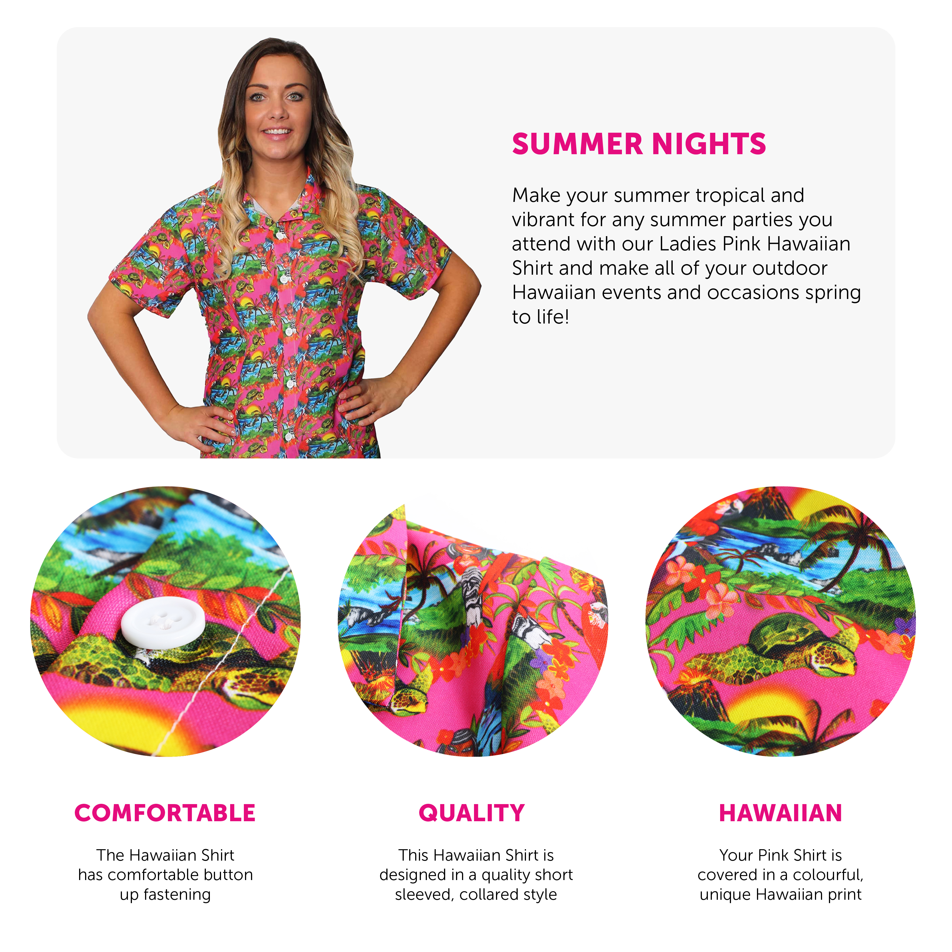 LADIES PINK HAWAIIAN SHIRT: Make your summer tropical and vibrant for any summer parties you attend with our Ladies Pink Hawaiian Shirt and make all of your outdoor Hawaiian events and occasions spring to life!