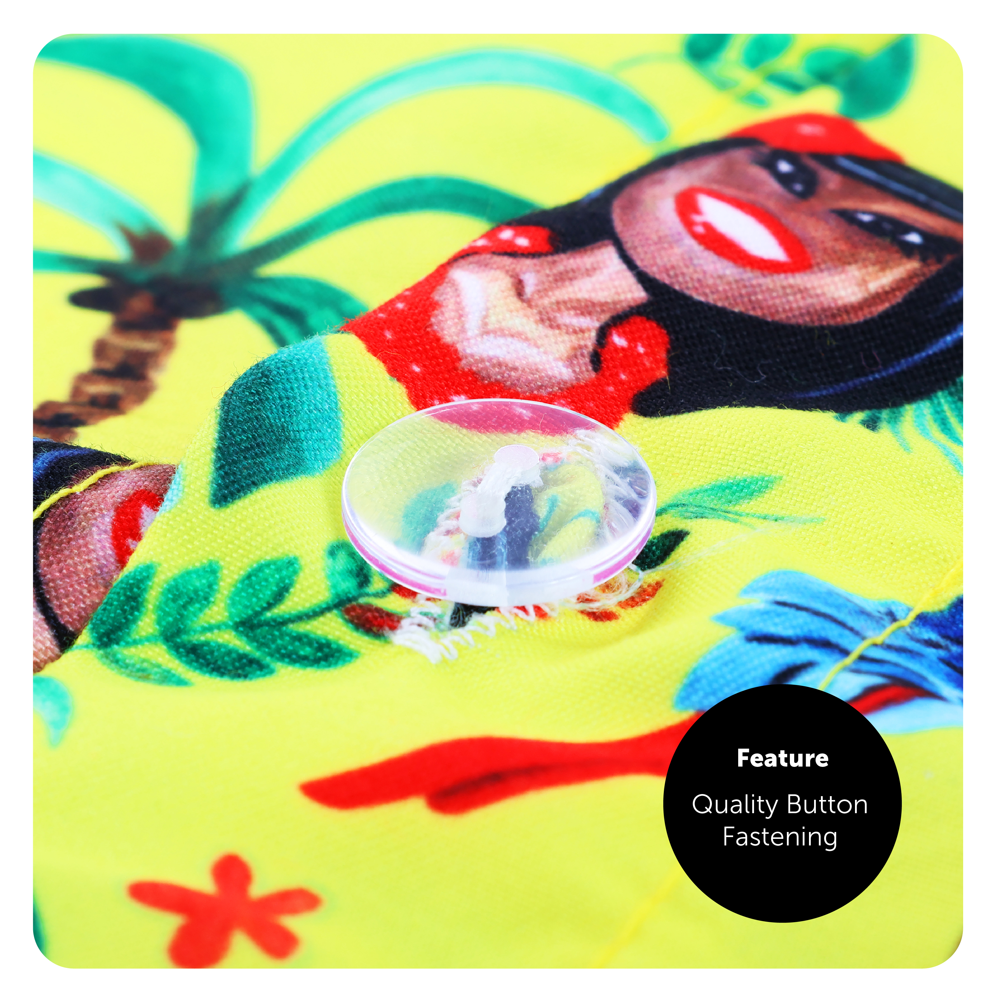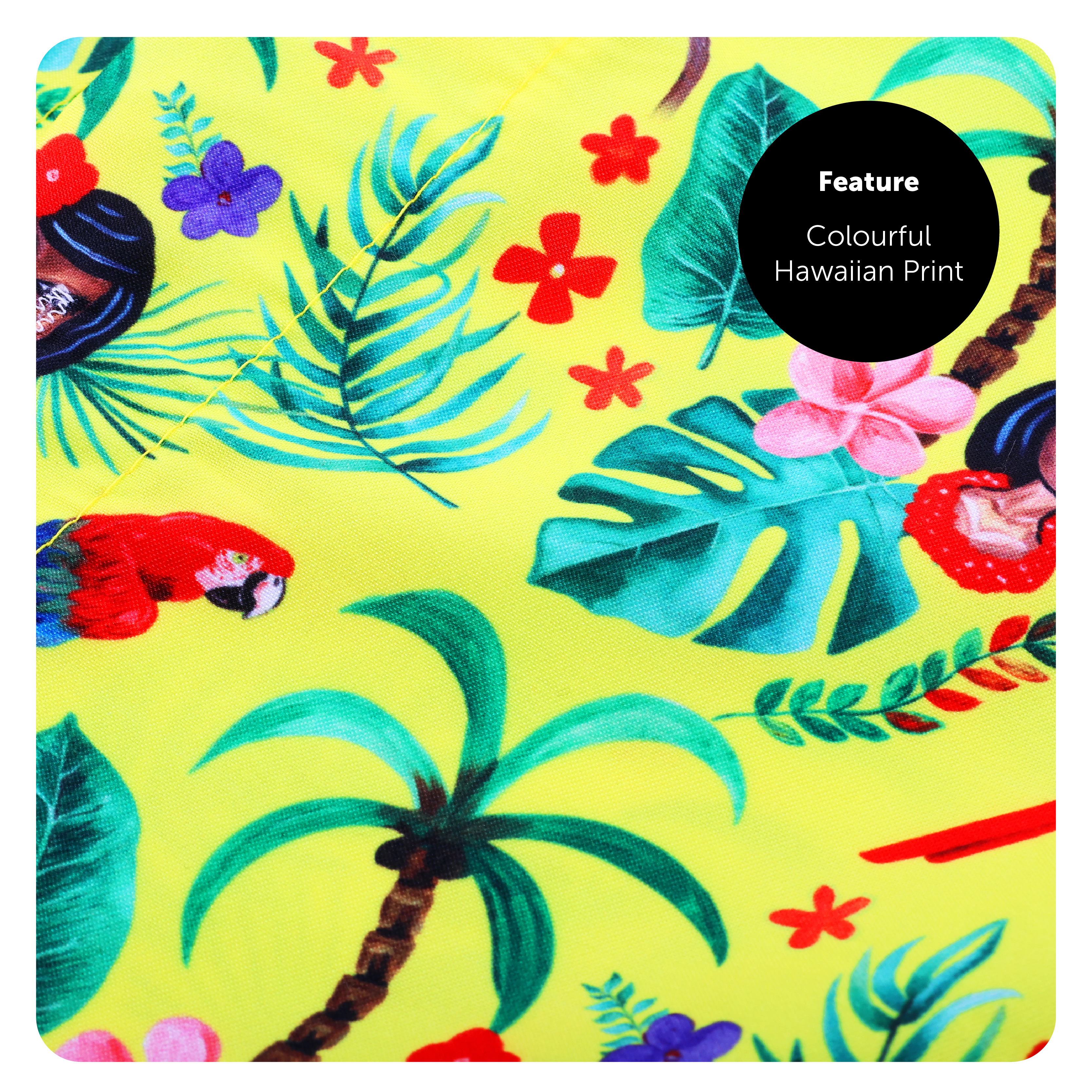 HAWAIIAN SHIRT DETAILING: Not only will the brilliant primary colour of the shirt be a standout summertime must-have, but it is also complete with fantastic Hawaiian detailing and imagery, with Parrots, Golden Time Sunsets, Palm Trees, and the Ocean!