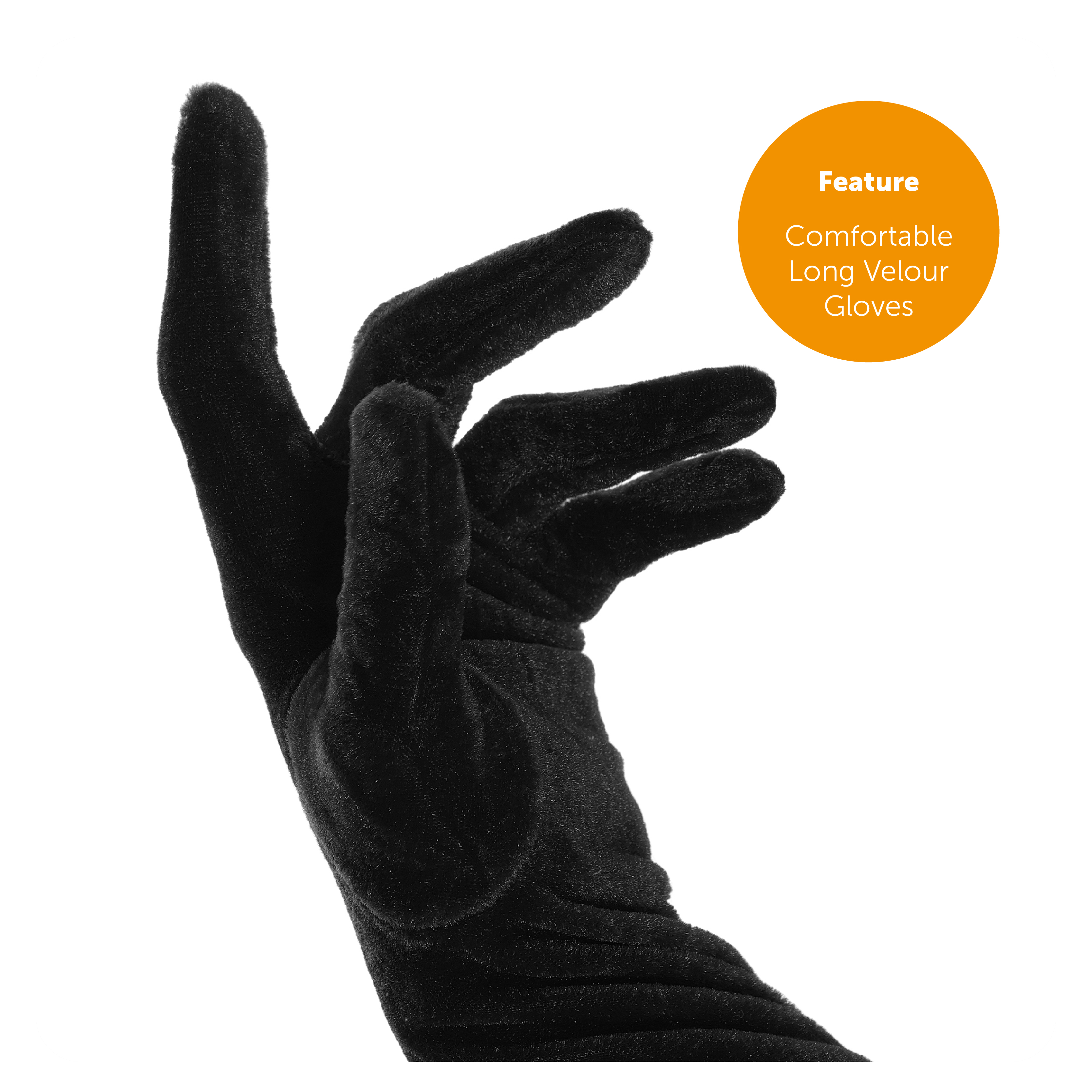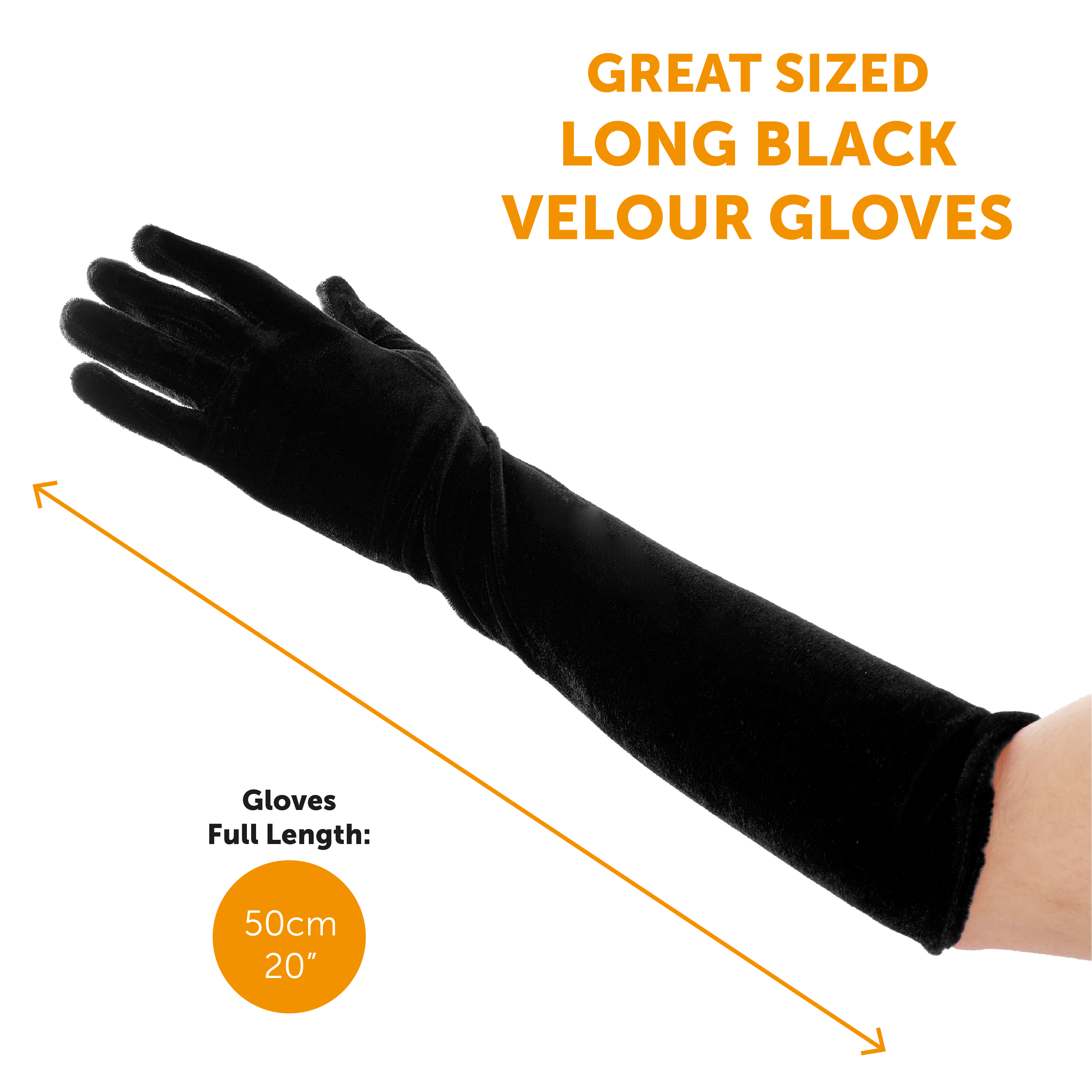 ONE SIZE FITS MOST: The Black Velour Gloves are one size, fitting most Adults comfortably! The Gloves measure a length of 50cm (20”), the perfect Costume accessory for any event!