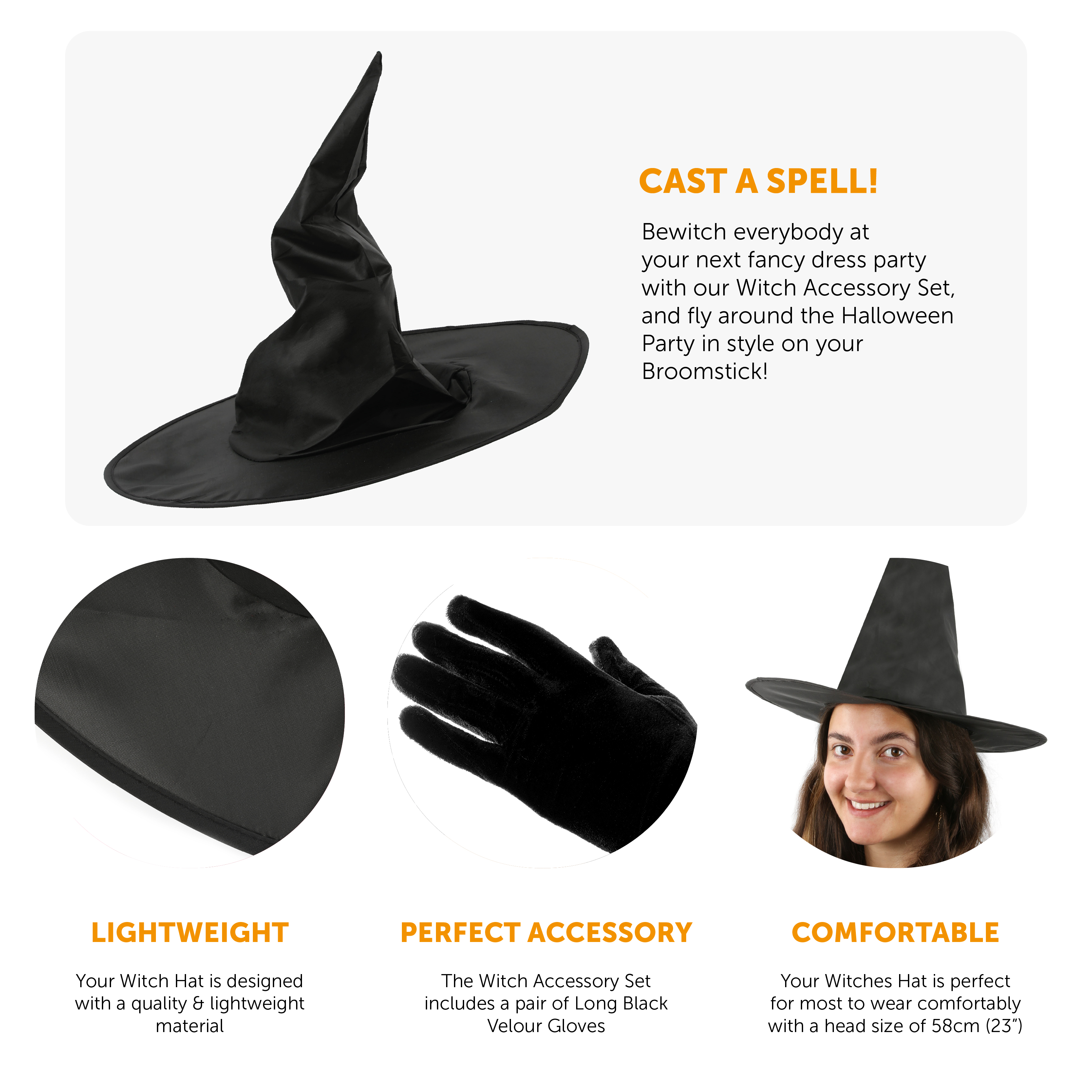 COSTUME DETAILS: The Witch Accessory Set includes a lightweight Black Witches Hat and a pair of Long Black Velour Gloves, the perfect set to accompany your spooky Witch style!