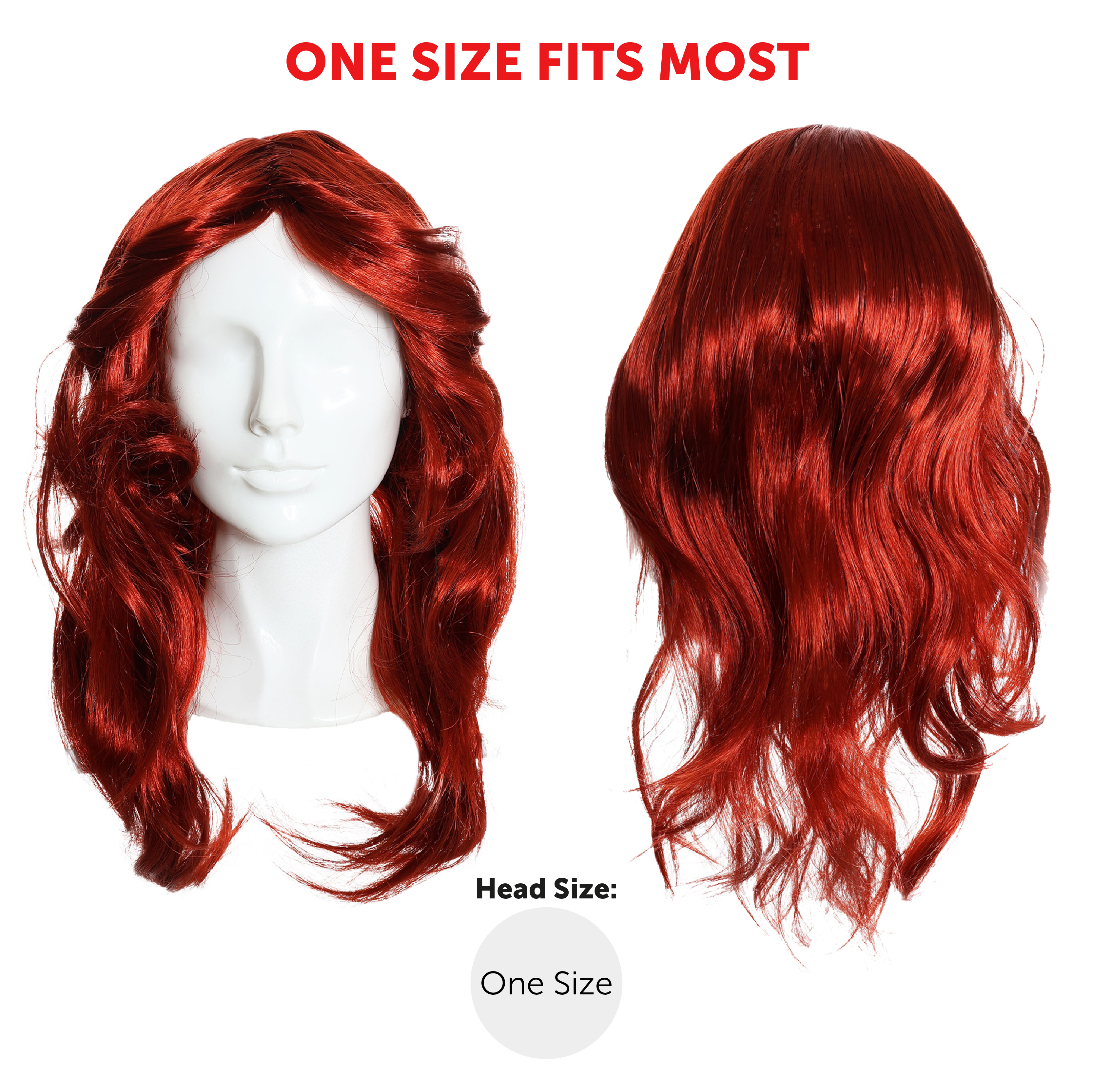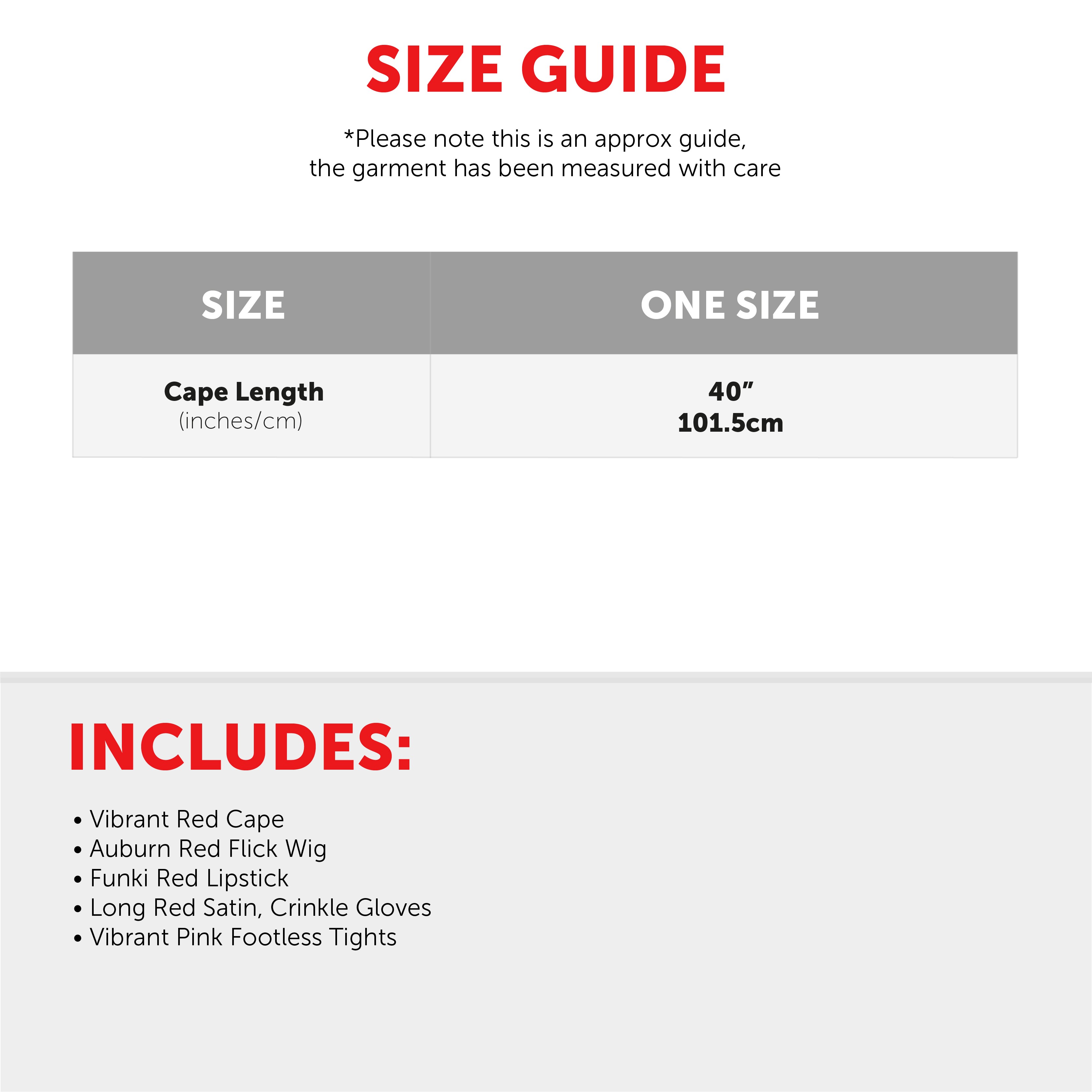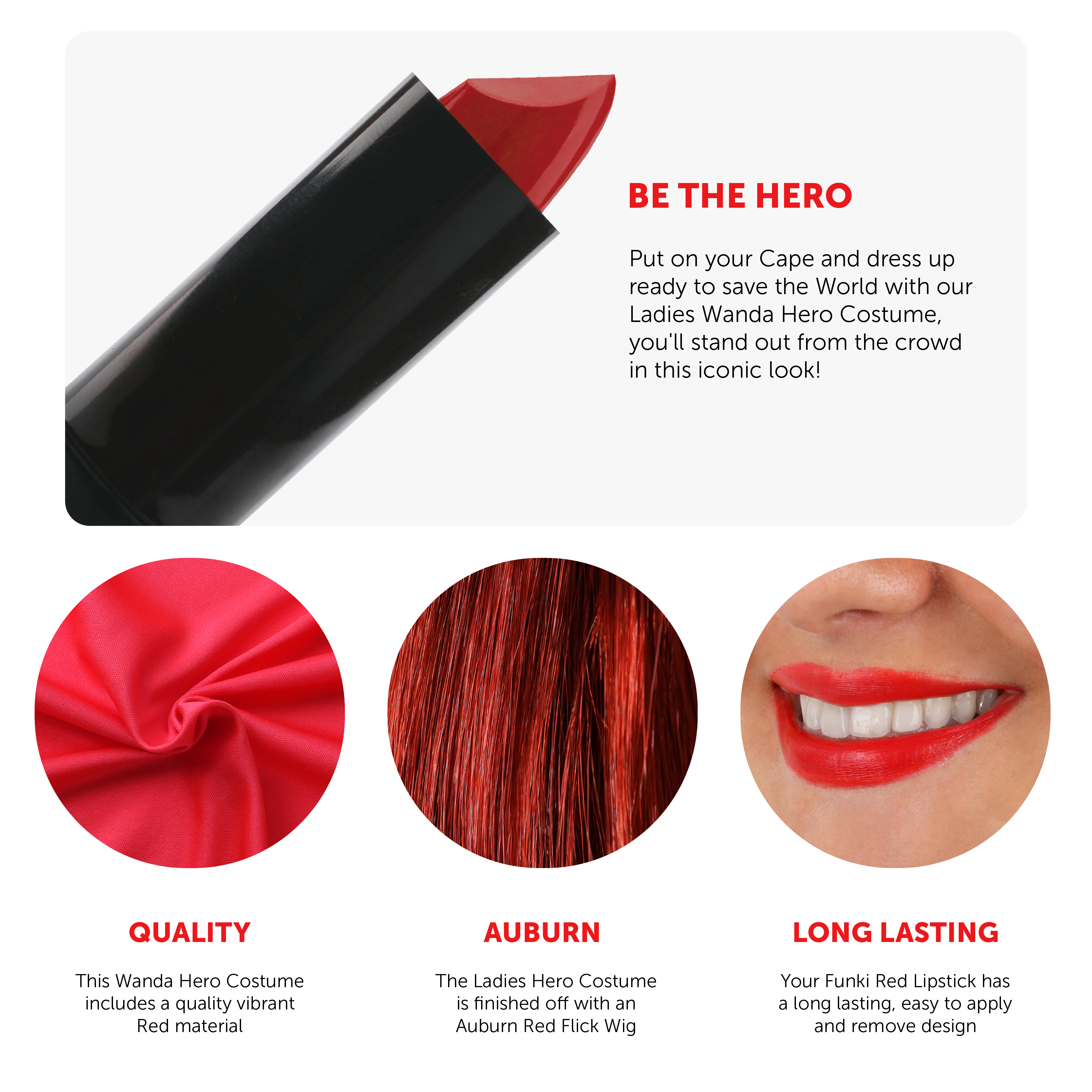 COSTUME INCLUDES: Your Ladies Wanda Hero Costume includes an Auburn Red Flick Wig, a vibrant Red Cape, Long Red Satin Crinkle Gloves, comfortable Pink Footless Tights and Red Lipstick!