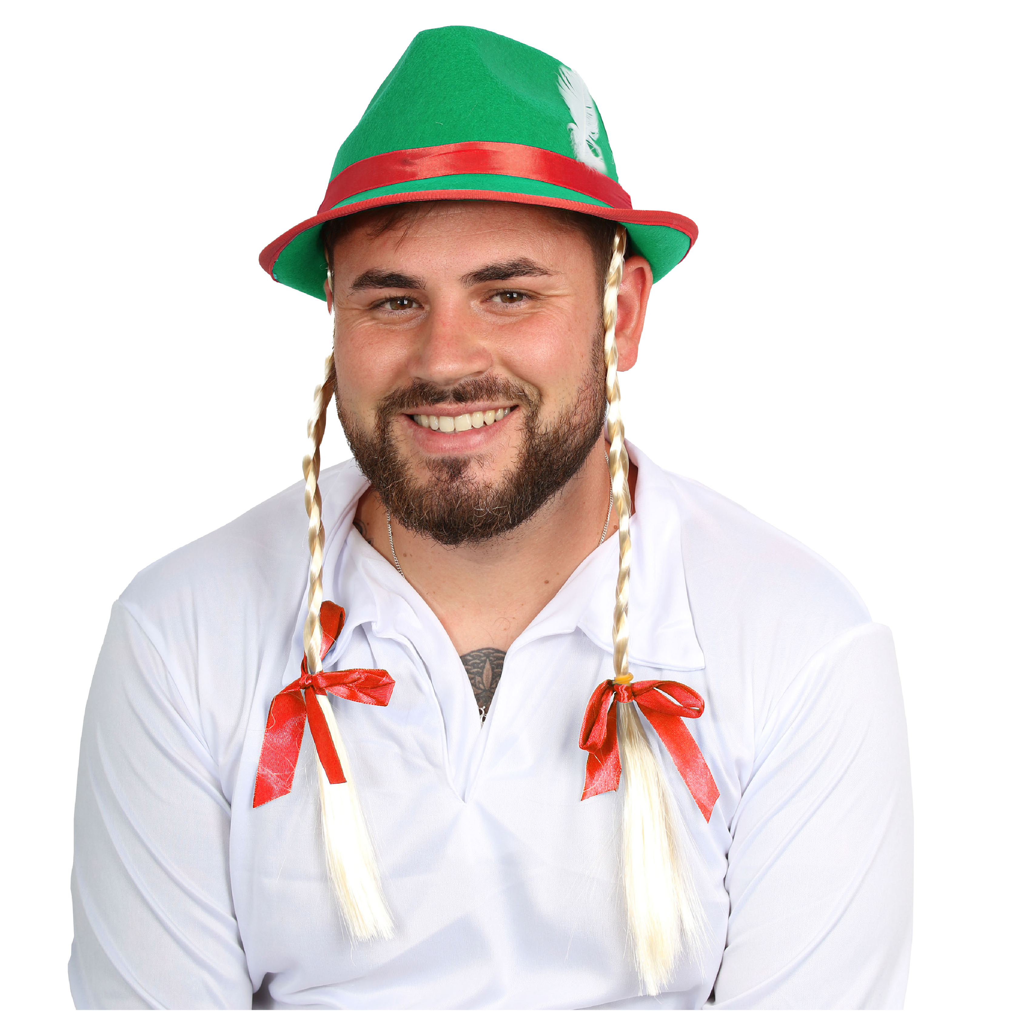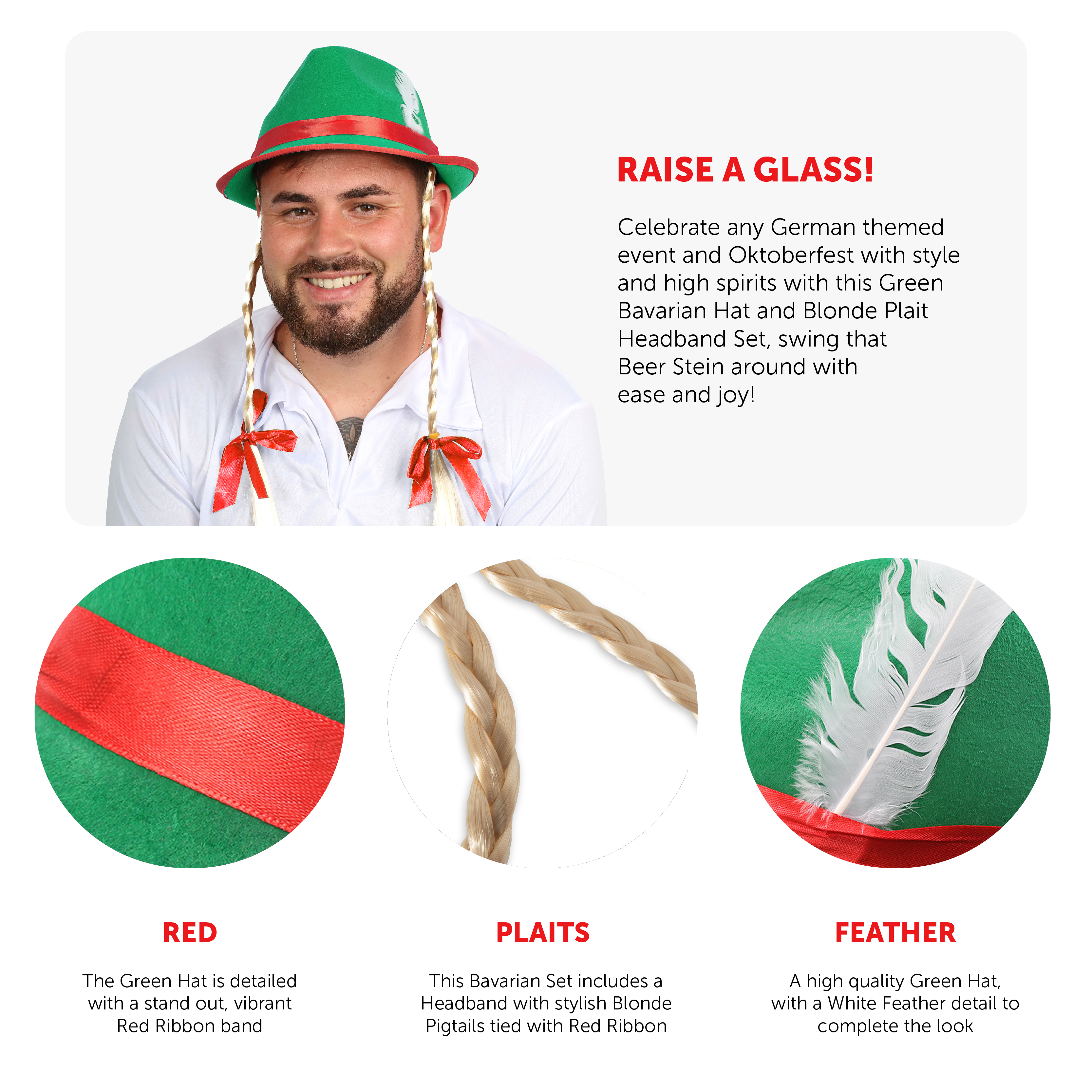 SET DETAILS: Your Bavarian Accessory Set includes a high quality Green Bavarian Hat with a Red Ribbon band and White Feather, and a Headband with Blonde Pigtails attached and tied with Red Ribbons!
