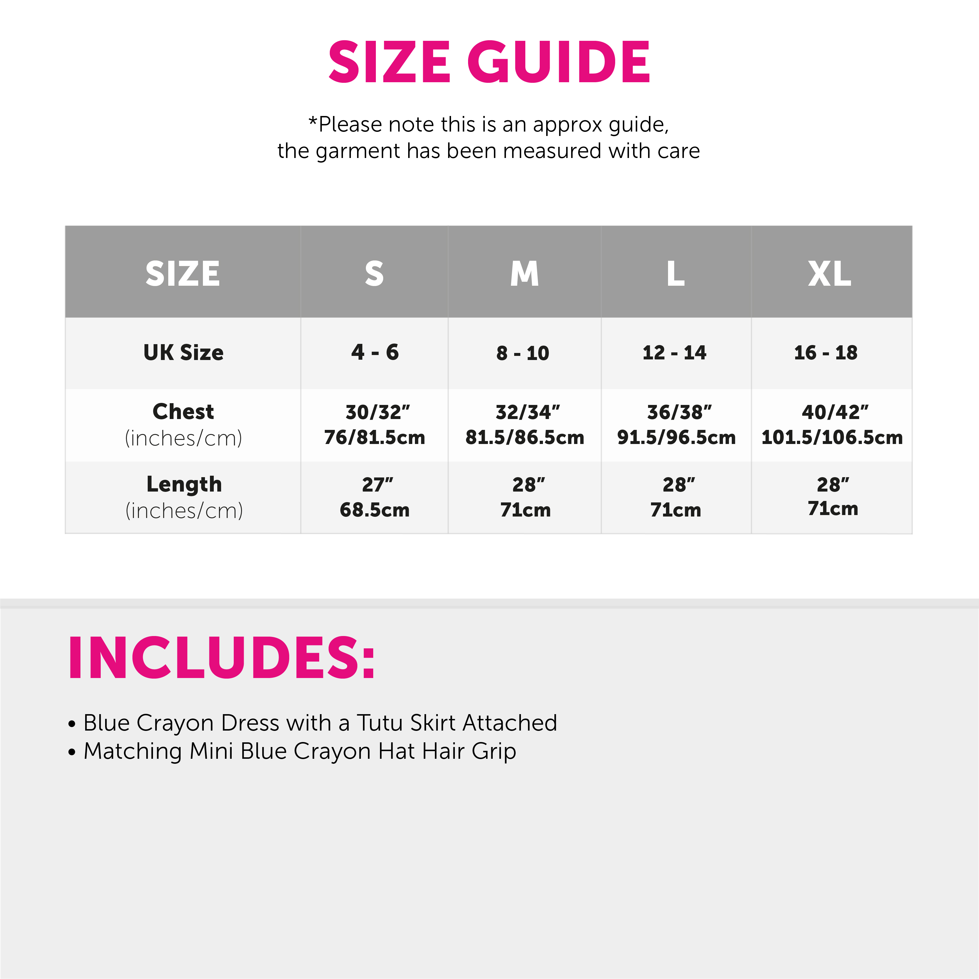 - AVAILABLE IN MULTIPLE SIZES: Your Ladies Blue Crayon Dress is available in multiple sizes from Small to X-Large: Small: Chest: 30-32"/76-81.5cm - Length: 27"/68.5cm | Medium: Chest: 32-34"/81.5-86.5cm - Length: 28"/71cm | Large: Chest: 36-38"/91.5-96.5cm - Length: 28"/71cm | X Large: Chest: 40-42"/101.5-106.5cm - Length: 28"/71cm