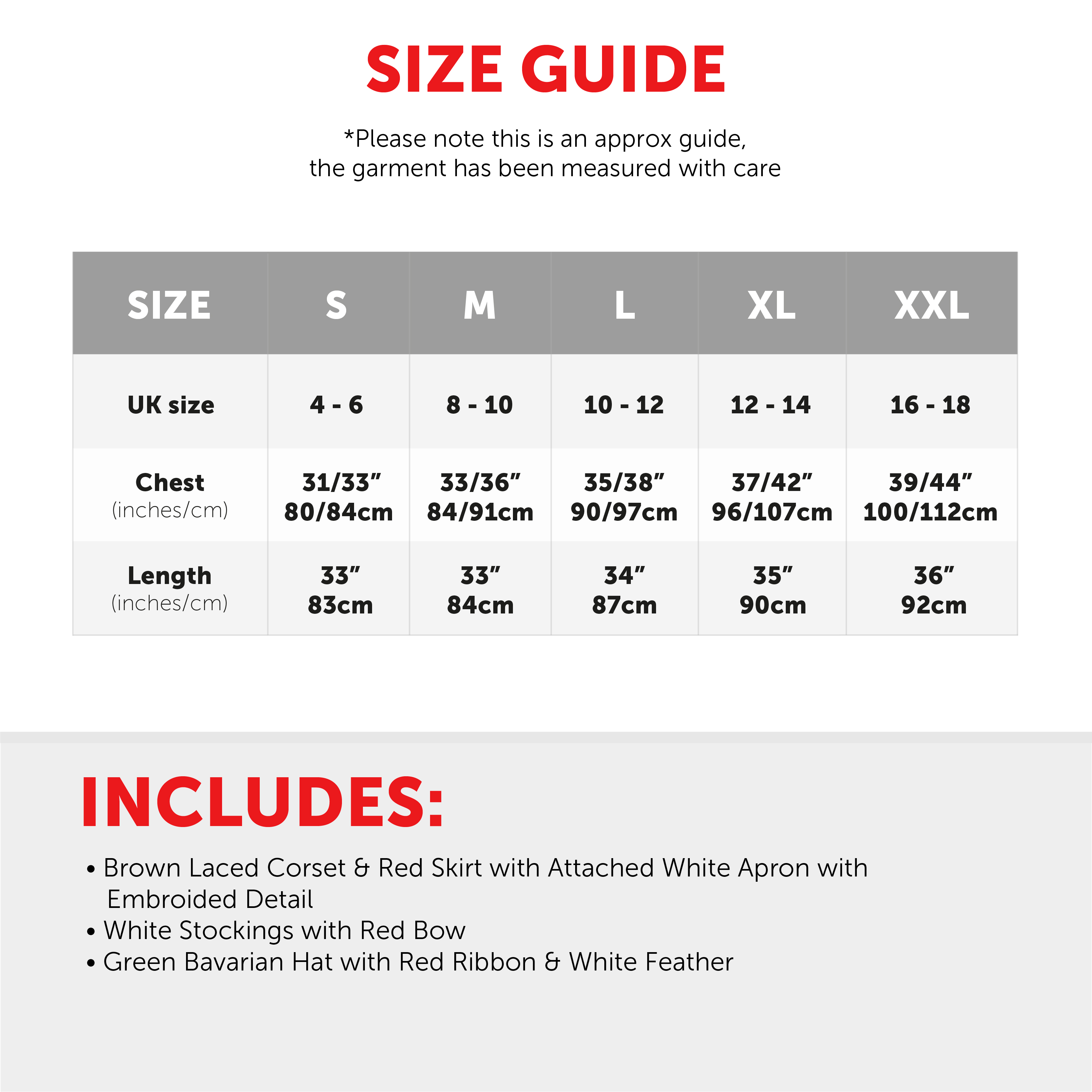 AVAILABLE IN MULTIPLE SIZES: Your Ladies Bavarian Dress Costume is available in multiple sizes from Small to XX-Large: Small (UK 4 - 6) Chest: 31/33” (80/84cm), Length: 33” (83cm) | Medium (UK 8 - 10) Chest: 33/36” (84/91cm), Length: 33” (84cm) | Large (UK 10 - 12) Chest: 35/38” (90/97cm), Length: 34” (87cm) | X-Large (UK 12 - 14) Chest: 37/42” (96/107cm), Length: 35” (90cm) | XX-Large (UK 16 - 18) Chest: 39/44” (100/112cm), Length: 36” (92cm)