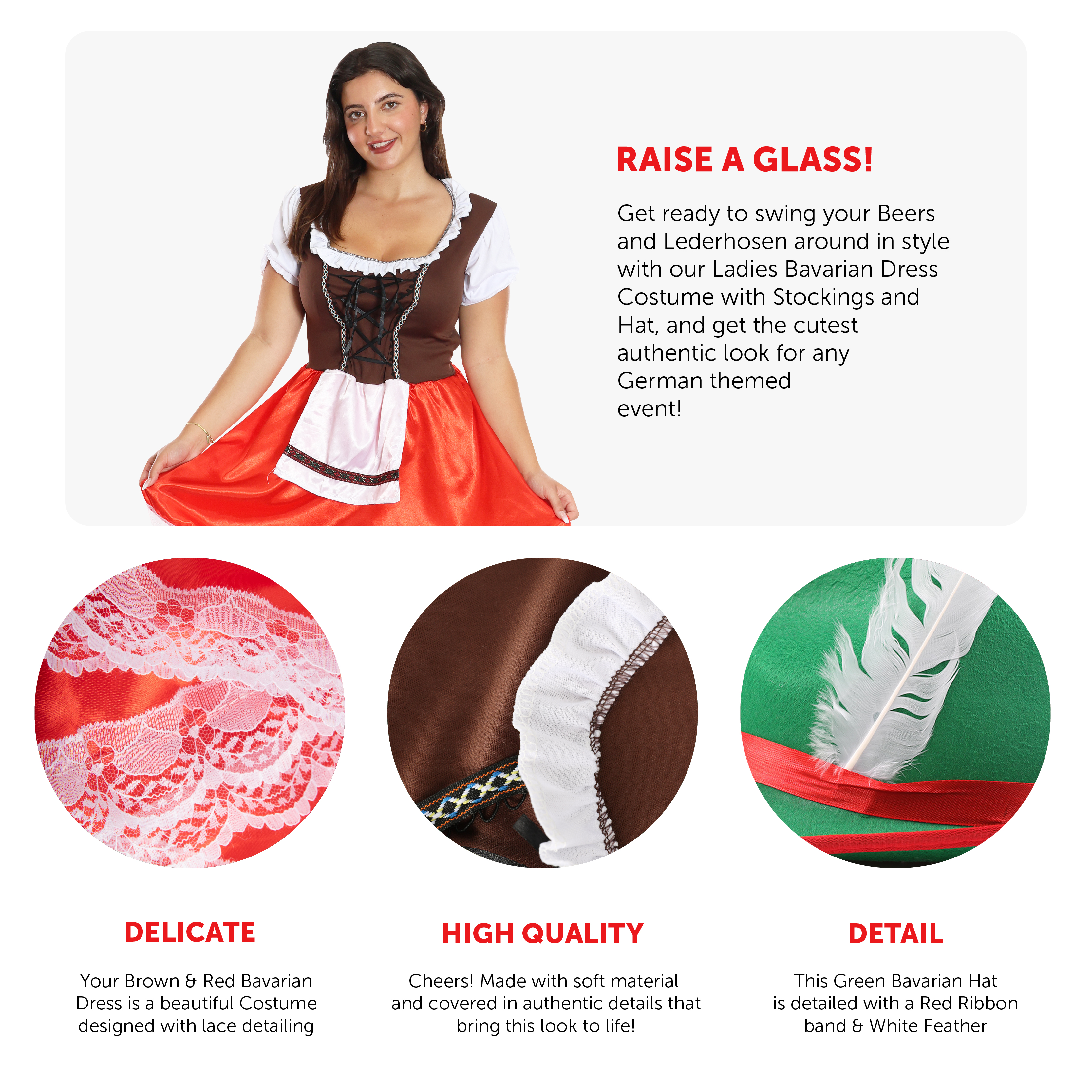 BAVARIAN SET INCLUDES: Your Ladies Bavarian Costume includes a beautiful dress with a Red detailed skirt, and a Brown Laced Corset Top with an attached White Shirt with frilled shoulders, a pair of White Stockings detailed with a Red Bow, and a Green Hat with a Red Ribbon band and White Feather, the perfect Oktoberfest look!