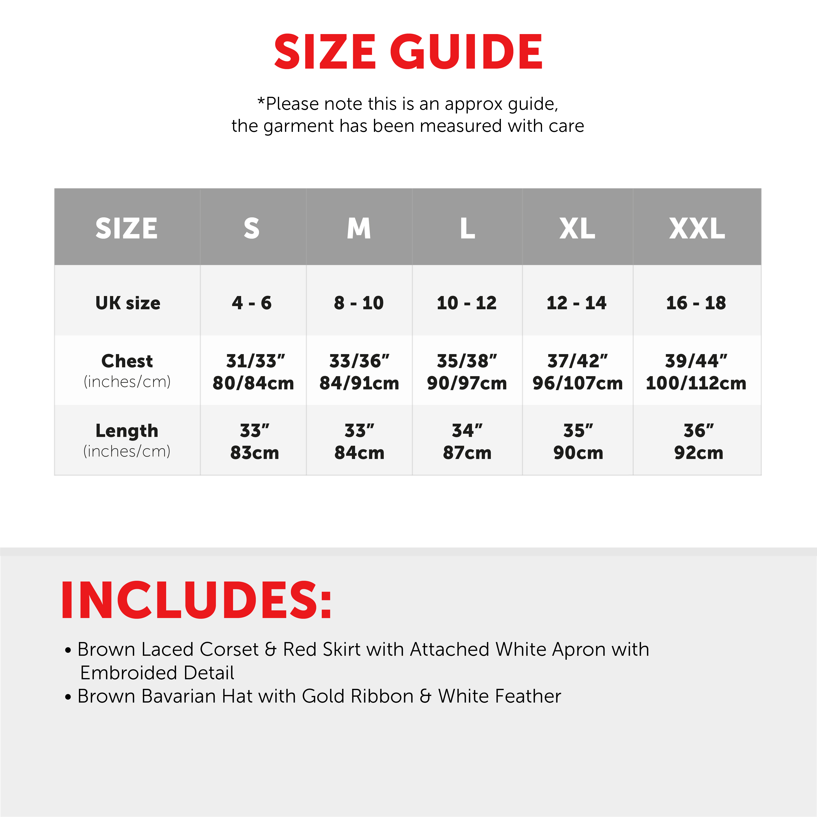 AVAILABLE IN MULTIPLE SIZES: Your Ladies Bavarian Dress Costume is available in multiple sizes from Small to XX-Large: Small (UK 4 - 6) Chest: 31/33” (80/84cm), Length: 33” (83cm) | Medium (UK 8 - 10) Chest: 33/36” (84/91cm), Length: 33” (84cm) | Large (UK 10 - 12) Chest: 35/38” (90/97cm), Length: 34” (87cm) | X-Large (UK 12 - 14) Chest: 37/42” (96/107cm), Length: 35” (90cm) | XX-Large (UK 16 - 18) Chest: 39/44” (100/112cm), Length: 36” (92cm)