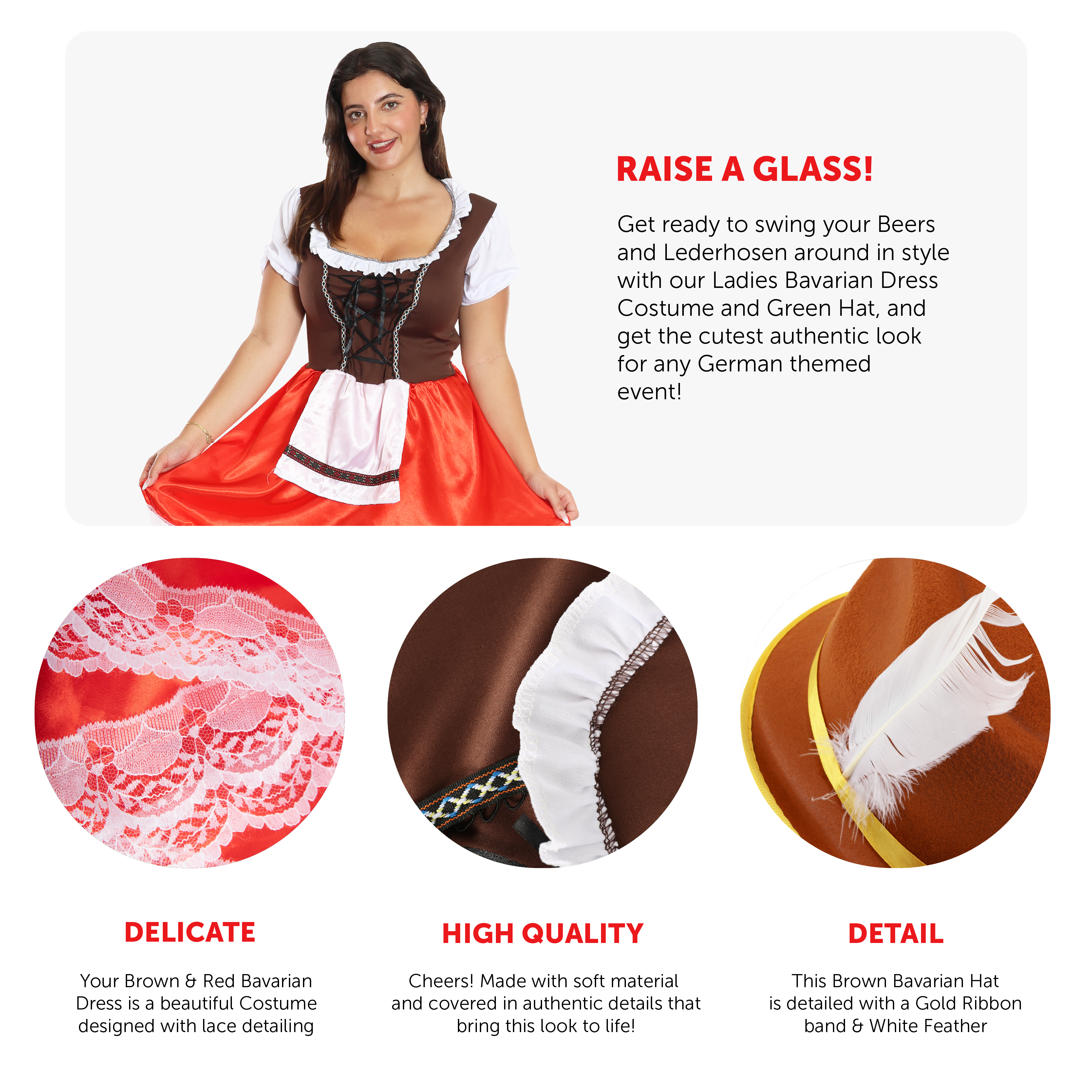 BAVARIAN SET INCLUDES: Your Ladies Bavarian Costume includes a beautiful dress with a Red detailed skirt, and a Brown Laced Corset Top with an attached White Shirt with frilled shoulders, and a Brown Hat with a Gold Ribbon band and White Feather, the perfect Oktoberfest look!