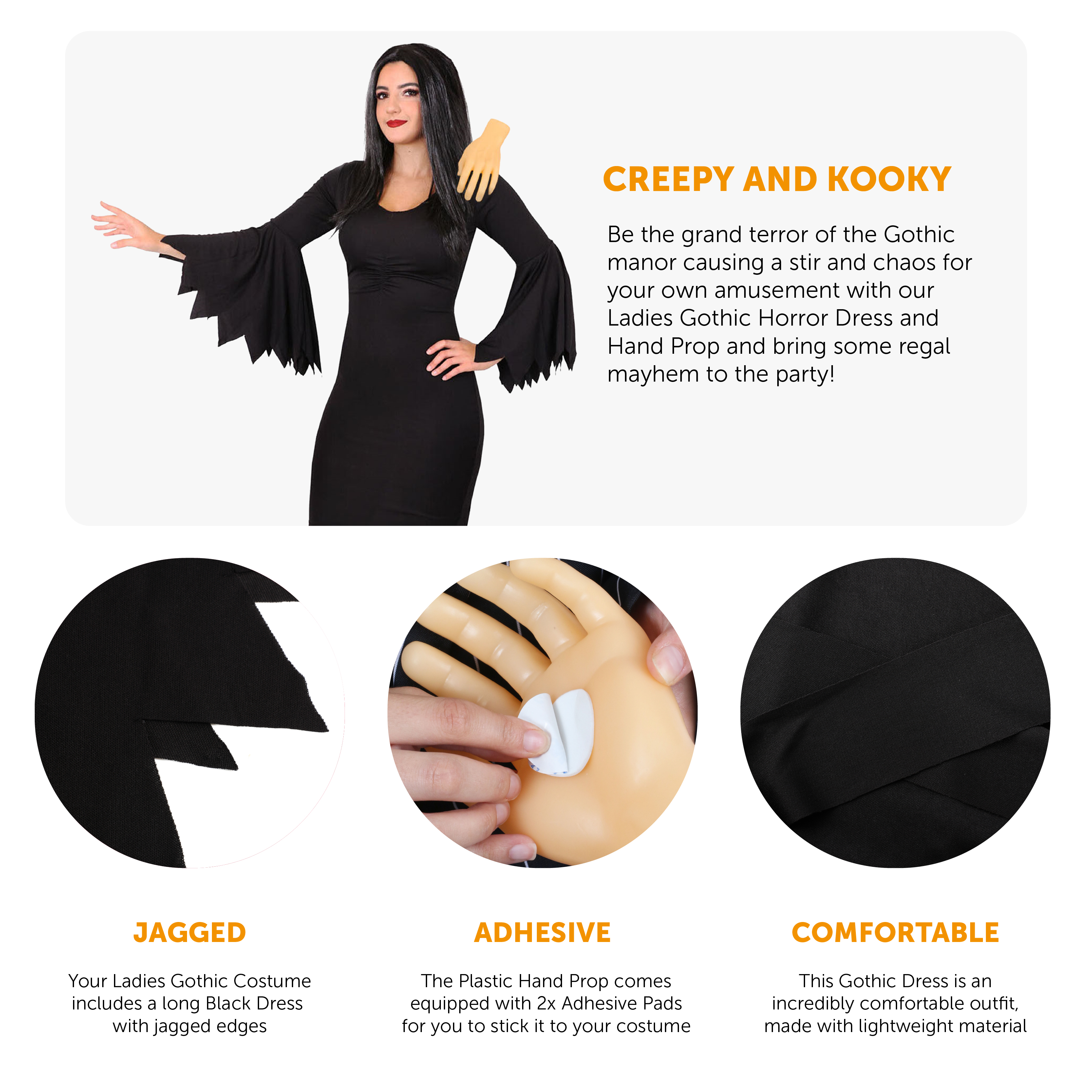 COSTUME DETAILS: A long Black Ladies Gothic Halloween Dress with tattered edges, and a Plastic Human Hand Prop with 2 attachable Sticky Pads for you to place on your costume, the perfect Halloween look this year!