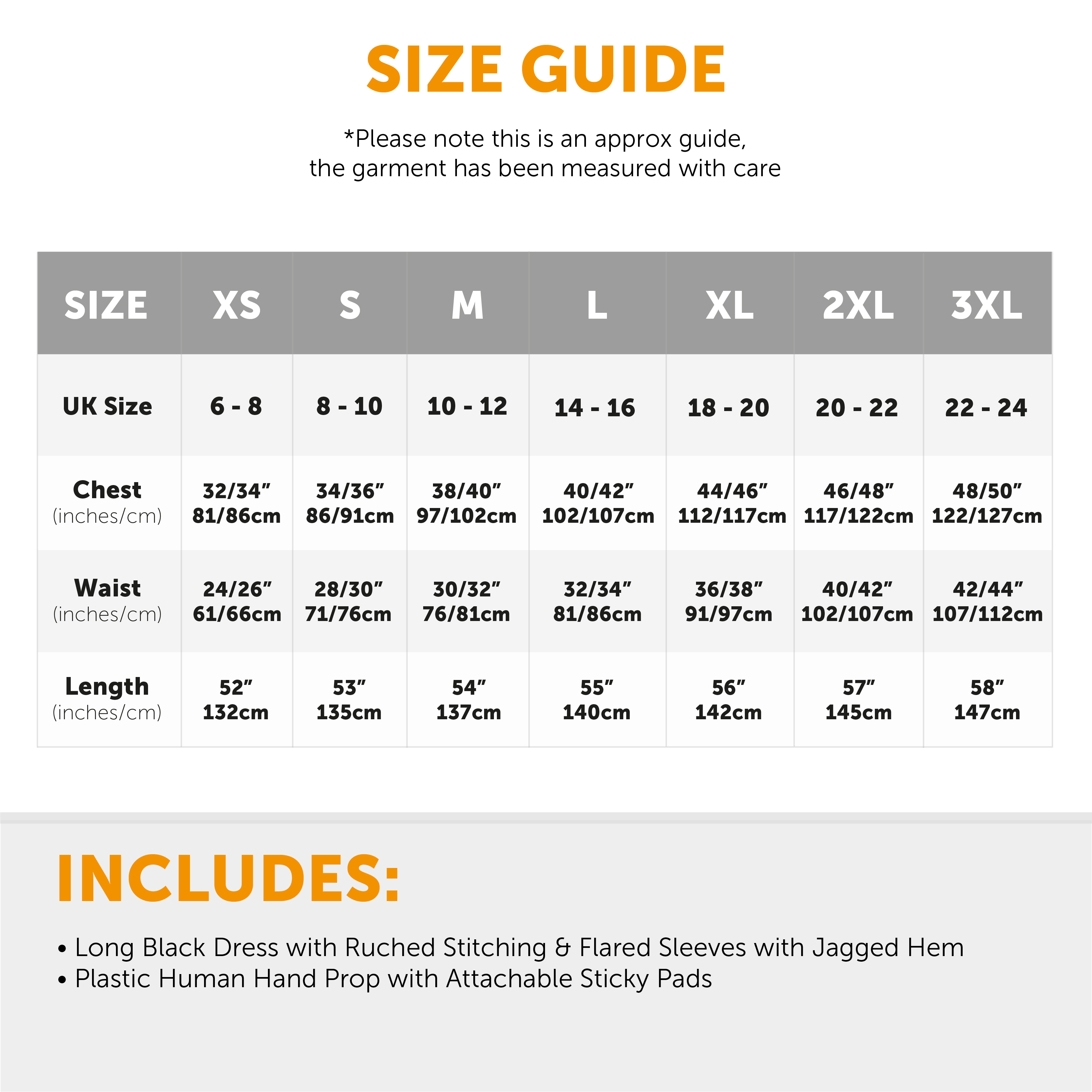 AVAILABLE IN MULTIPLE SIZES: This Ladies Gothic Horror Dress is available in multiple sizes from X-Small to XXX-Large: X-Small (UK 6-8) - Chest: 32/34" (81/86cm), Waist: 24/26" (61/66cm), Length: 52" (132cm) | Small (UK 8-10) - Chest: 34/36" (86/91cm), Waist: 28/30" (71/76cm), Length: 53" (135cm) | Medium (UK 10-12) - Chest: 38/40" (97/102cm), Waist: 30/32" (76/81cm), Length: 54" (137cm) | Large (UK 14-16) - Chest: 40/42" (102/107cm), Waist: 32/34" (81/86cm), Length: 55" (140cm) | X-Large (UK 18-20) - Chest: 44/46" (112/117cm), Waist: 36/38" (91/97cm), Length: 56" (142cm) | XX-Large (UK 20-22) - Chest: 46/48" (117/122cm), Waist: 40/42" (102/107cm), Length: 57" (145cm) | XXX-Large (UK 22-24) - Chest: 48/50" (122/127cm), Waist: 42/44" (107/112cm), Length: 58" (147cm)