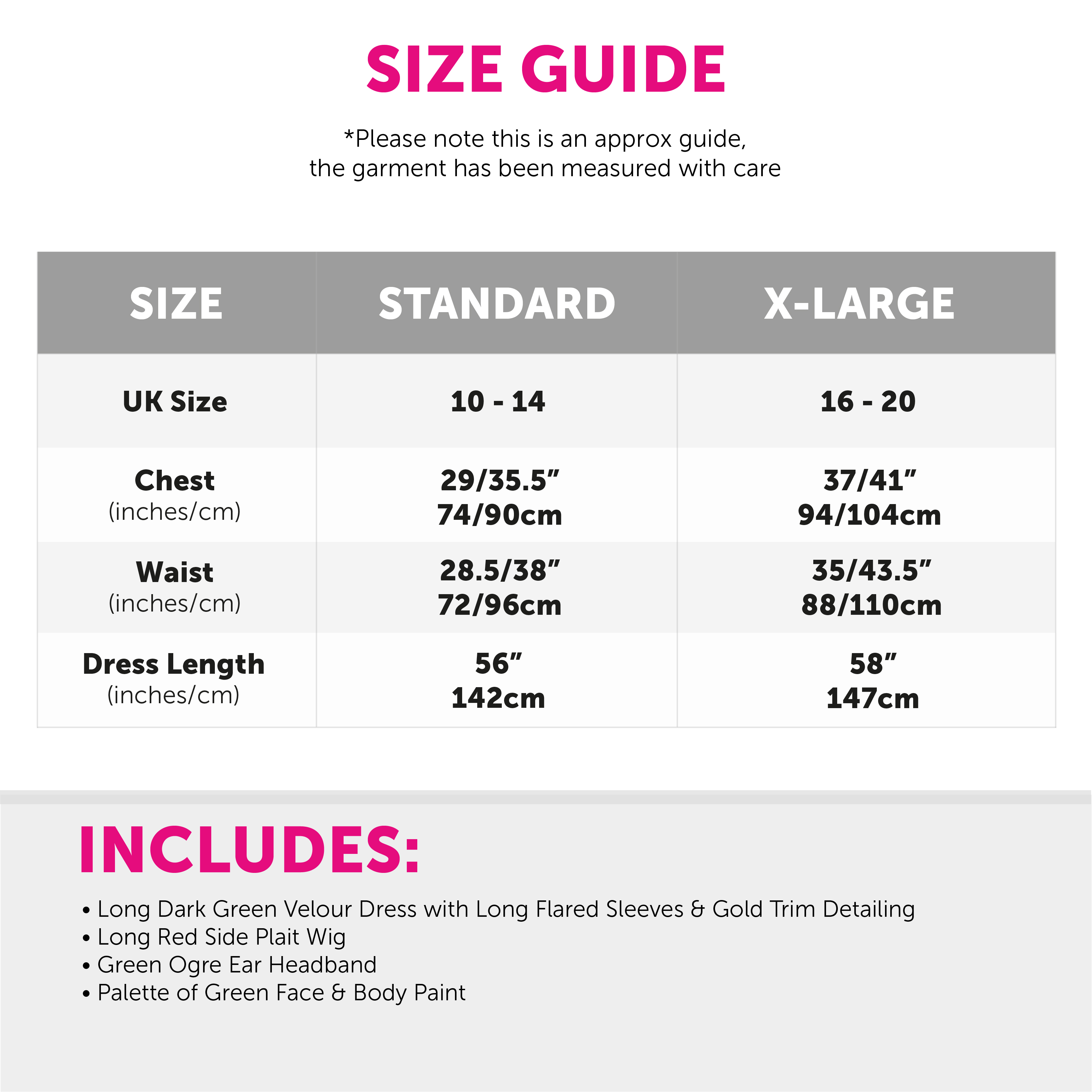 AVAILABLE IN TWO SIZES: This Ladies Green Ogre Princess Costume is available in two sizes, Standard & X-Large, perfect for you to find the right fit; Standard - Chest 29/35.5" (74/90cm), Waist 28.5/38" (72/96cm), Dress Length 56" (142cm) | X-Large - Chest 37/41" (94/104cm), Waist 35/43.5" (88/110cm), Dress Length 58" (147cm)