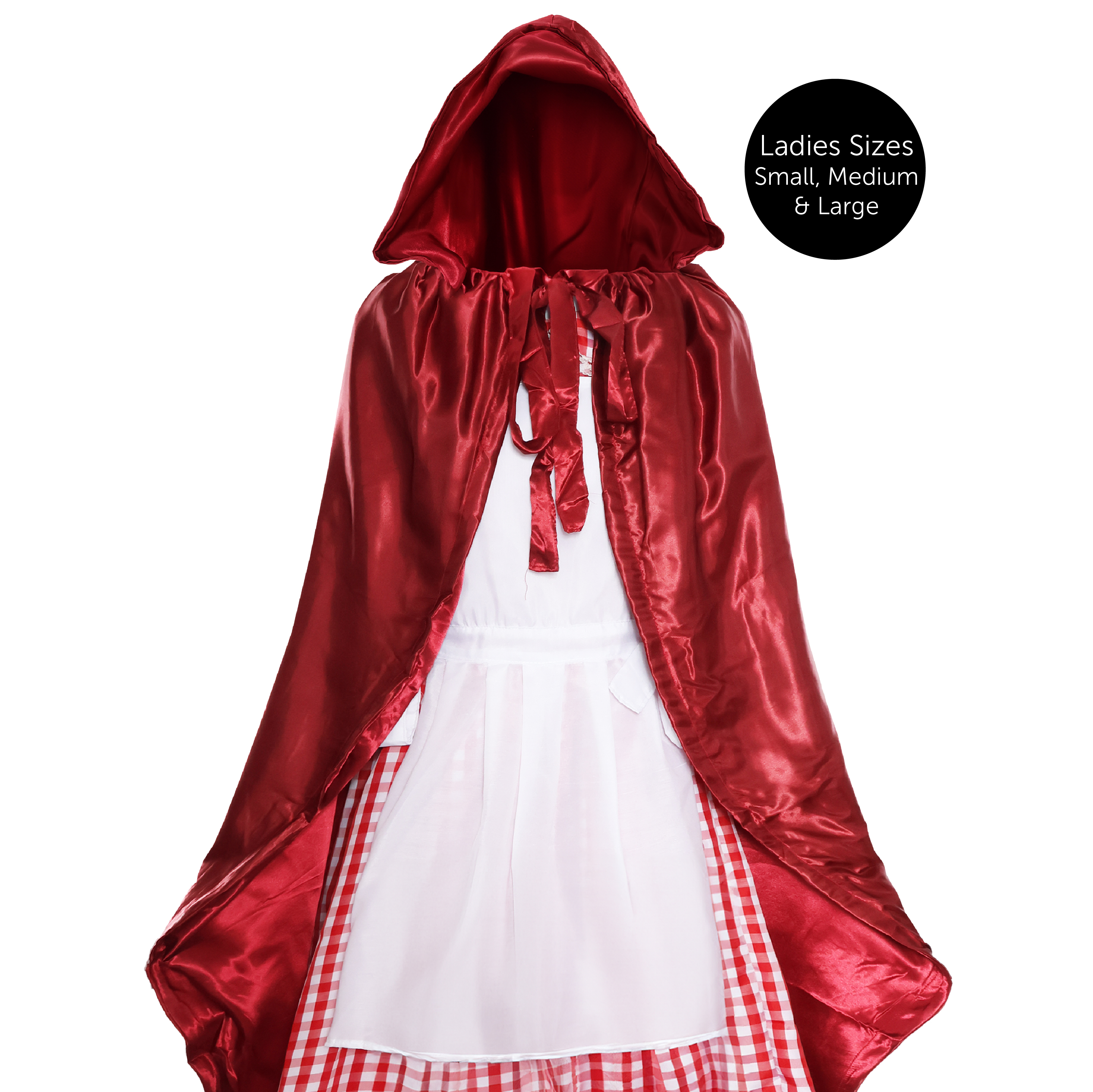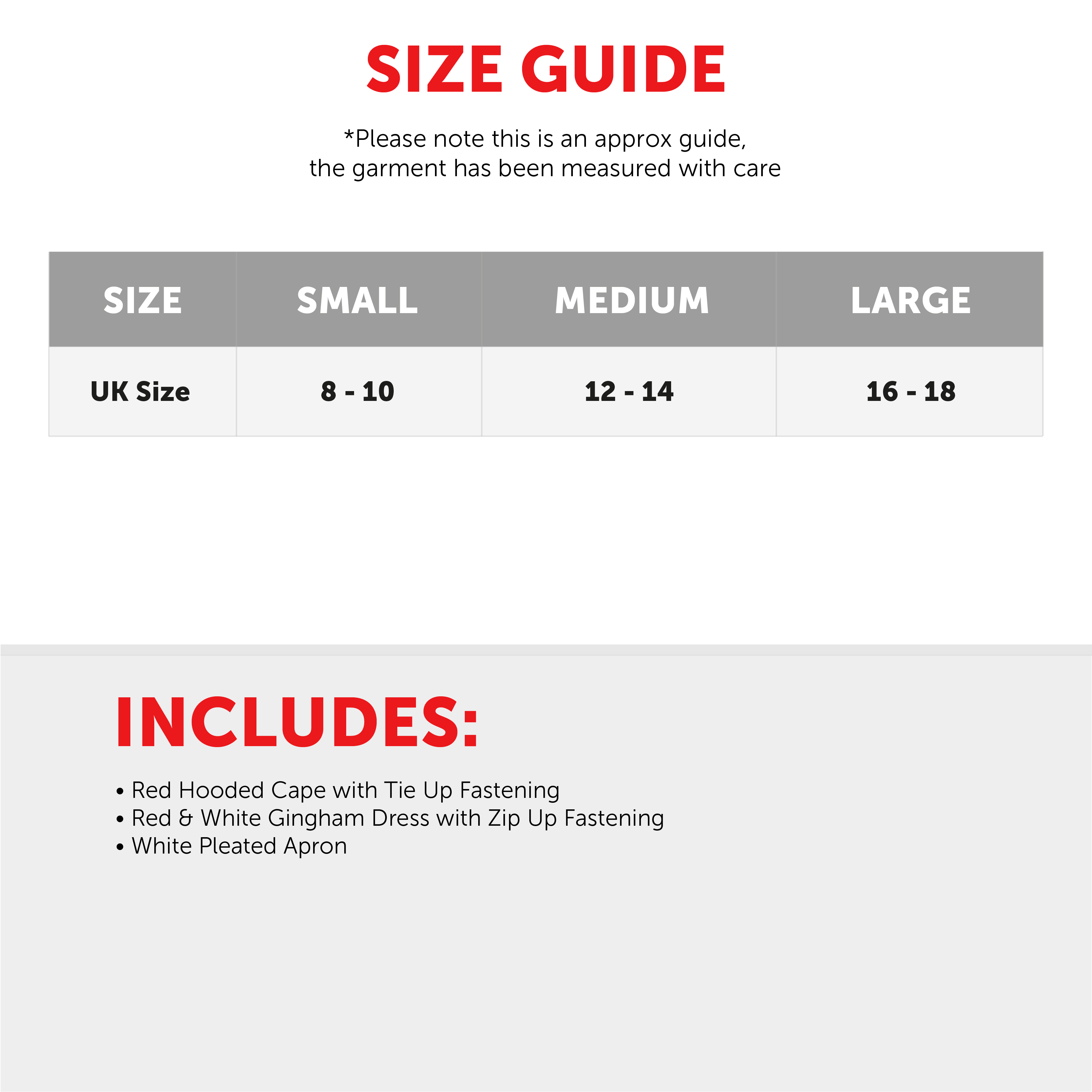 COSTUME INCLUDES: This Red Riding Hood Costume includes a long Red Cape with an attached Hood and easy tie up fastening, a Red and White Gingham style dress, with a White Apron attached, the perfect look for any fancy dress event!