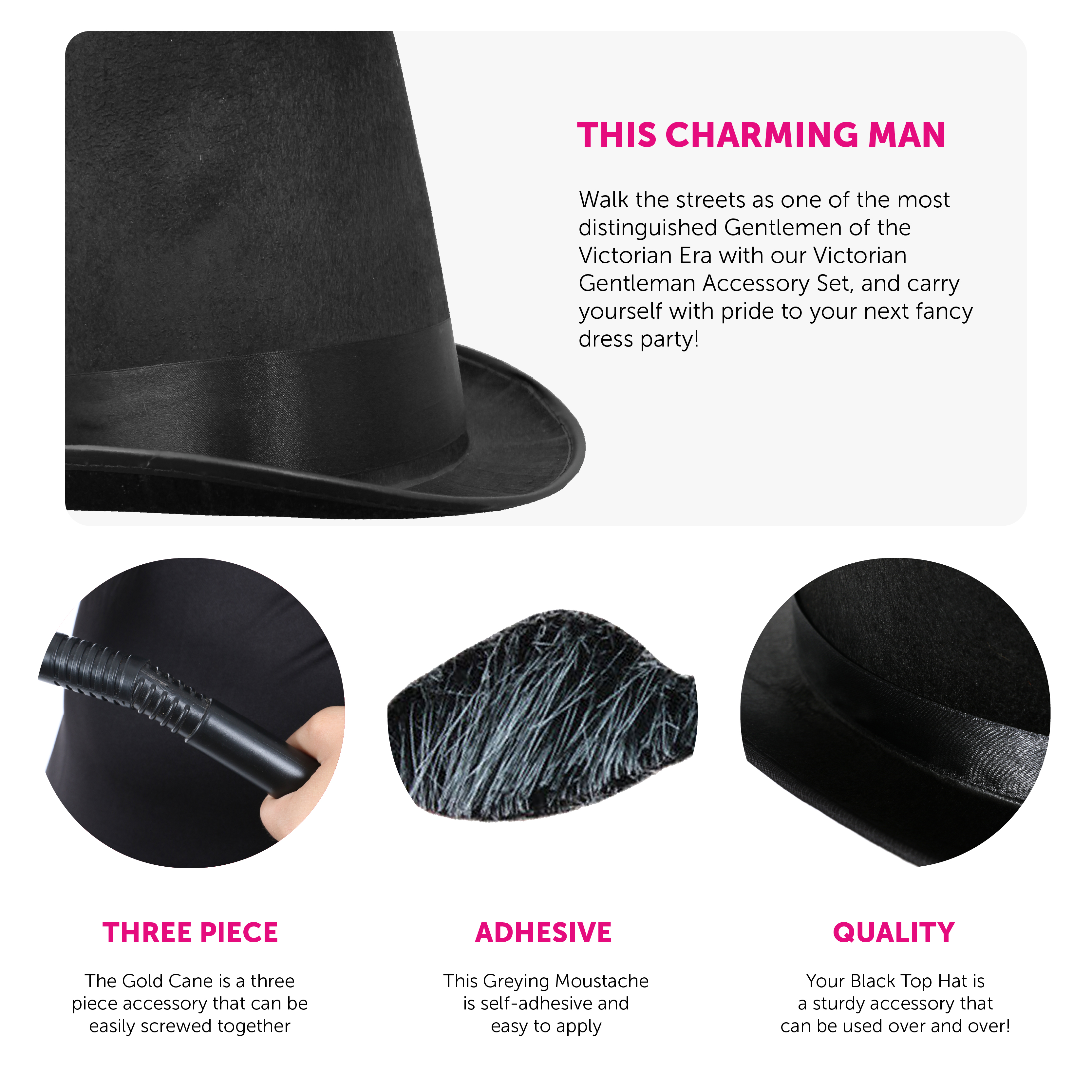 VICTORIAN GENTLEMAN SET INCLUDES: Your Victorian Gentleman Set includes a Black Top Hat with a satin trim, a self-adhesive Moustache with Greying Hair detail and a Black Cane with Gold handle detail, to complete your look!