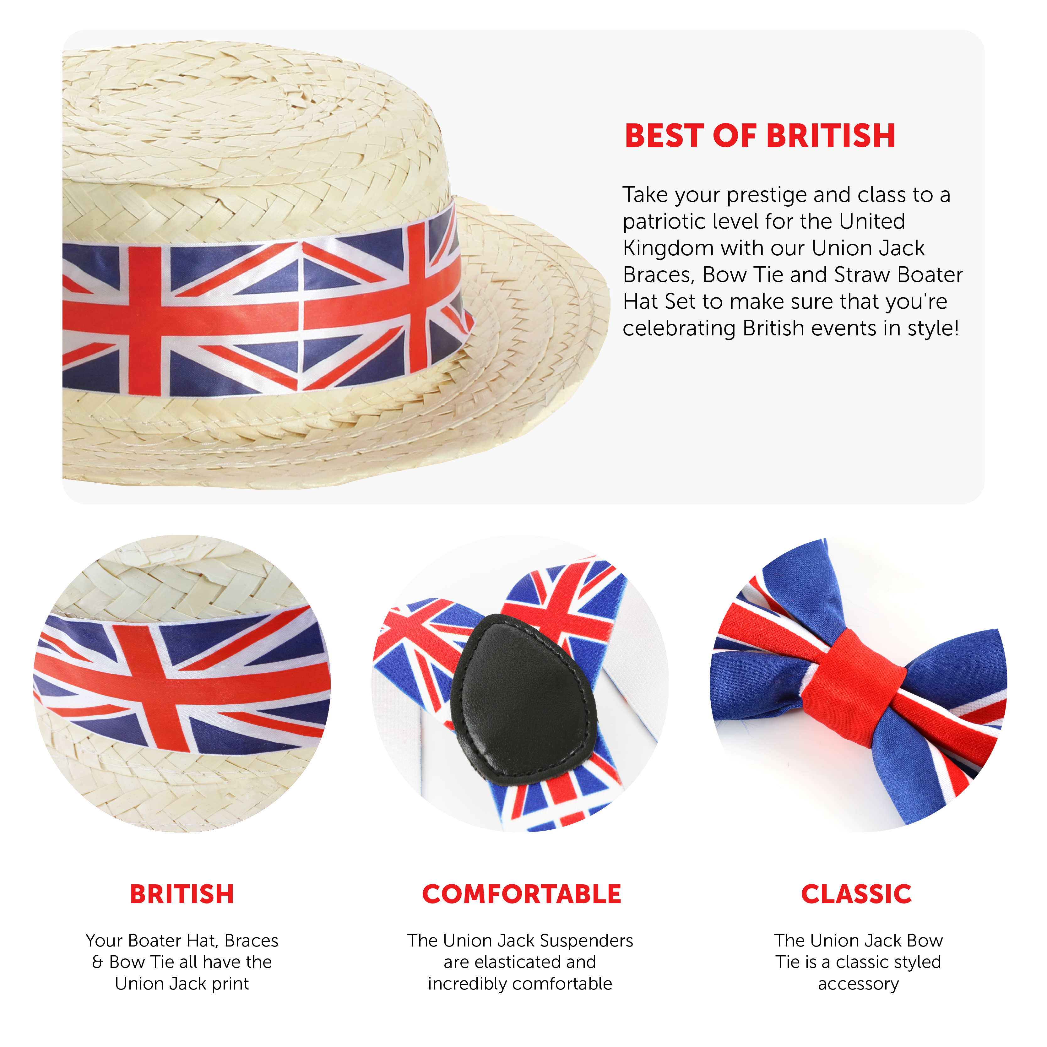 UNION JACK ACCESSORY SET: Take your prestige and class to a patriotic level for the United Kingdom with our Union Jack Braces, Bow Tie and Boater Hat Set to make sure that you're celebrating British events in style!