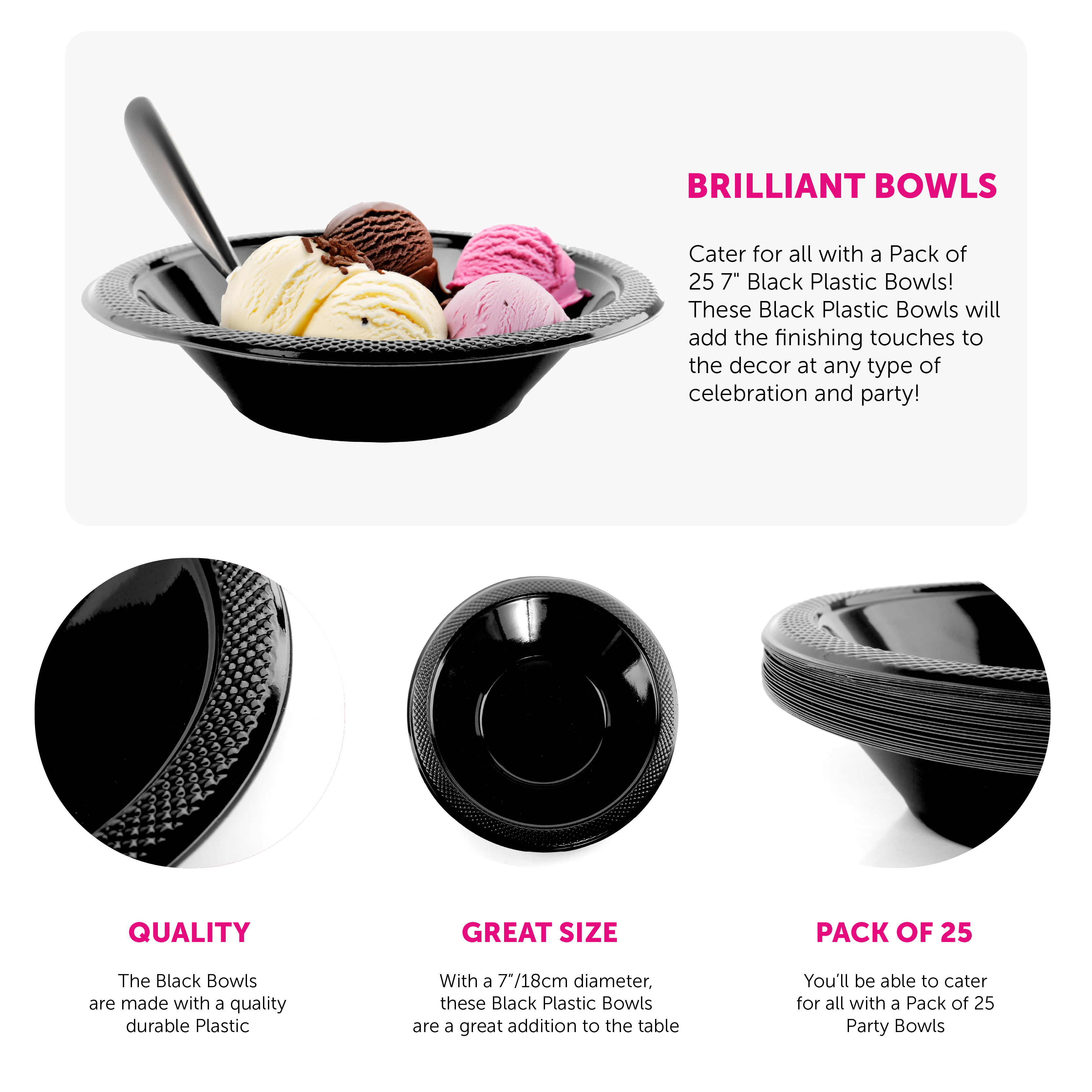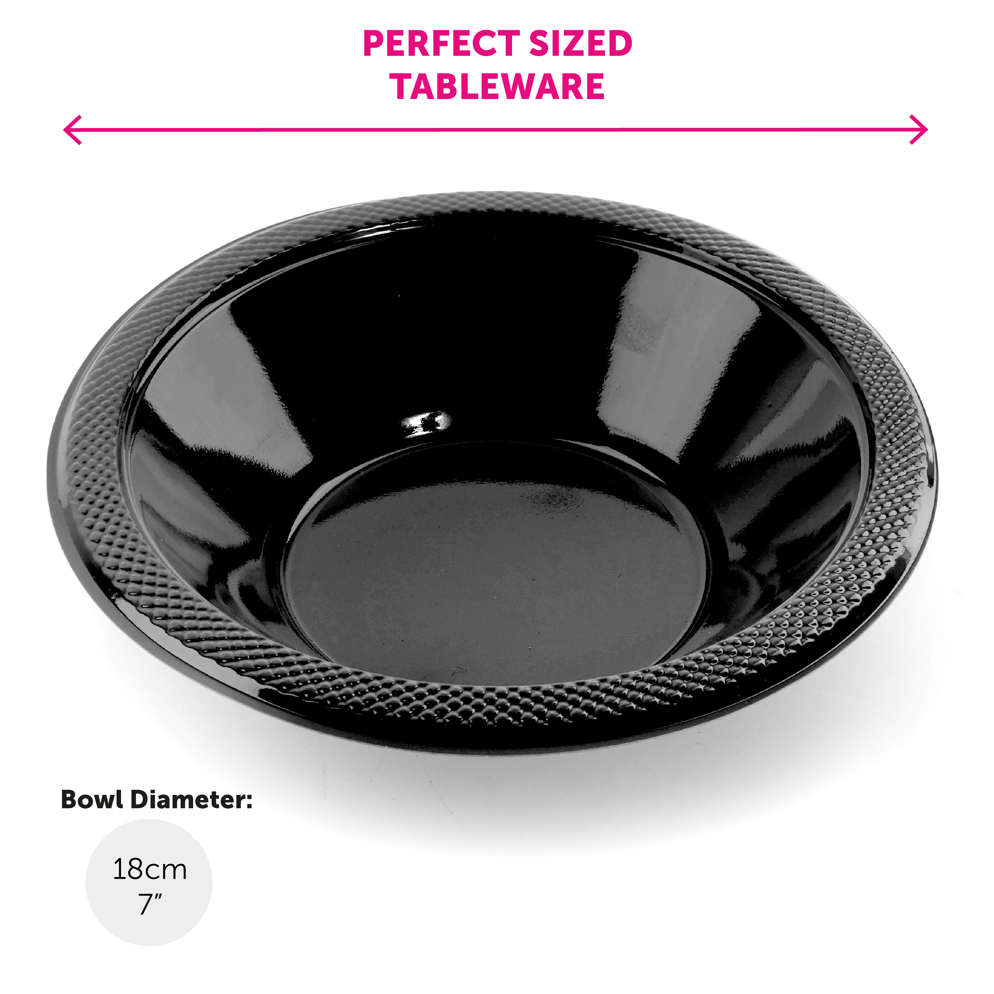 BOWL DETAILS: These Party Bowls are quality made, deep Black Plastic Bowls with a patterned edge, the perfect addition to finish off the party decor!