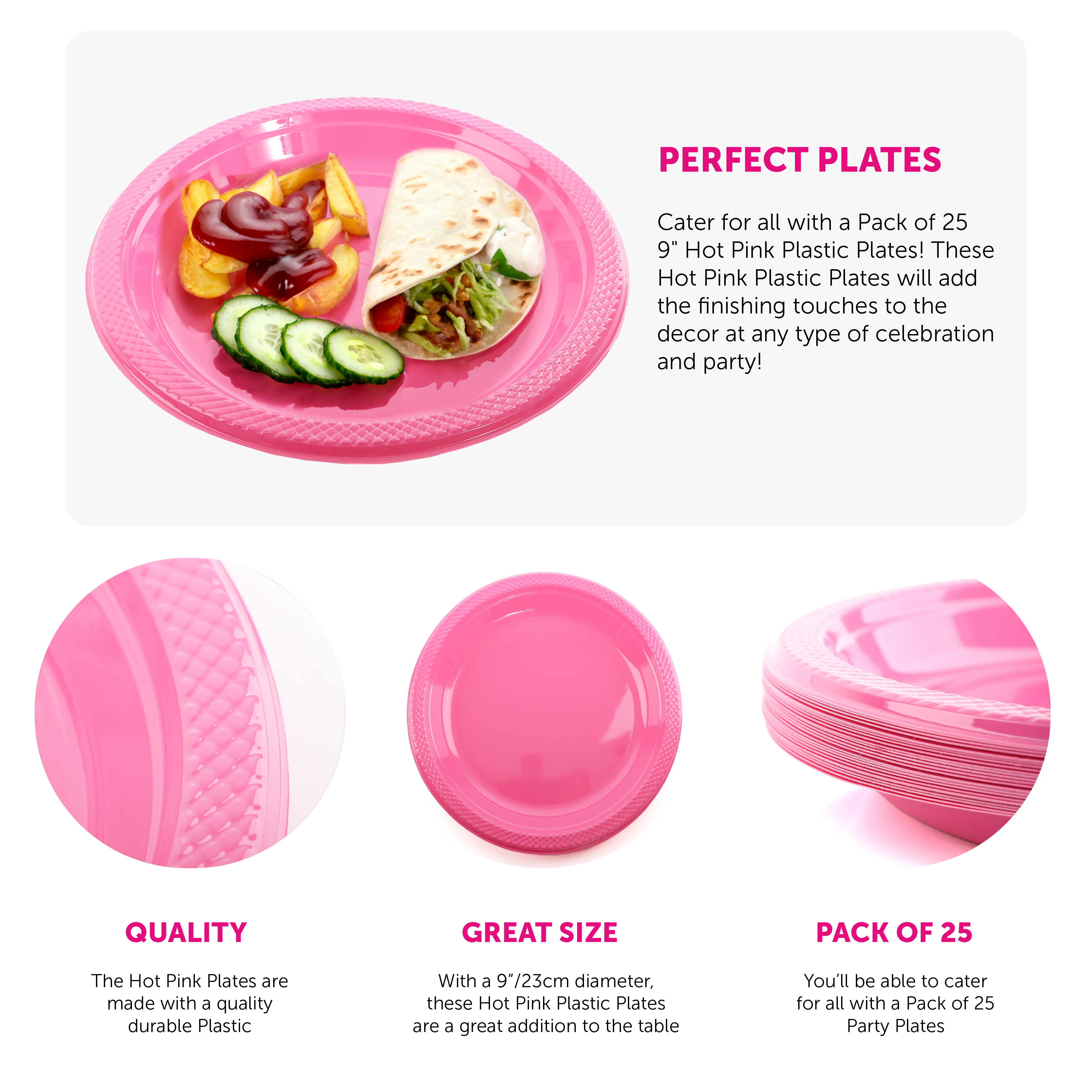 PLATE DETAILS: These Party Plates are quality made, Hot Pink Plastic Plates with a patterned edge, the perfect addition to finish off the party decor!