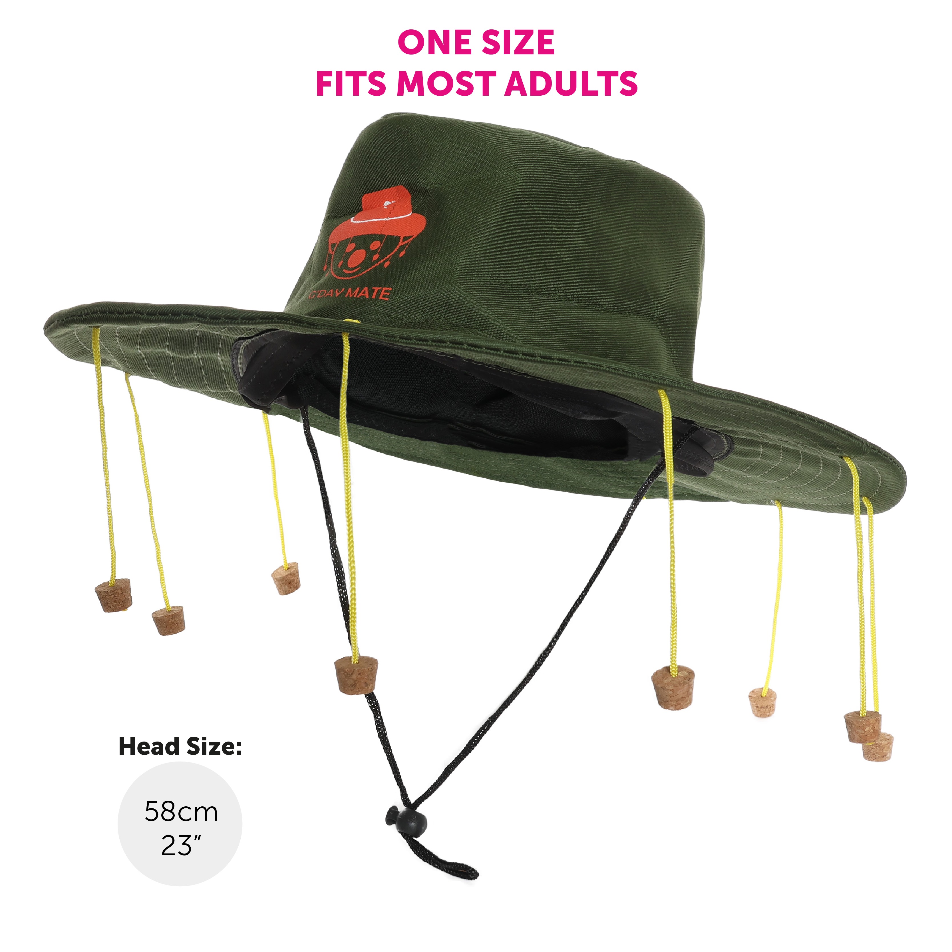 - Green cork hat with yellow kangaroo print reading “AUSTRALIA”