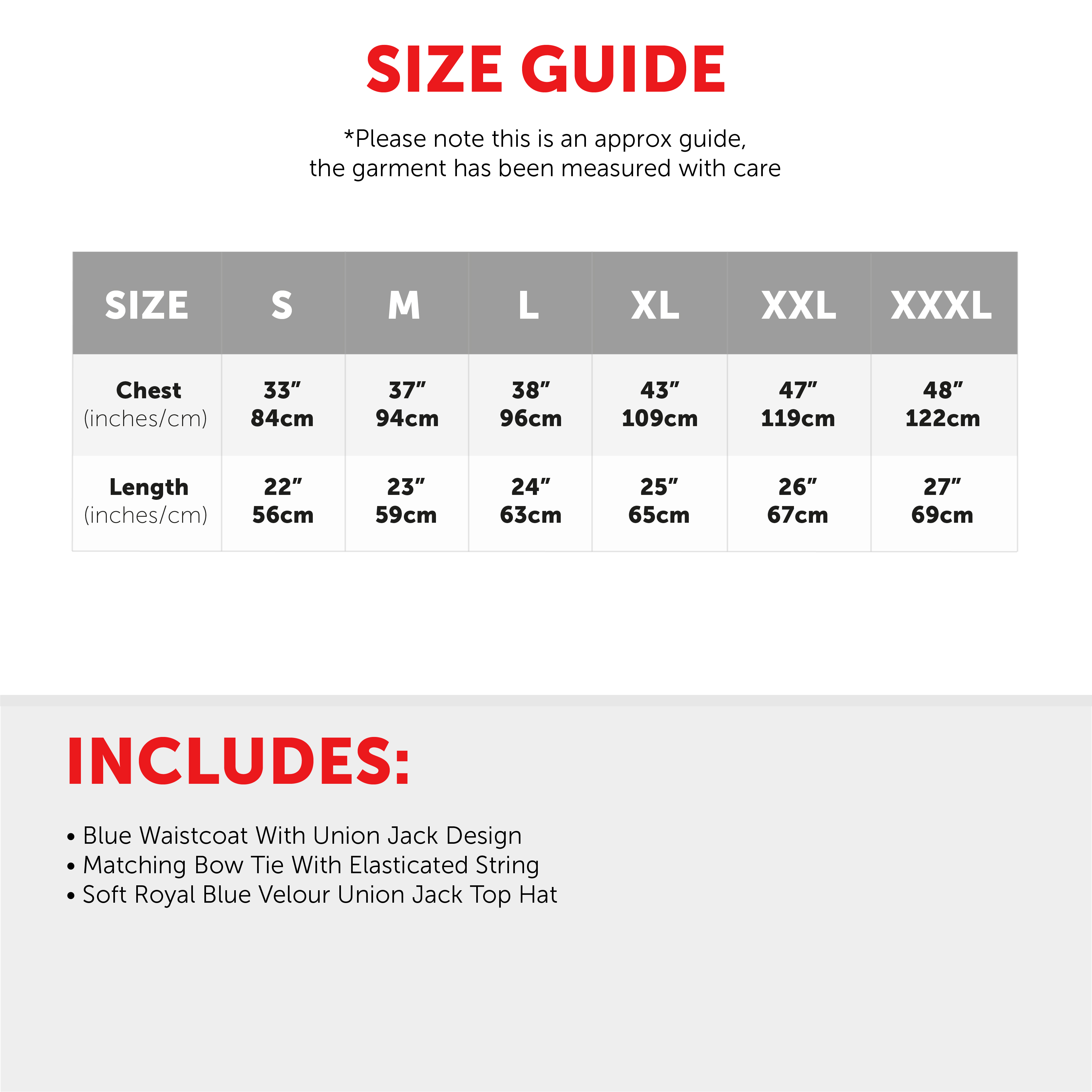 AVAILABLE IN MULTIPLE SIZES: The Union Jack Waistcoats are available in a variety of sizes, from Small to XXX-Large: Small - Chest 33” (84cm), Length 22” (56cm) | Medium - Chest 37" (94cm), Length 23” (59cm) | Large - Chest 38" (96cm), Length 24” (63cm) | X-Large - Chest 43” (109cm), Length 25” (65cm) | XX-Large - Chest 47” (119cm), Length 26” (67cm) | XXX-Large - Chest 48” (122cm), Length 27” (69cm)