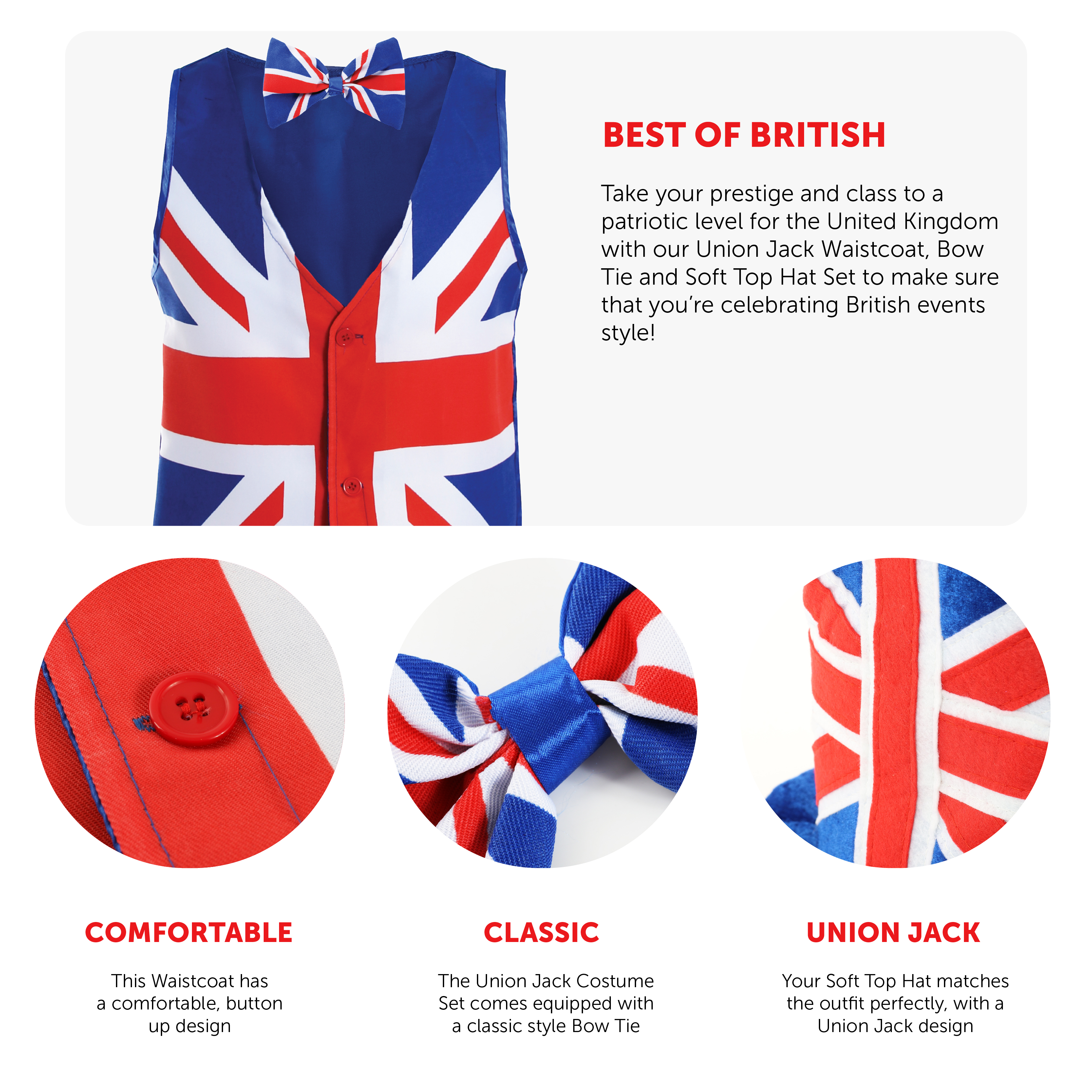 UNION JACK COSTUME INCLUDES: Your Union Jack Costume Set includes a stylish Union Jack Waistcoat with button detail, as well as a matching Union Jack Bow Tie, and a Royal Blue velour Top Hat with a Union Jack Flag stitched across the front, for any British events!