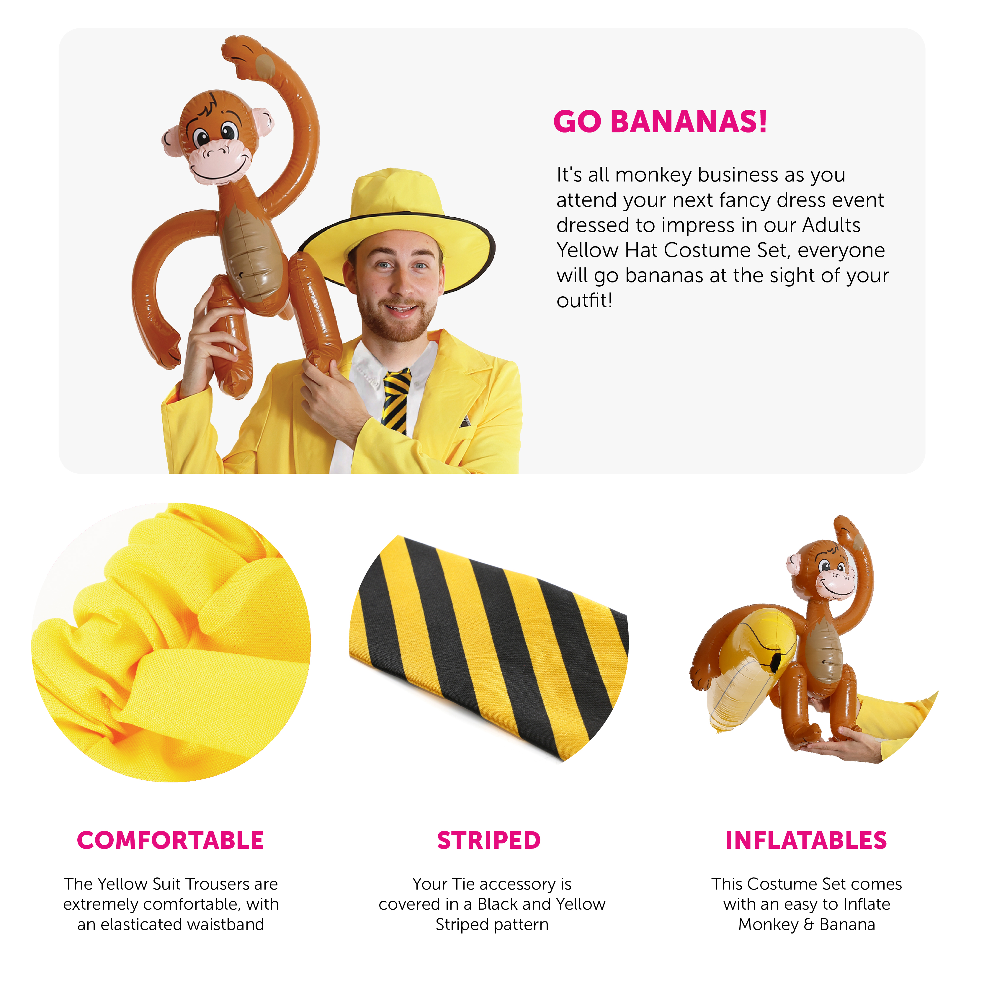 COSTUME INCLUDES: Your Adults Yellow Hat Costume includes a Yellow Top Hat with a contrasting black band, a matching two-piece Yellow Suit with a long Jacket and Trousers, a Black and Yellow Striped Necktie, an Inflatable Banana and an Inflatable Monkey!
