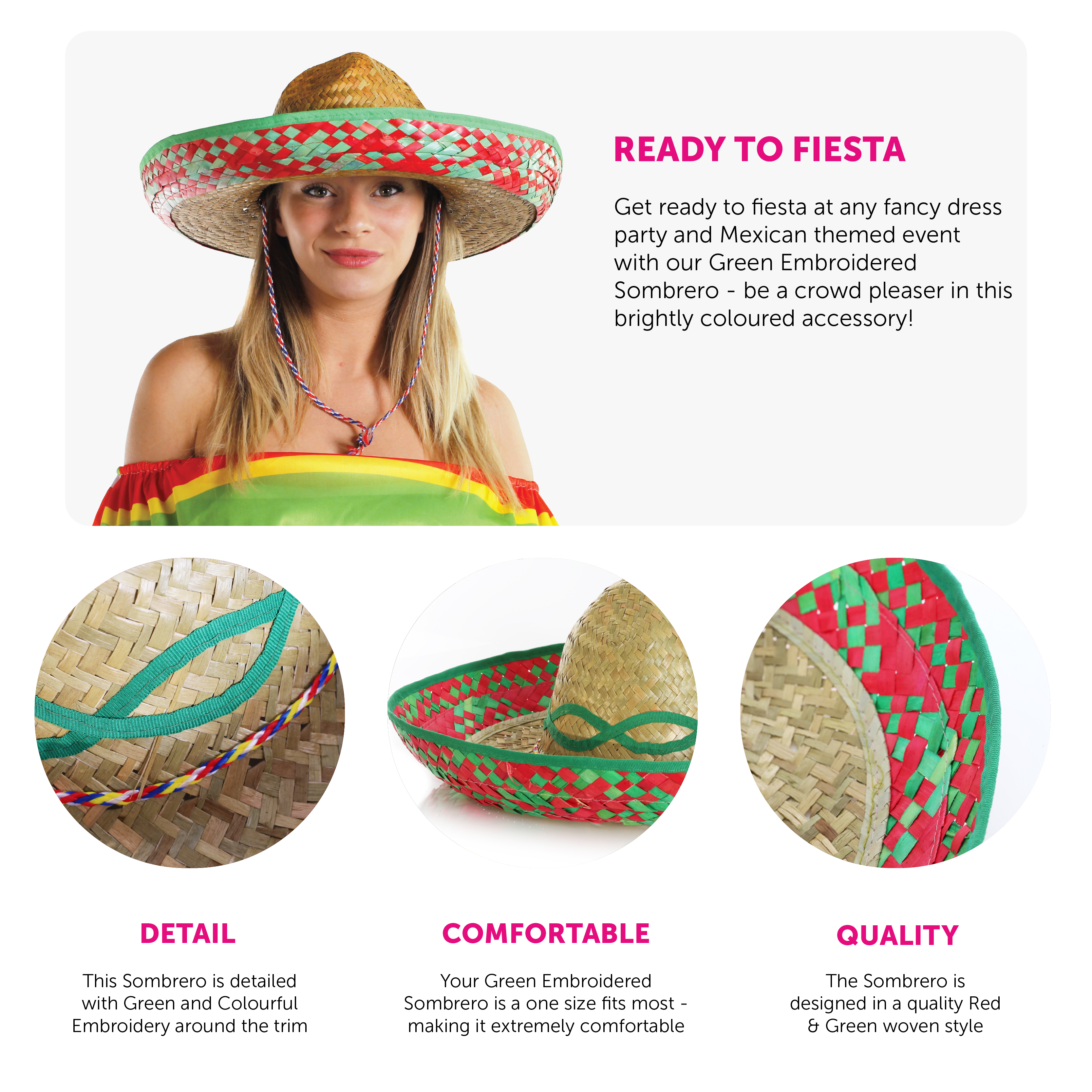 GREEN EMBROIDERED SOMBRERO HAT: Take the fiesta and life of the party with you wherever you go for your next big event or occasion with our Green Embroidered Sombrero Hat and liven up any party or gathering!