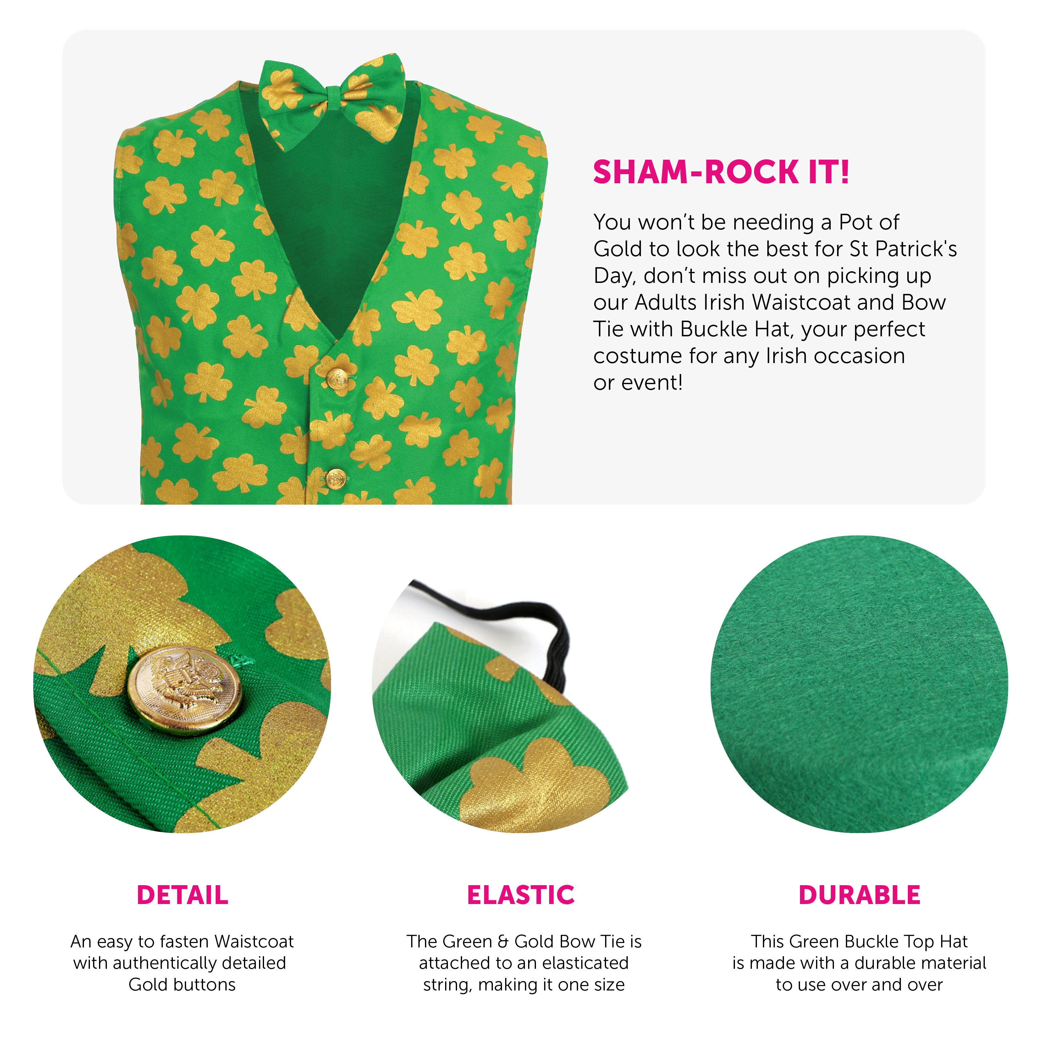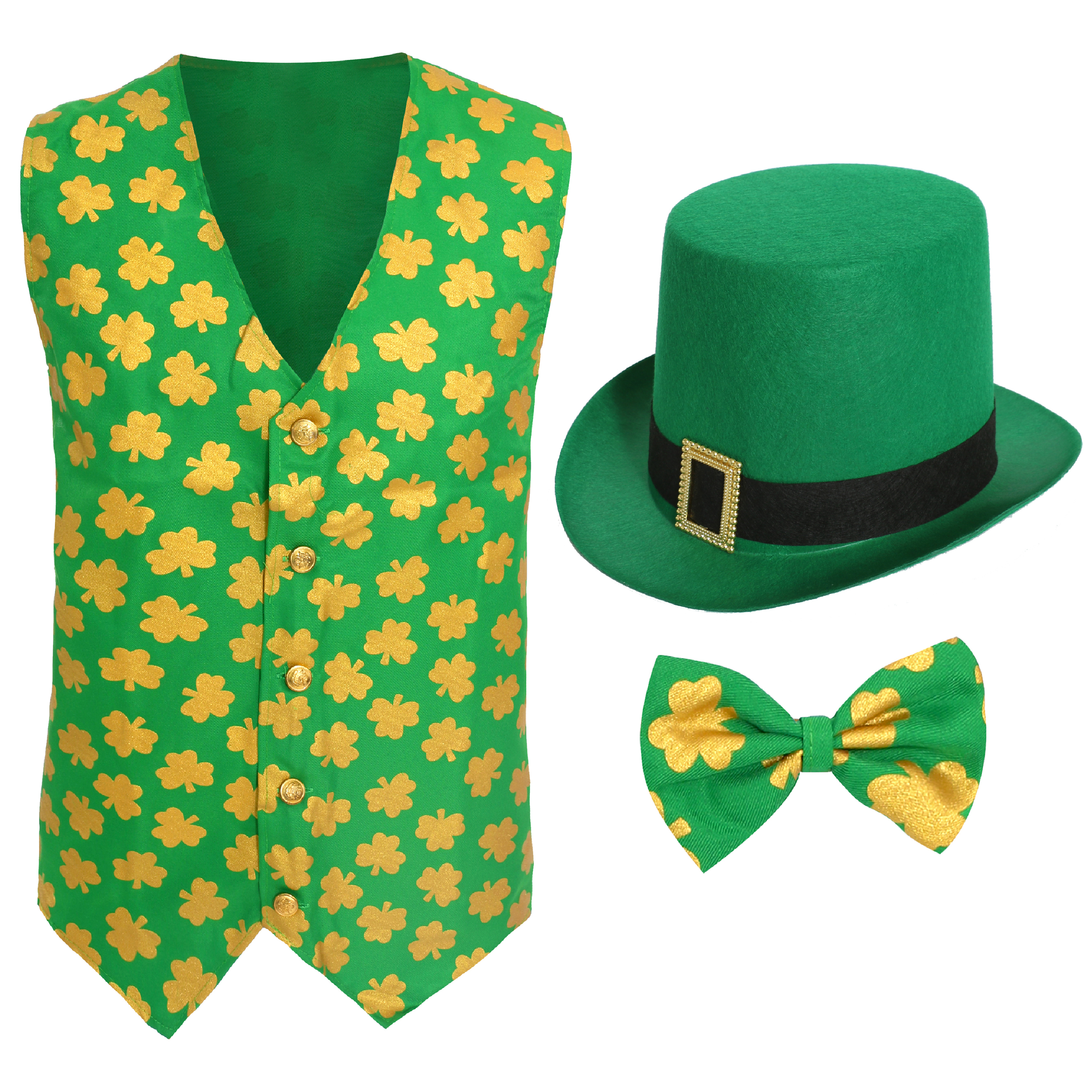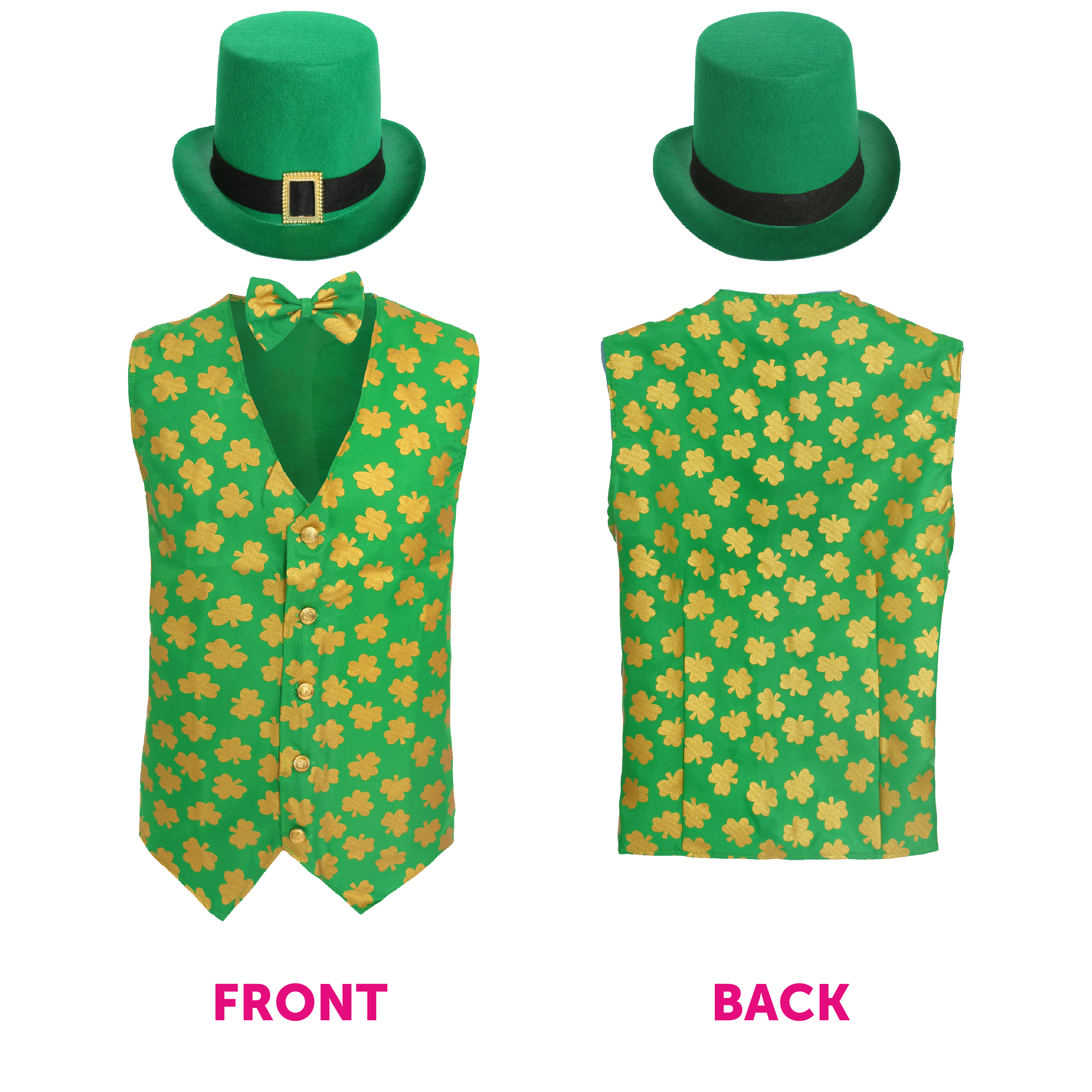 COSTUME DETAILS: This Adults Irish Costume includes a Green Irish Waistcoat with a Golden Shamrock Print all over, a Matching Bow Tie on an elastic string, and a Green Top Hat with a Gold Buckle, to finish off your Irish themed outfit perfectly!