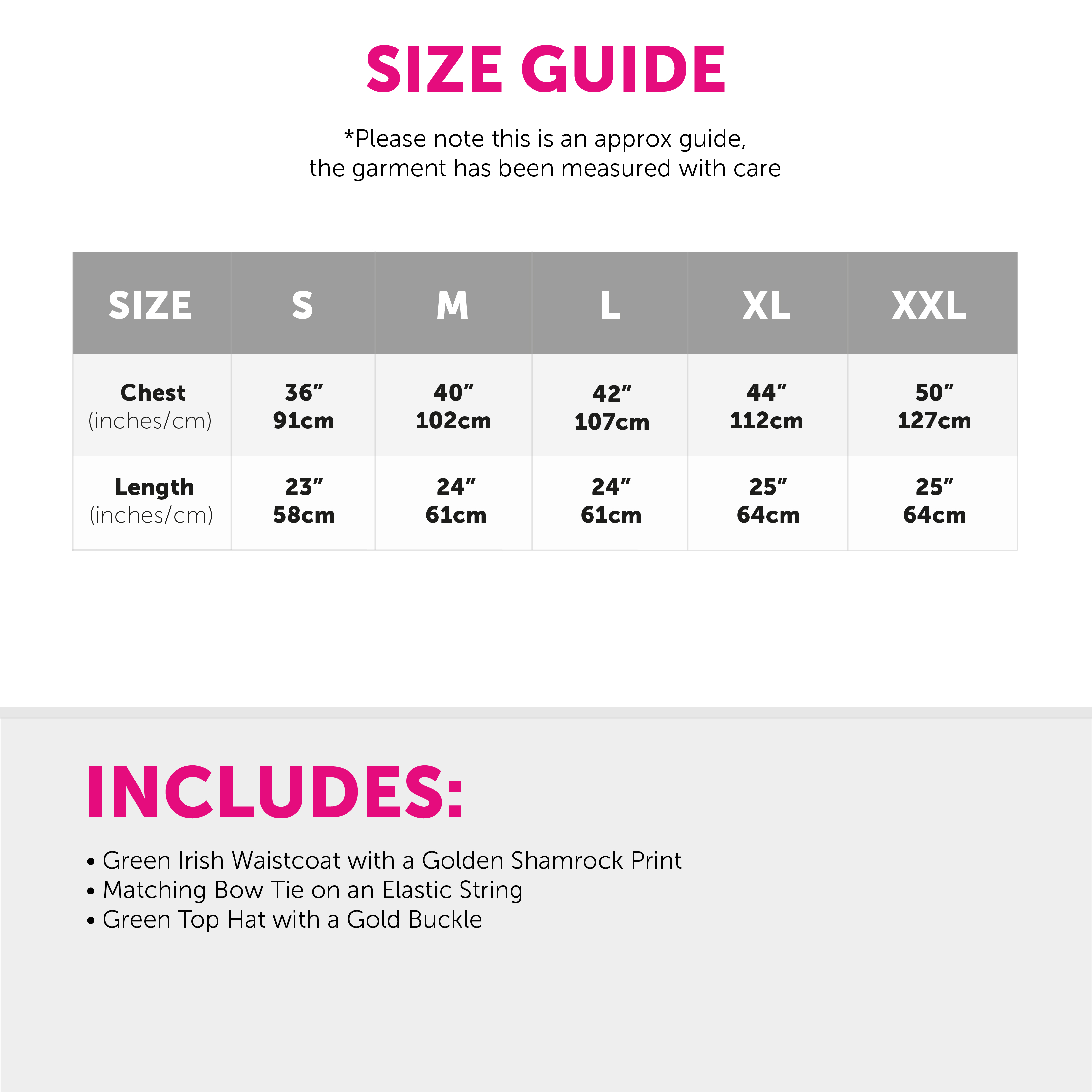 AVAILABLE IN MULTIPLE SIZES: The Irish Waistcoat Costume is available in multiple sizes from Small to XX-Large: Small - Chest 36" (91cm), Length 23" (58cm) | Medium - Chest 40" (102cm), Length 24" (61cm) | Large - Chest 42" (107cm), Length 24" (61cm) | X-Large - Chest 44" (112cm), Length 25" (64cm) | XX-Large - Chest 50" (127cm), Length 25" (64cm)