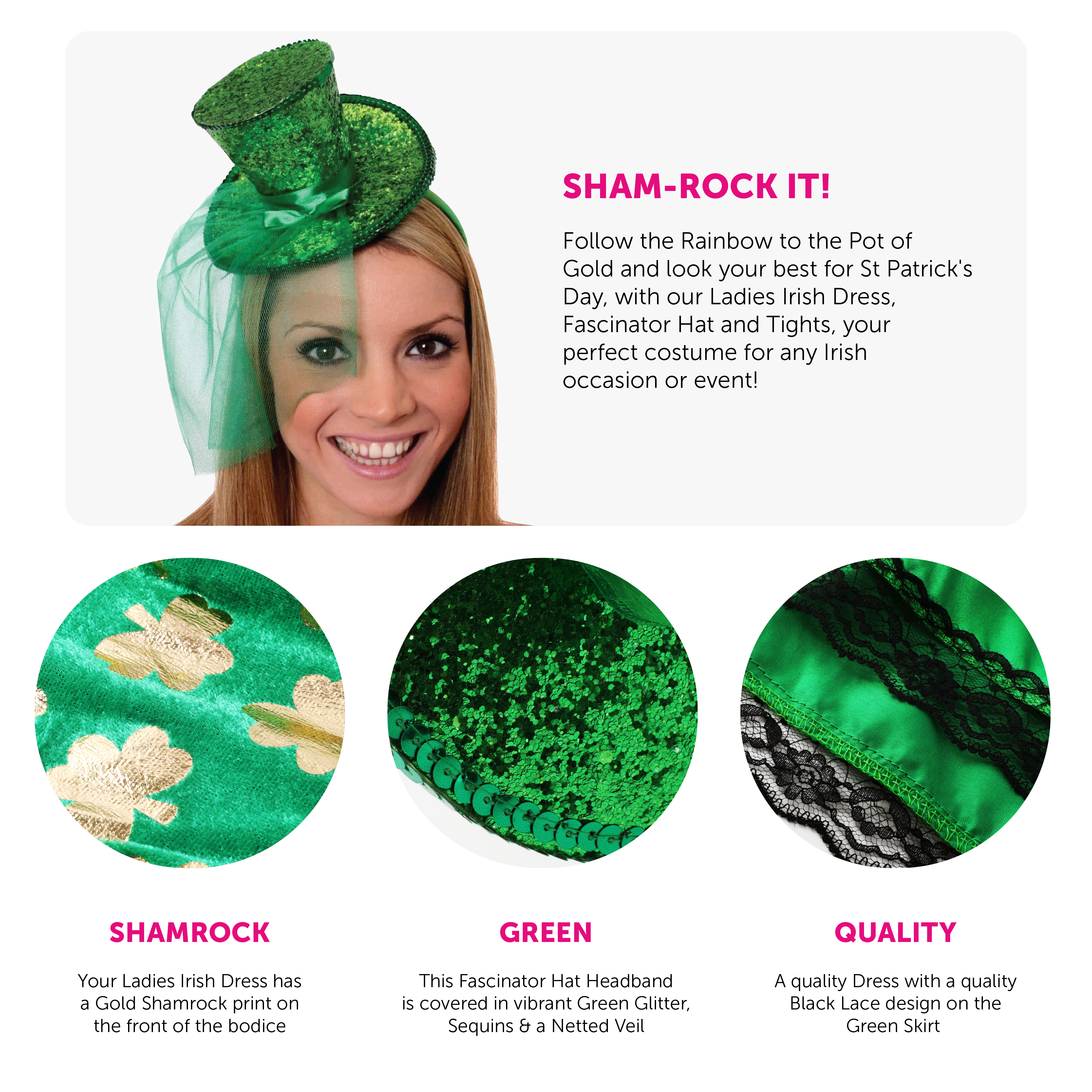 LADIES IRISH DRESS, FASCINATOR HAT & TIGHTS: Follow the Rainbow to the Pot of Gold and look your best for St Patrick's Day, with our Ladies Irish Dress, Fascinator Hat and Tights, your perfect costume for any Irish occasion or event!