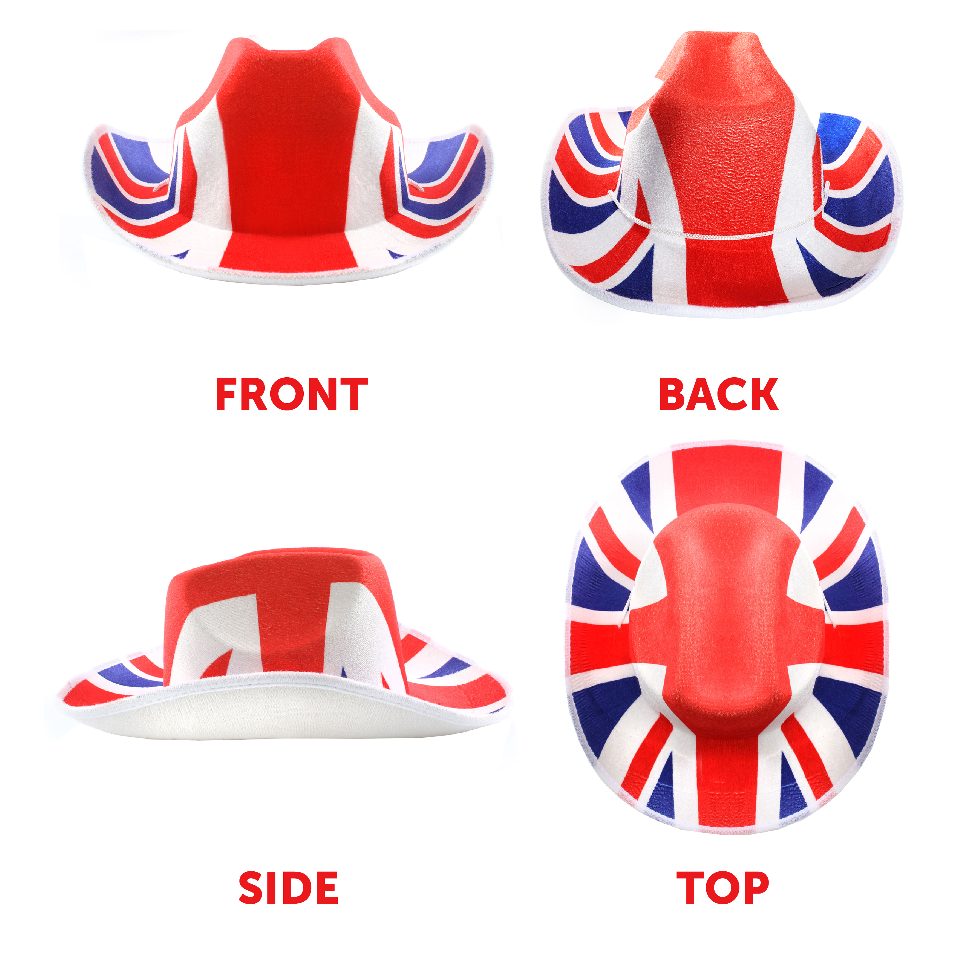 UNION JACK SET DETAILS: This Union Jack Set includes a classic shaped, felt Cowboy Hat with the Union Jack Flag design printed on top and matching adjustable Suspenders, with quality metal fastening clips, the perfect addition to any British themed event!