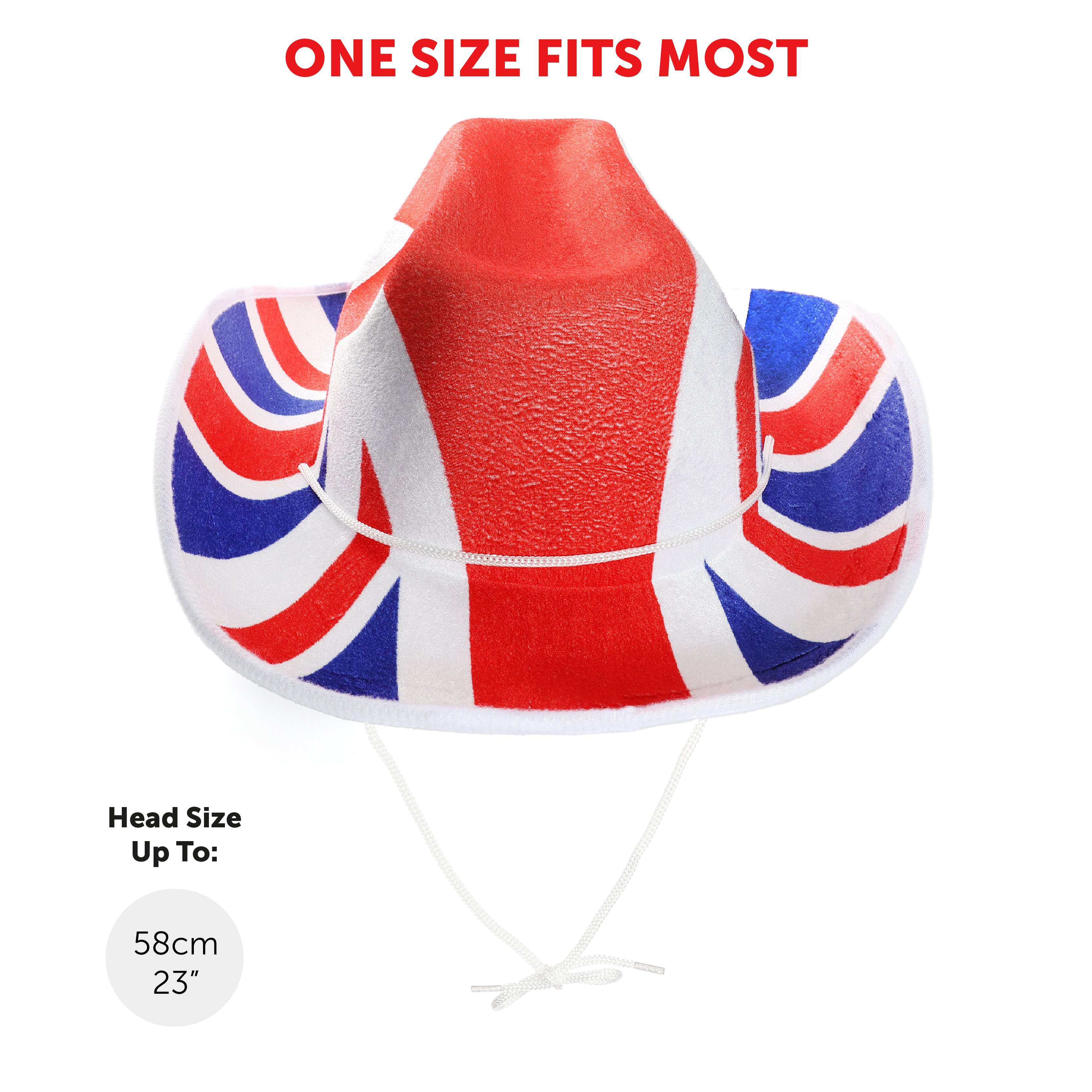 ONE SIZE FITS MOST: Being a very comfortable size for most, the Union Jack Cowboy Hats are a head size measuring in at 58cm (23"), and the matching Suspenders are adjustable for a comfortable fit, the perfect accessory for all things British!