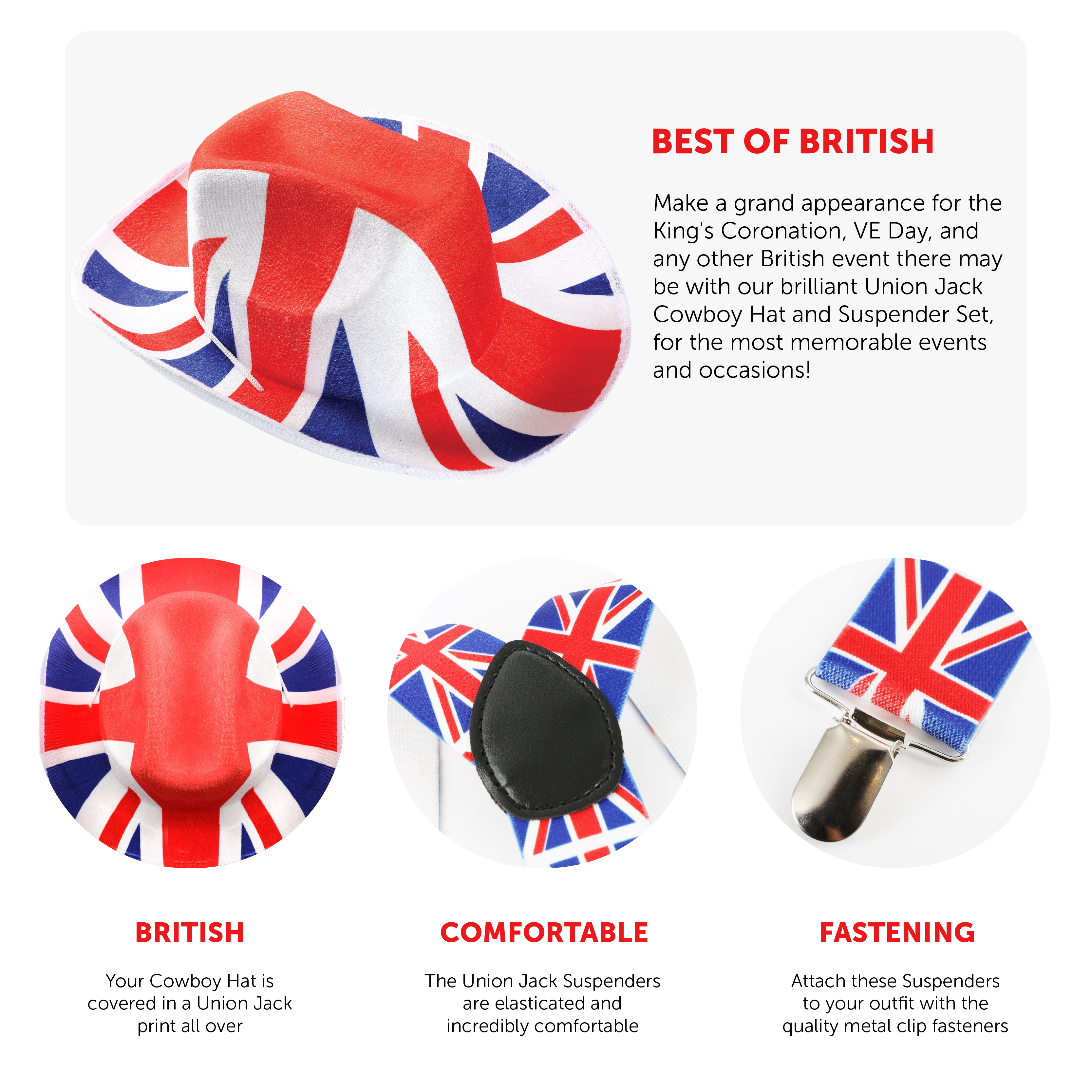 UNION JACK COWBOY HAT & SUSPENDERS: Make a grand appearance for the King's Coronation, VE Day, and any other British event there may be with our brilliant Union Jack Cowboy Hat and Suspender Set, for the most memorable events and occasions!