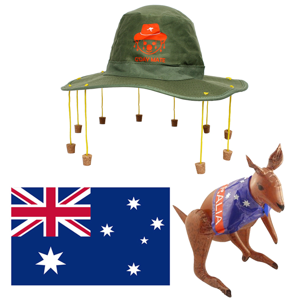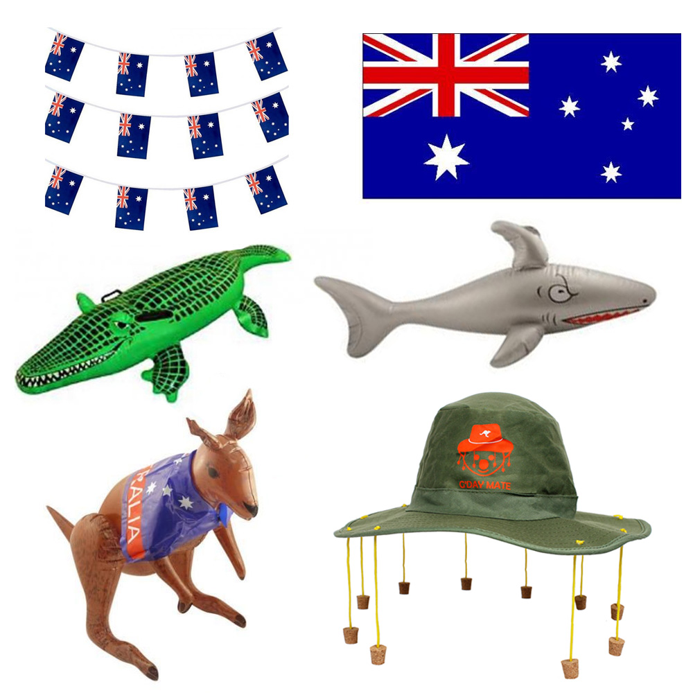 Take advantage of our already made up Aussie Party Packs! These packs are brilliant value for money! Pack one includes; Australia Flag, Bunting, Inflatable Shark, Crocodile, Kangaroo and an Aussie Cork Hat! Pack two, as simple choice Includes; Australian Flag Cape, Kangaroo Hat, Aussie Flag and Aussie Bunting!