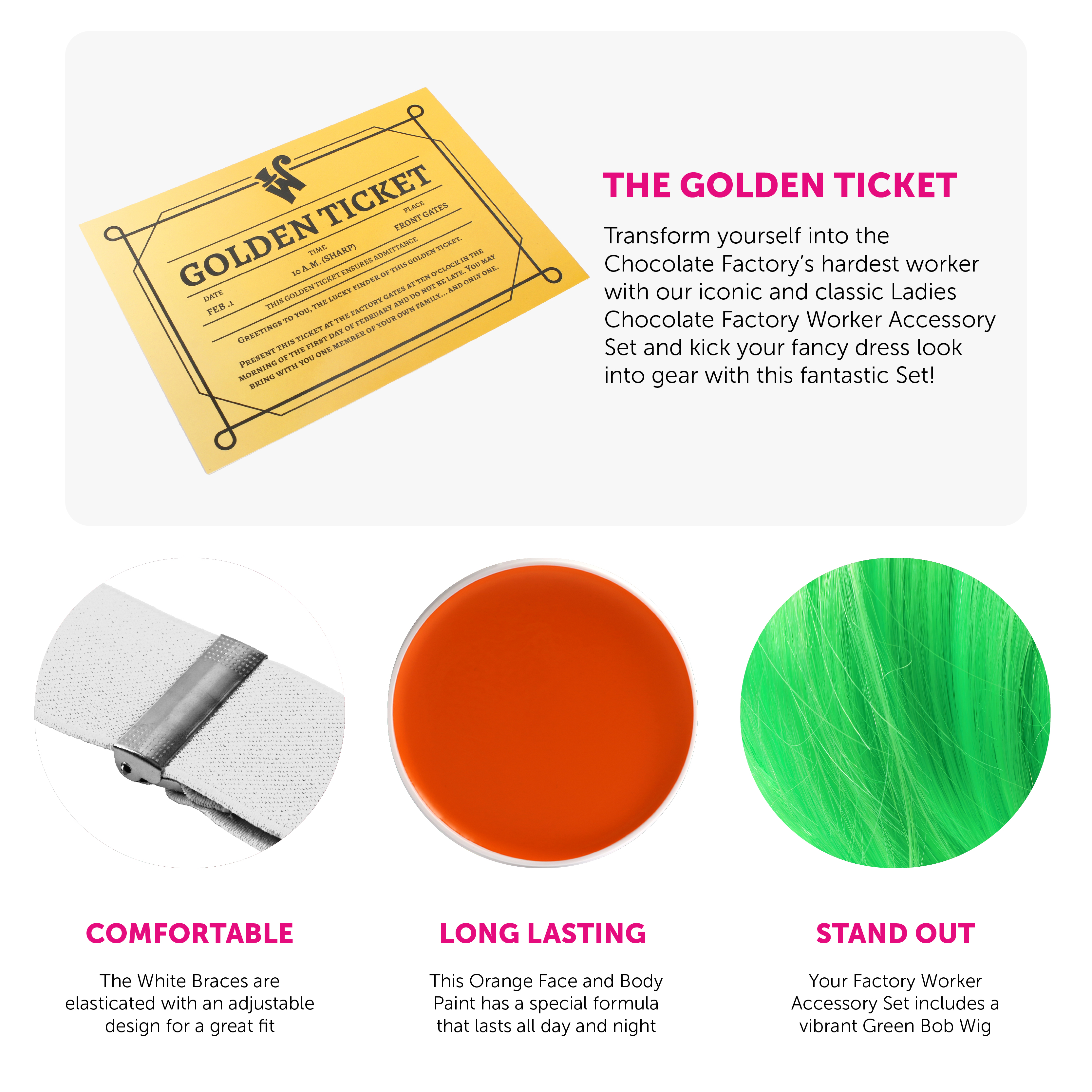 SET INCLUDES: The Ladies Factory Worker Accessory Set includes a Green Bob Wig, White Gloves, adjustable and elasticated White Braces with Metal Clips, a palette of Orange Face Paint, and an A5 Laminated Golden Ticket Prop, the perfect look for World Book Day this year!