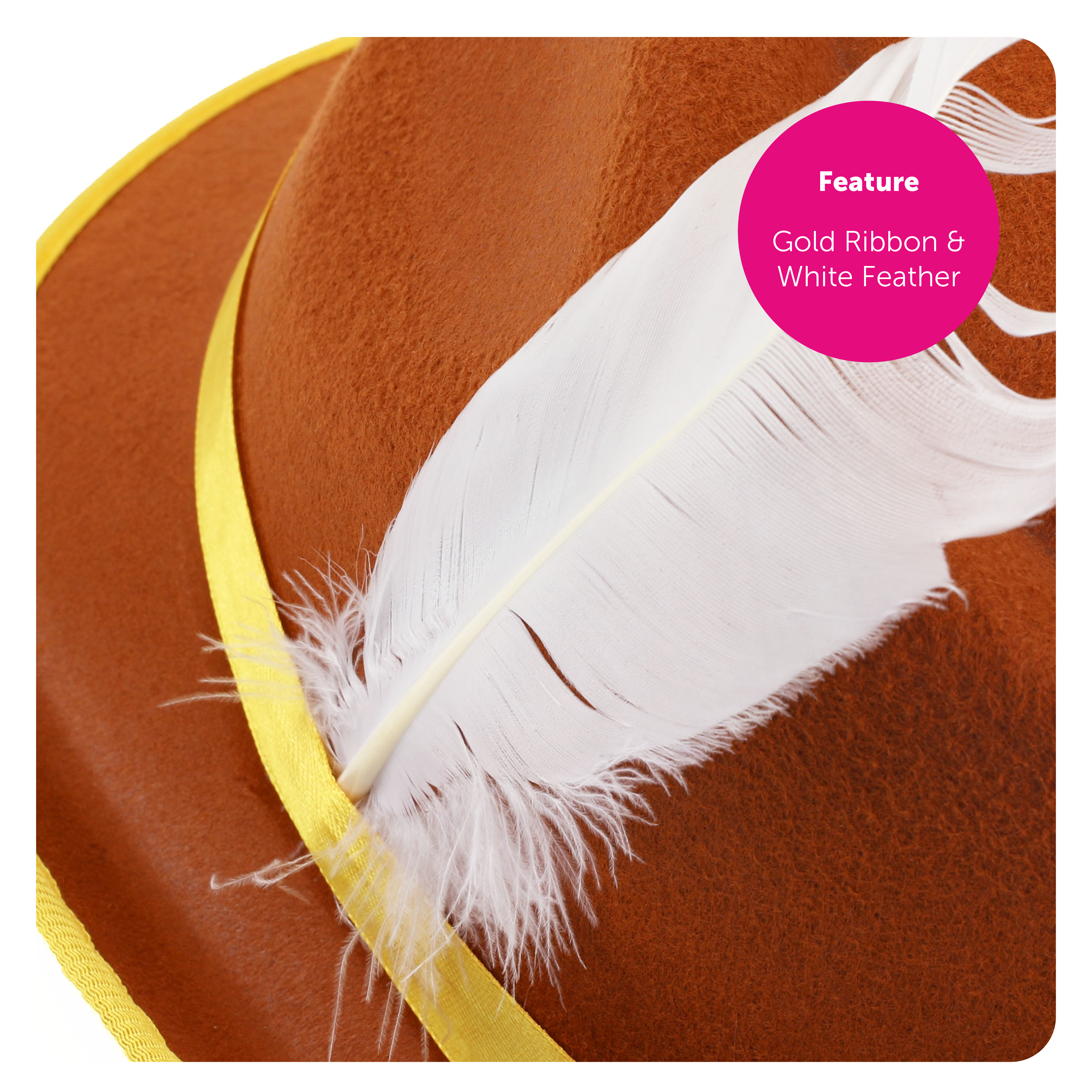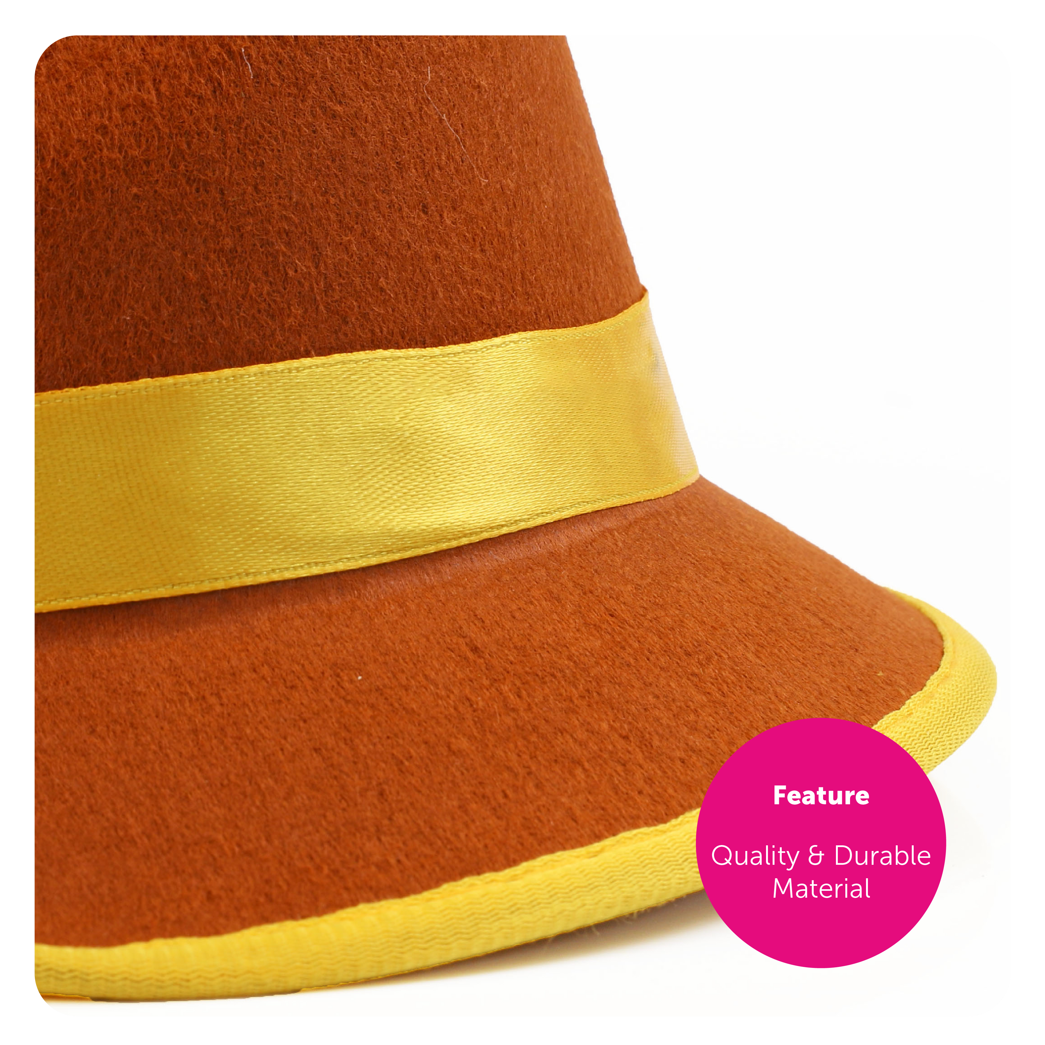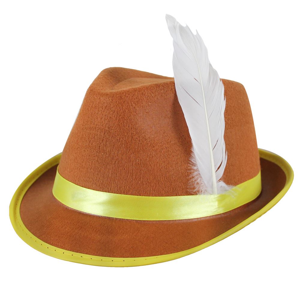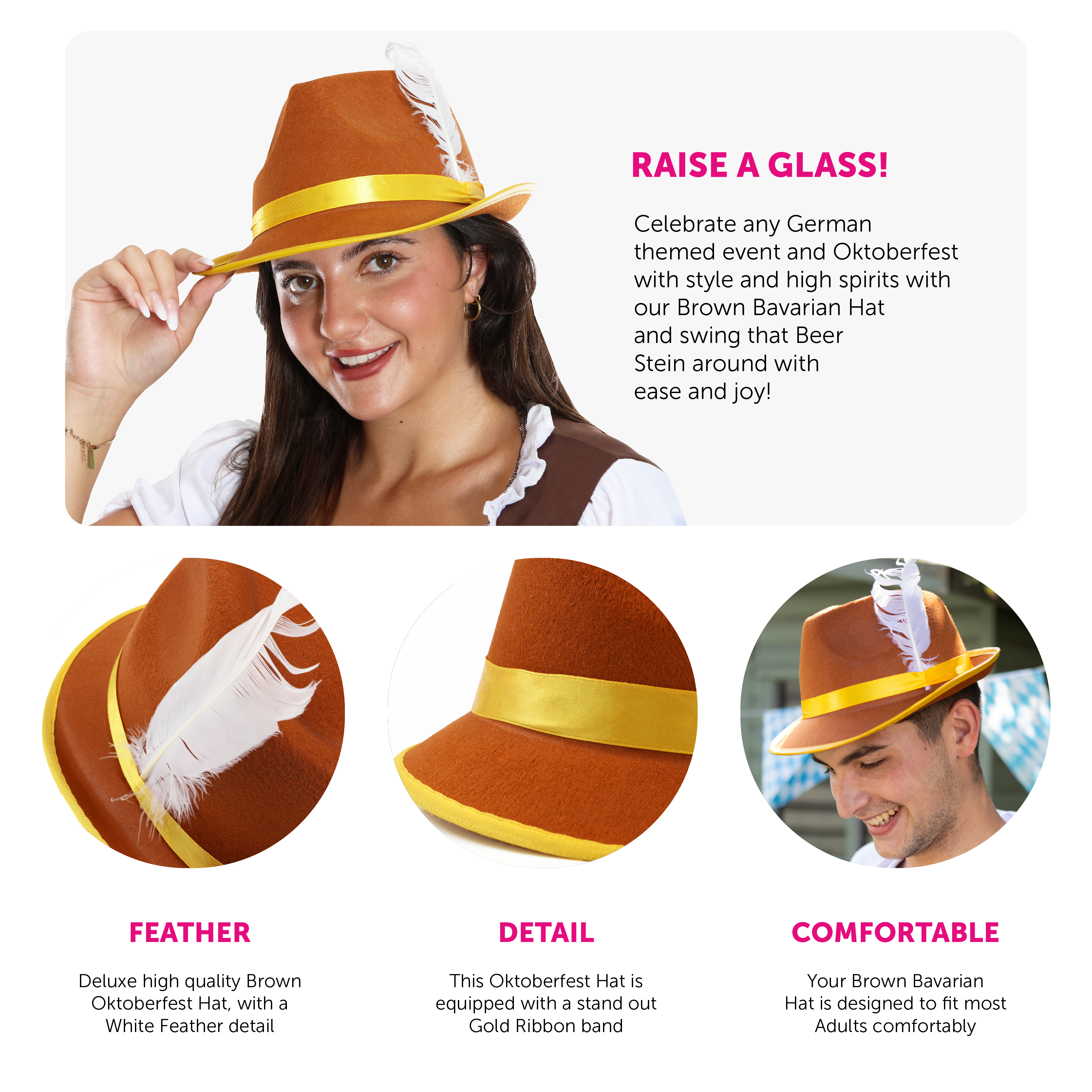 HAT DETAILS: Your Bavarian Hat is a deluxe high quality Brown Oktoberfest Hat, with a Gold Ribbon band, and with a White Feather detail to complete the look!