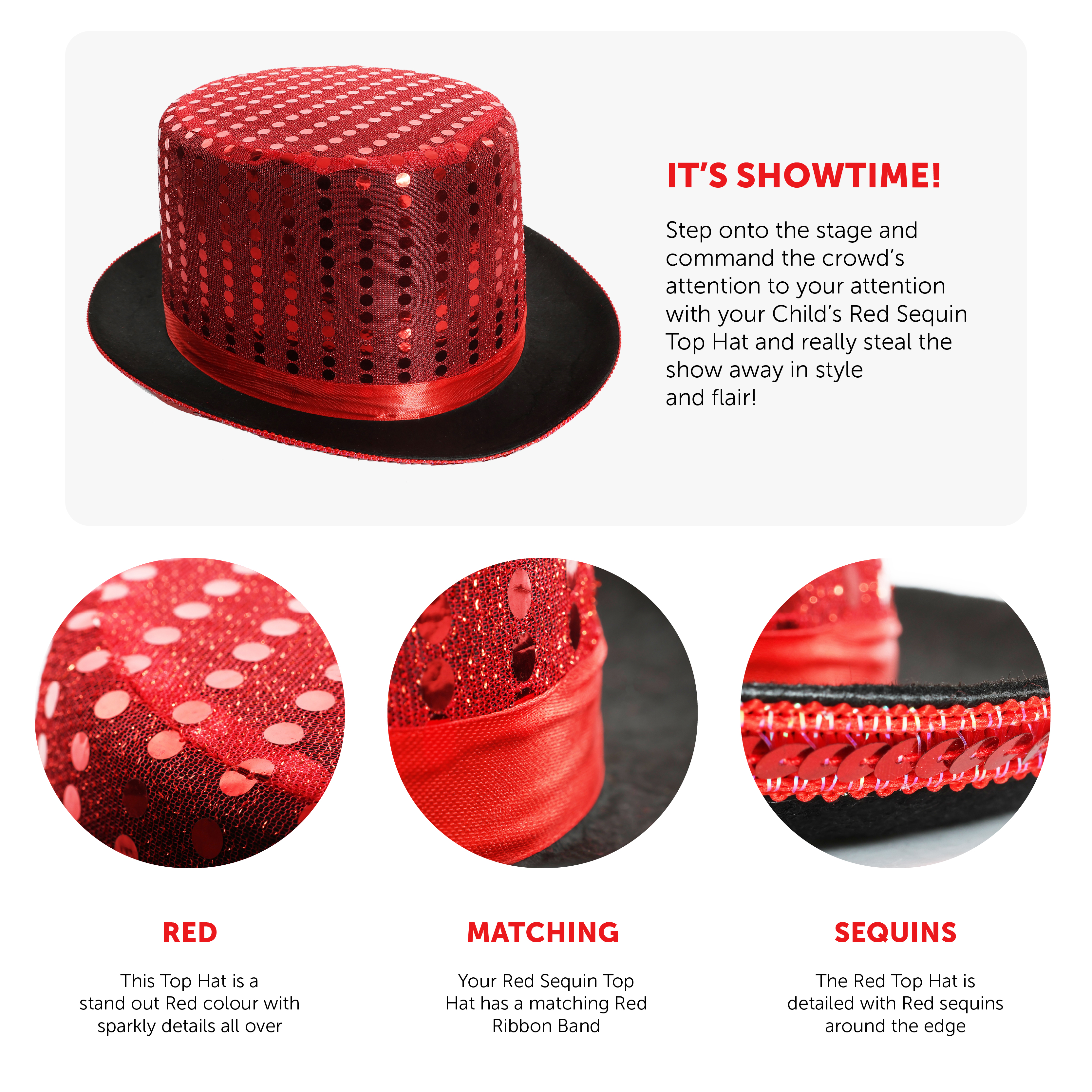 TOP HAT DETAILS: The classic Top Hat design has been brought back to life with a fantastic new style! Your Top Hat has a Red Satin quality material with matching Sequin details on the top, and a detailed trim!