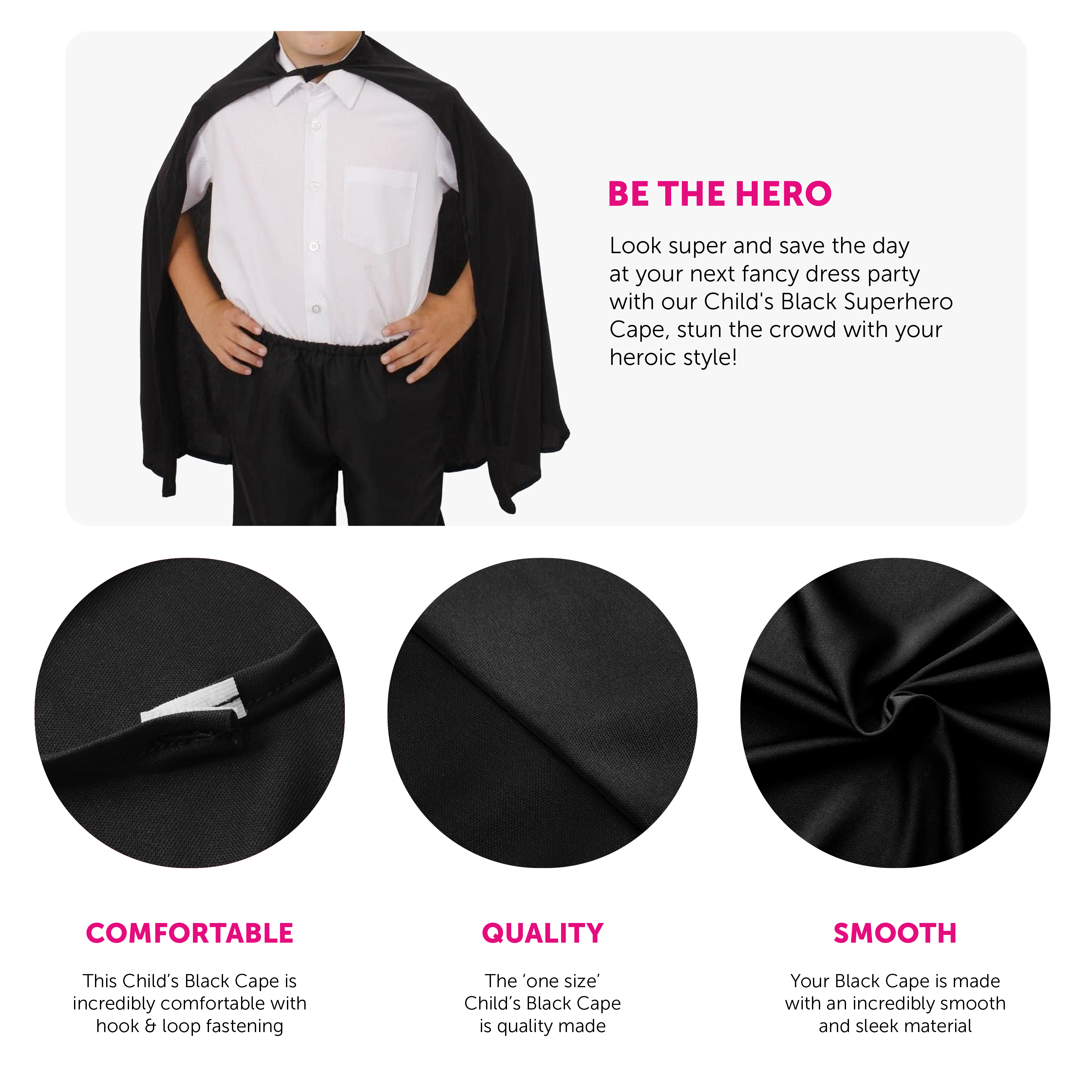 CHILD'S BLACK SUPERHERO CAPE: Look super and save the day at your next fancy dress party with our Child's Black Superhero Cape, stun the crowd with your heroic style!