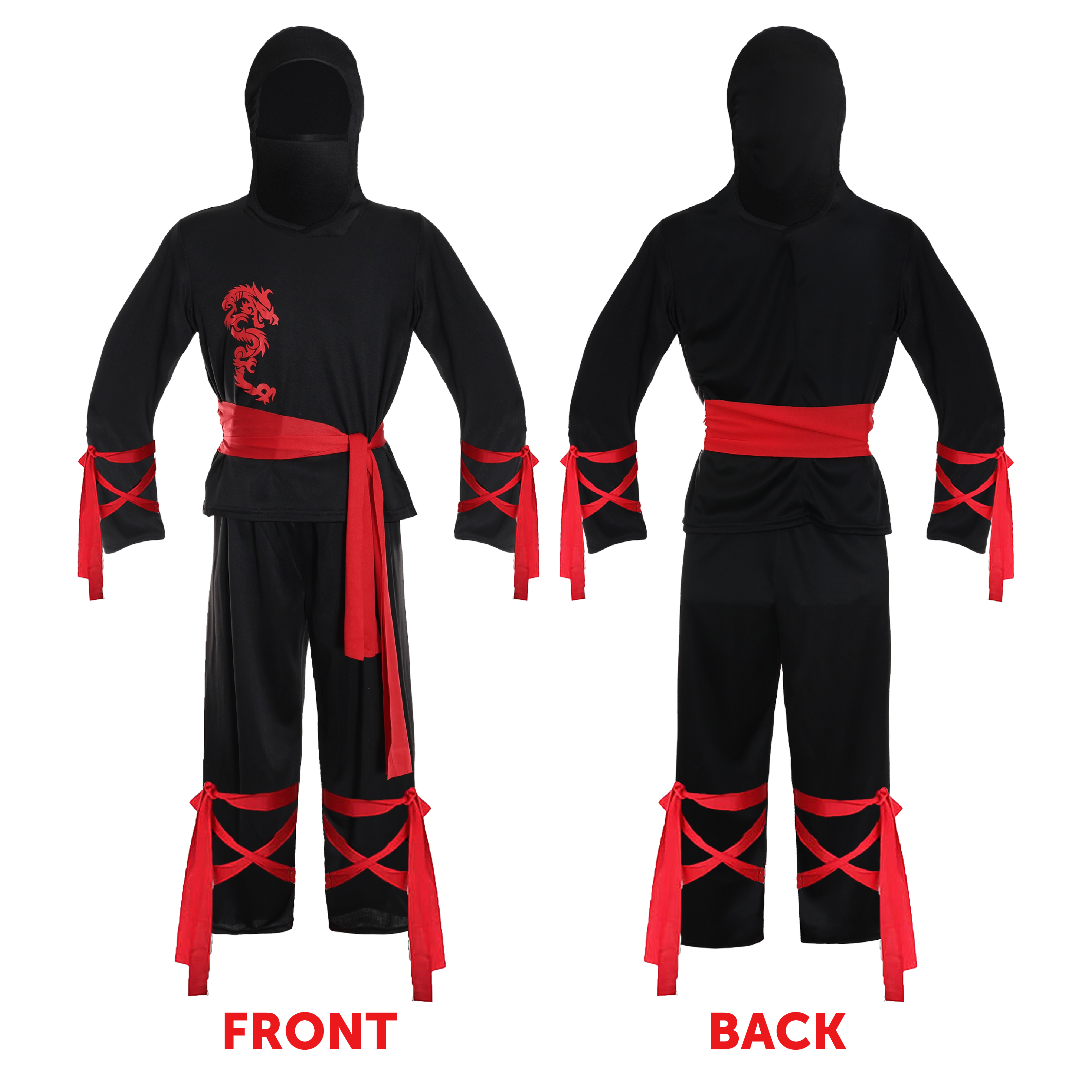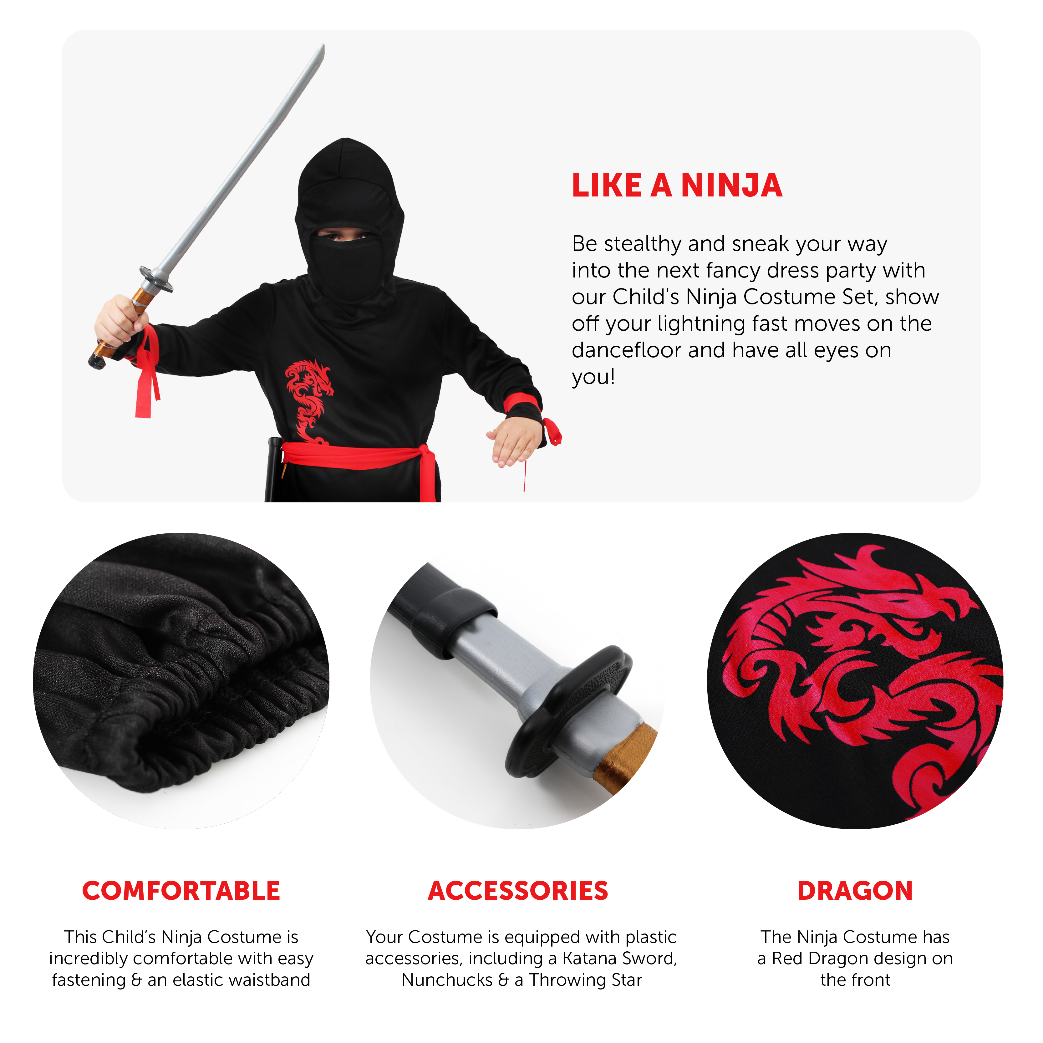 COSTUME INCLUDES: The Child's Ninja Costume includes a long sleeved Black Top with a Red Dragon Print and Red Wrist and Waist Ties, matching Black Trousers with Red Leg Ties, a Black Masked Hood, a Plastic Katana Ninja Sword with Scabbard, a set of Plastic Nunchucks, and a Plastic Throwing Star, the perfect Costume for any fancy dress event!