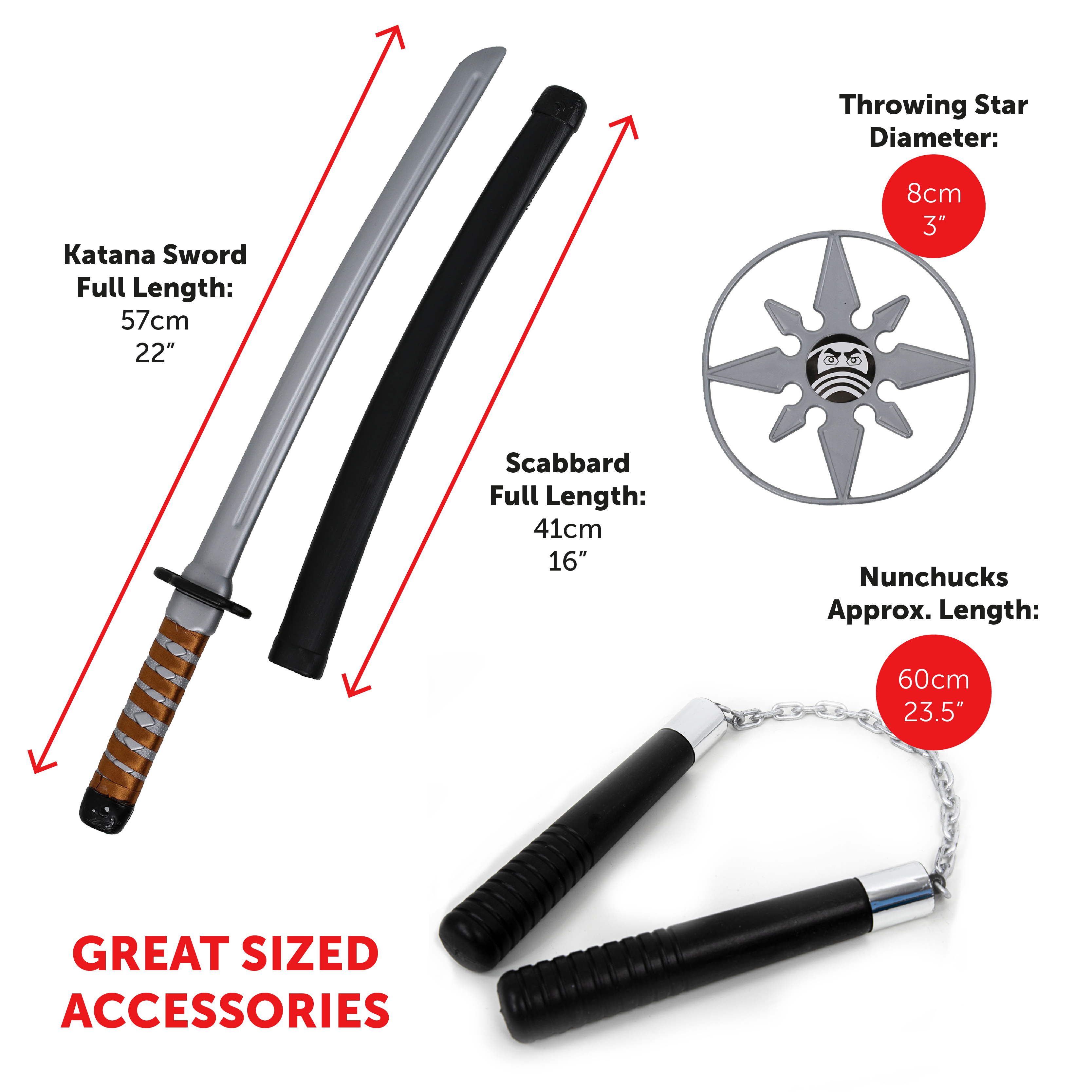 GREAT SIZE ACCESSORIES: All of the accessories included in this costume set are a great size, with the Plastic Katana Ninja Sword measuring a full length of 57cm (22") and the Scabbard covering measuring a full length 41cm (16")
