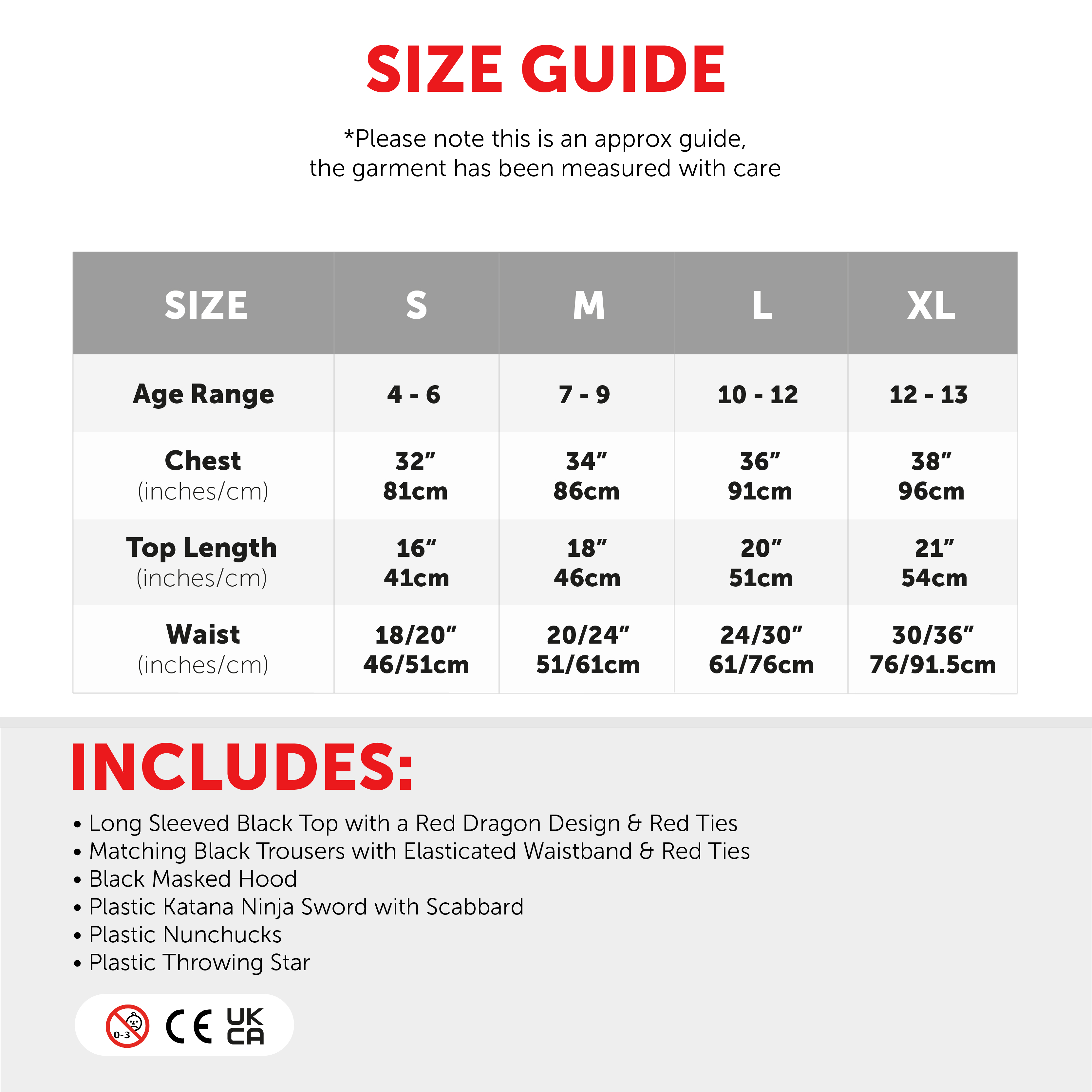 AVAILABLE IN MULTIPLE SIZES: Your Child's Ninja Costume is available in various sizes, ranging from Small to X-Large: Small - 4 - 6 years, Chest: 32" (81cm), Top Length: 16" (41cm), Waist: 18/20" (46/51cm) | Medium - 7 - 9 years, Chest: 34" (86cm), Top Length: 18" (46cm), Waist: 20/24" (51/61cm) | Large - 10 - 12 years, Chest: 36" (91cm), Top Length: 20" (51cm), Waist: 24/30" (61/76cm) | X-Large - 12 - 13 years, Chest: 38" (96cm), Top Length: 21" (54cm), Waist: 30/36" (76/91.5cm)
