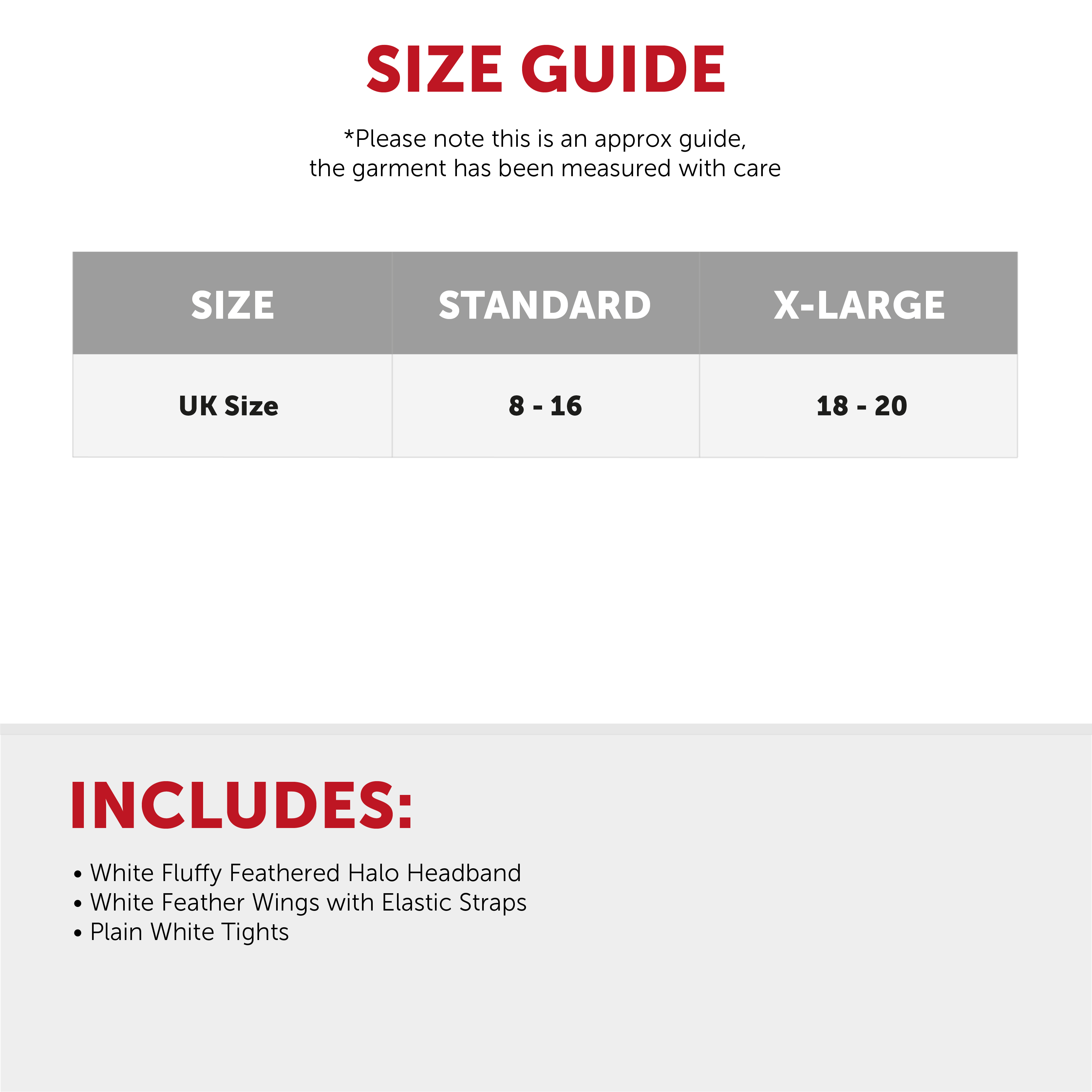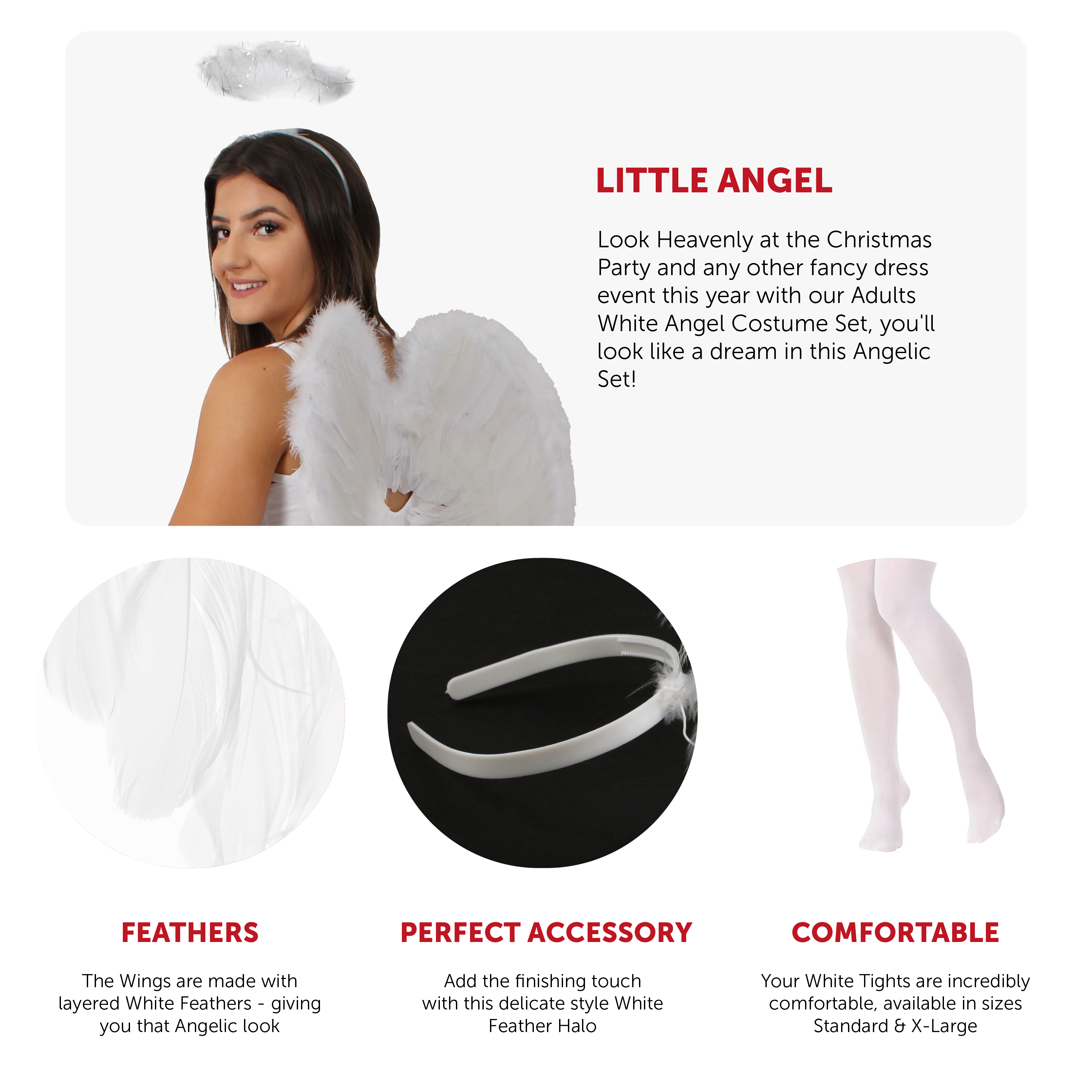 COSTUME DETAILS: Your Angel Costume Set includes a fluffy White Halo on a wire frame, attached to a White Headband, White Feather Angel Wings with elasticated straps, and a pair of Plain White Tights!