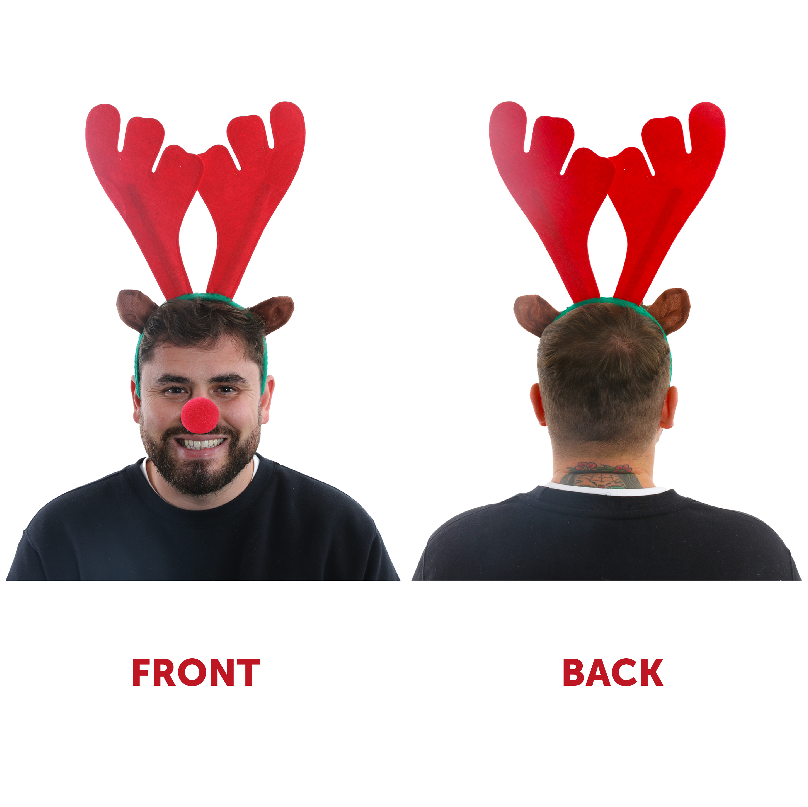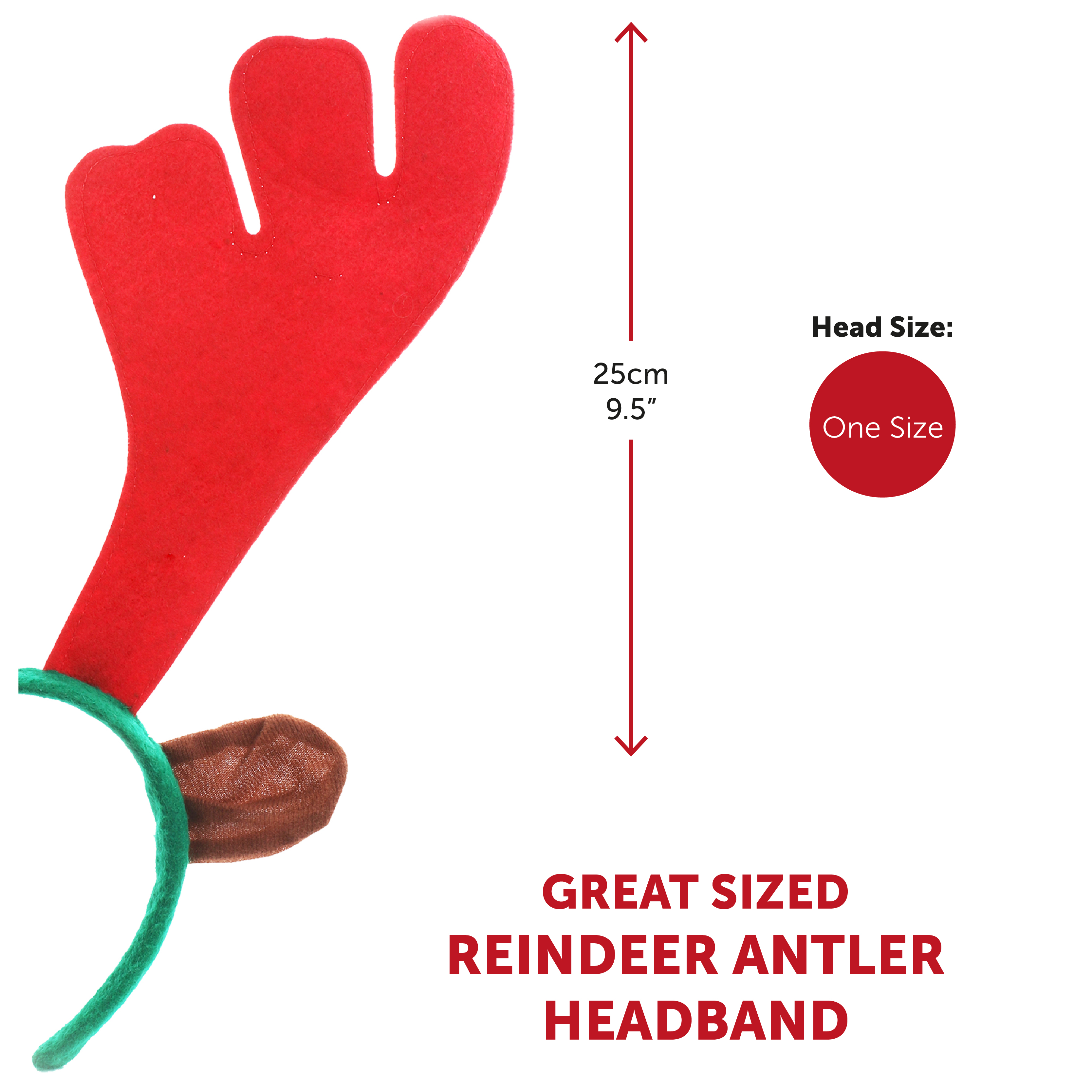SET INCLUDES: Our Reindeer Set includes a Red Antler Headband with Brown Ears attached to the sides, perfectly sized for Adults, and a Red Sponge Nose, the perfect festive look this year!