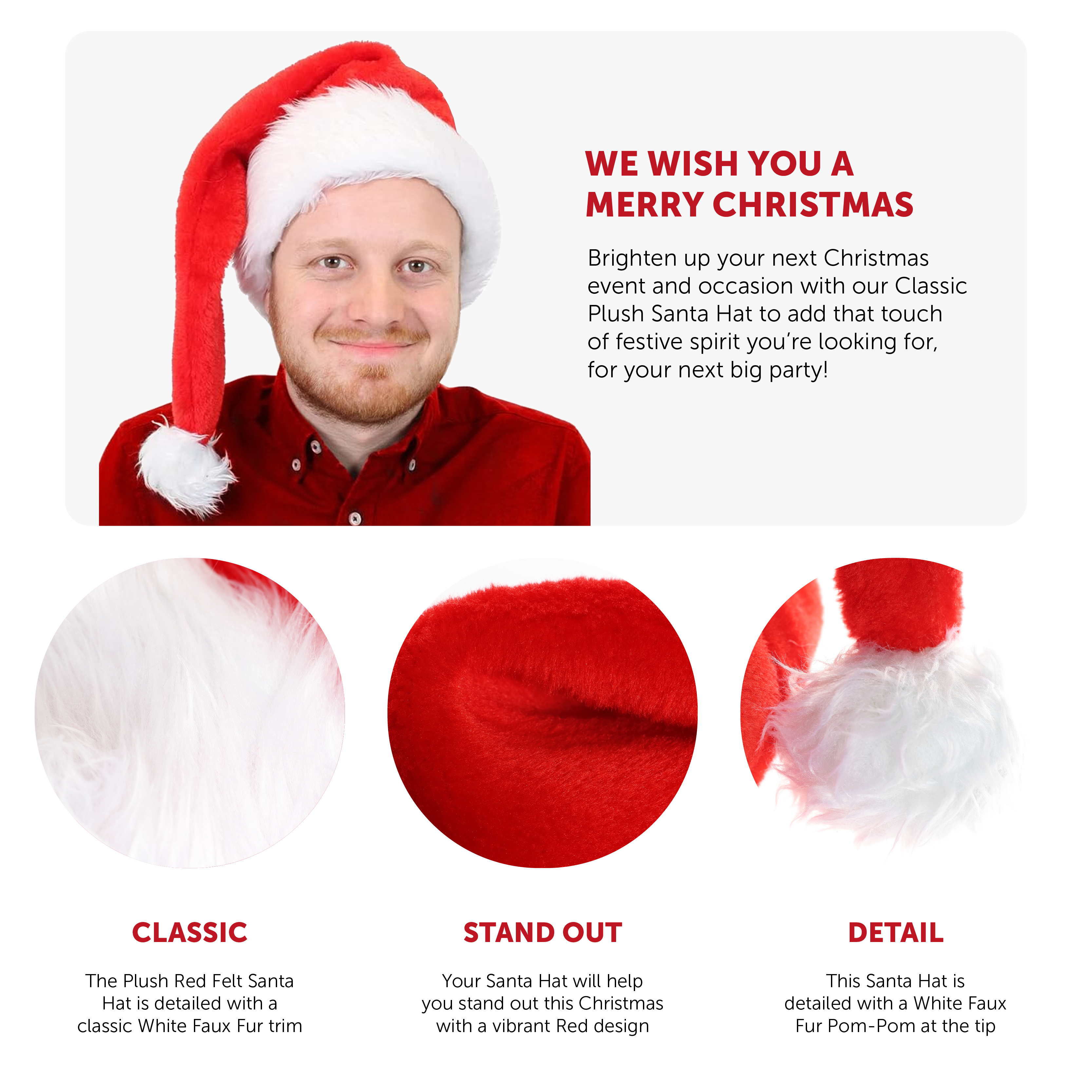 CLASSIC PLUSH SANTA HAT: Brighten up your next Christmas event and occasion with our Classic Plush Santa Hat to add that touch of festive spirit you’re looking for, for your next big party!