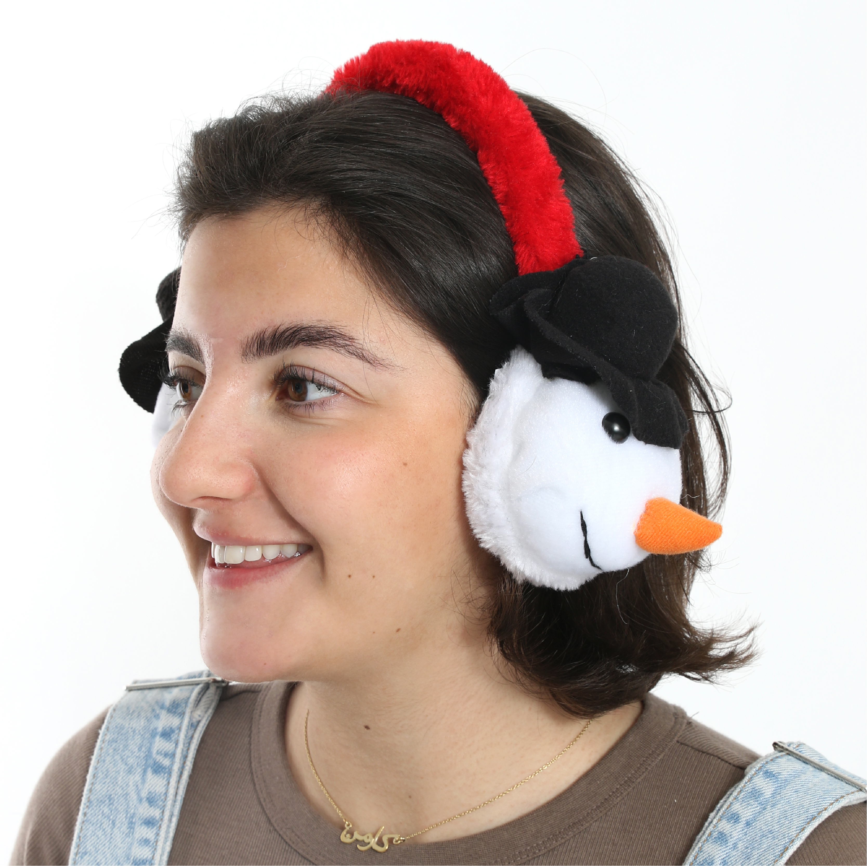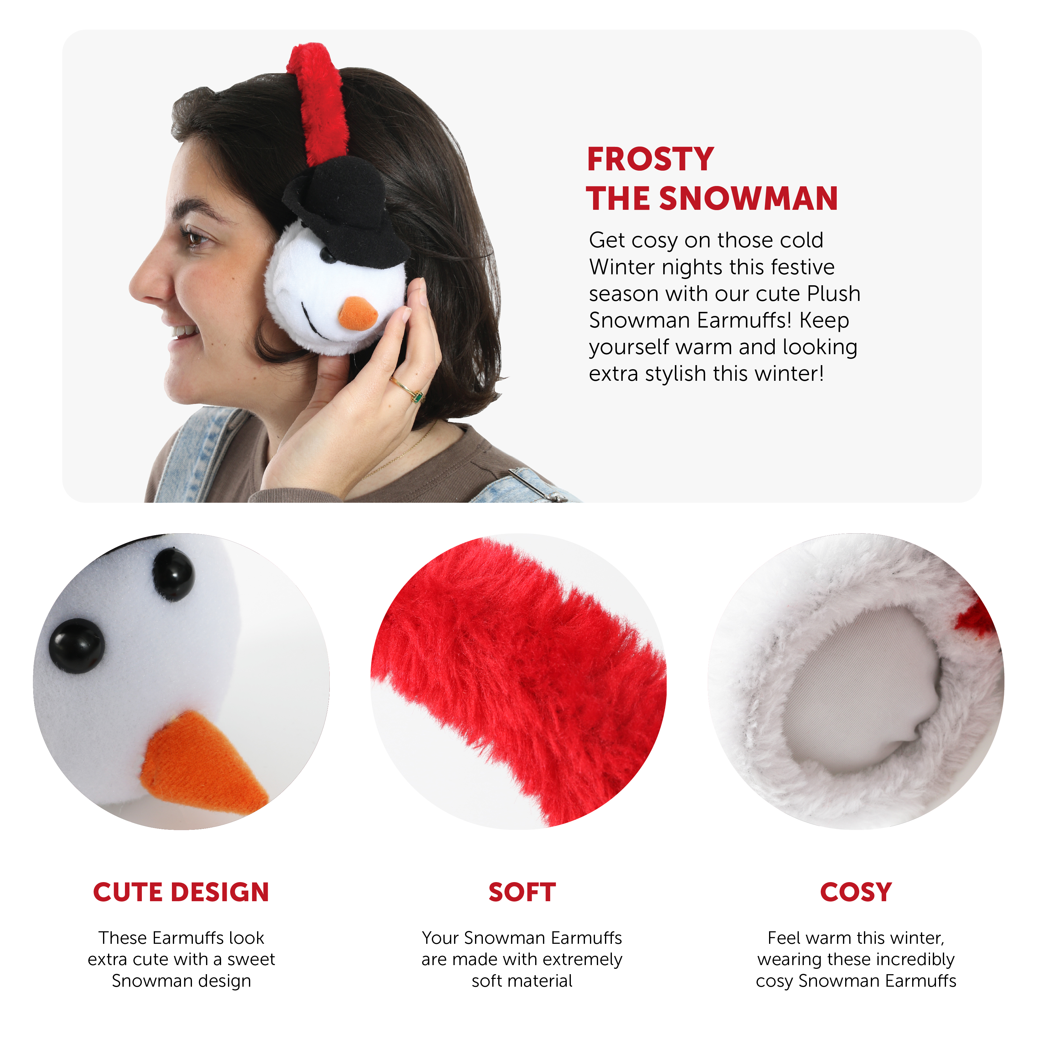 EARMUFF DETAILS: These Earmuffs are extremely soft, detailed with White Snowmen Heads on either side, both with a Black Top Hat and Orange Carrot Nose, a great way to keep yourself warm!