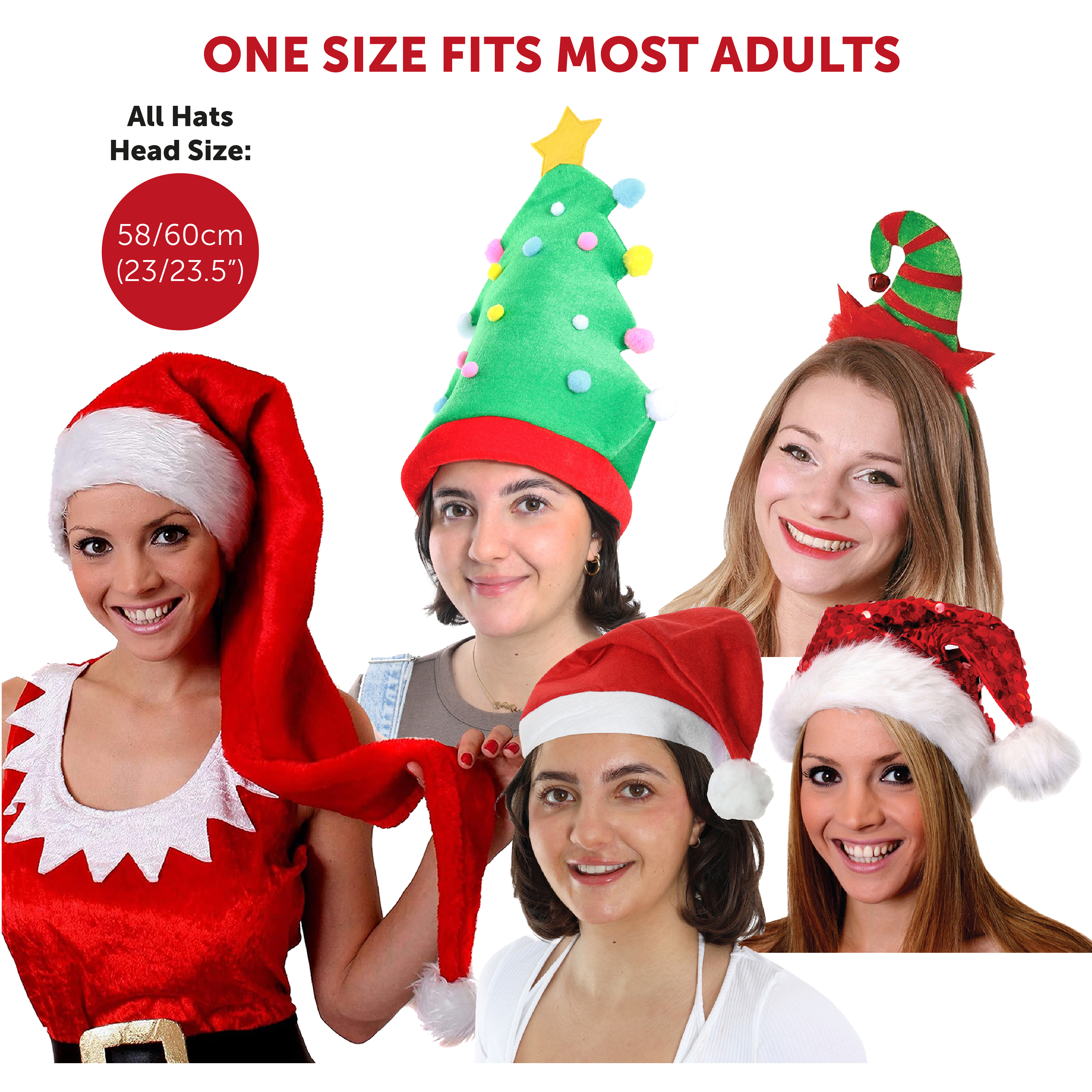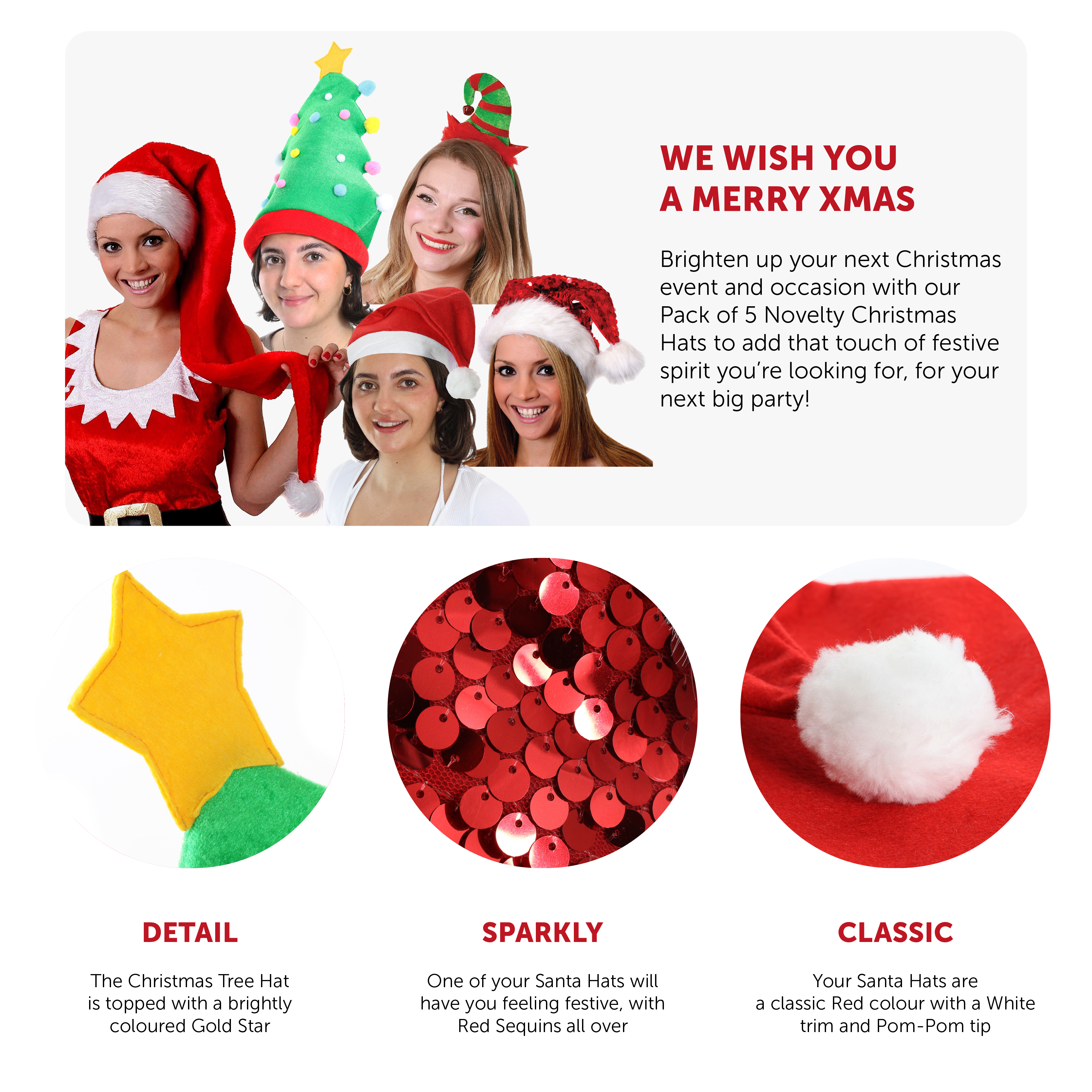 HAT SET INCLUDES: Your Christmas Hat Set includes 5x different Novelty Hats including, 1x Classic Long Red Santa Hat with White trim detail, 1x Plush Green Christmas Tree Hat with colourful Pom-Pom detail and a Gold Star on top, 1x Mini Green and Red Striped Elf Hat Headband with a Jingle Bell detail, 1x Classic style Red Sequin covered Santa Hat with White trim detail, and 1x Classic Red and White Felt Santa Hat!